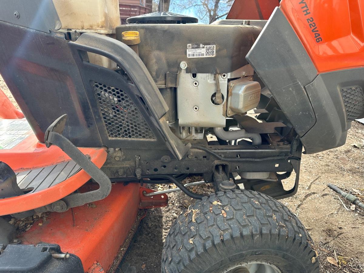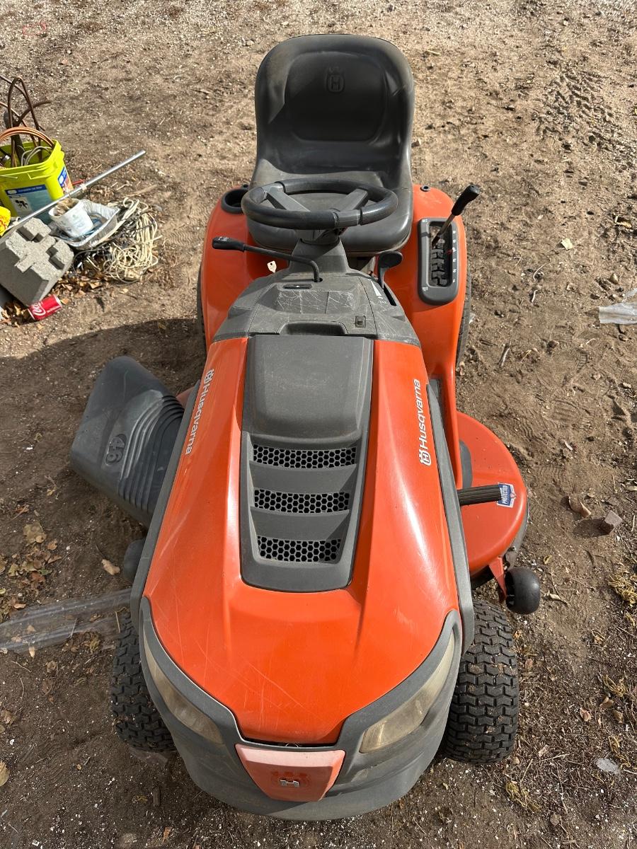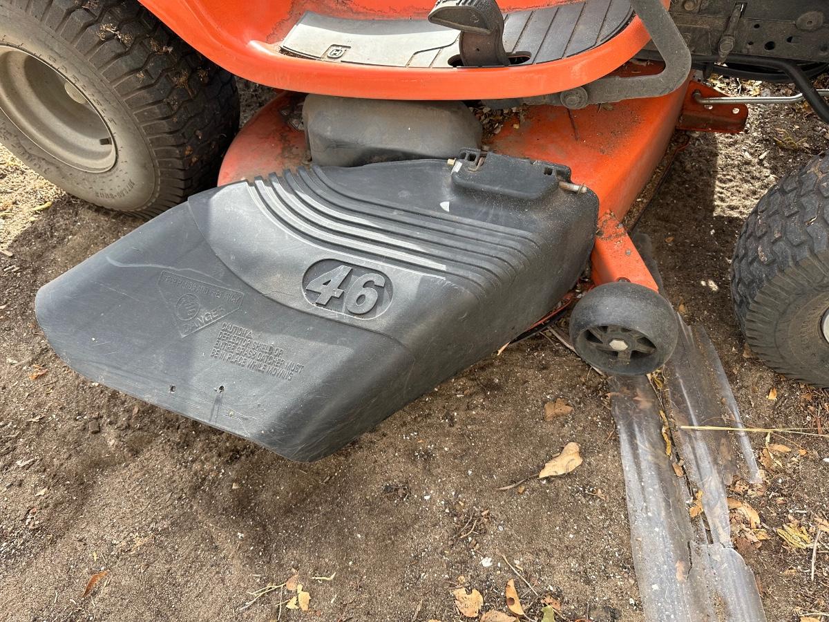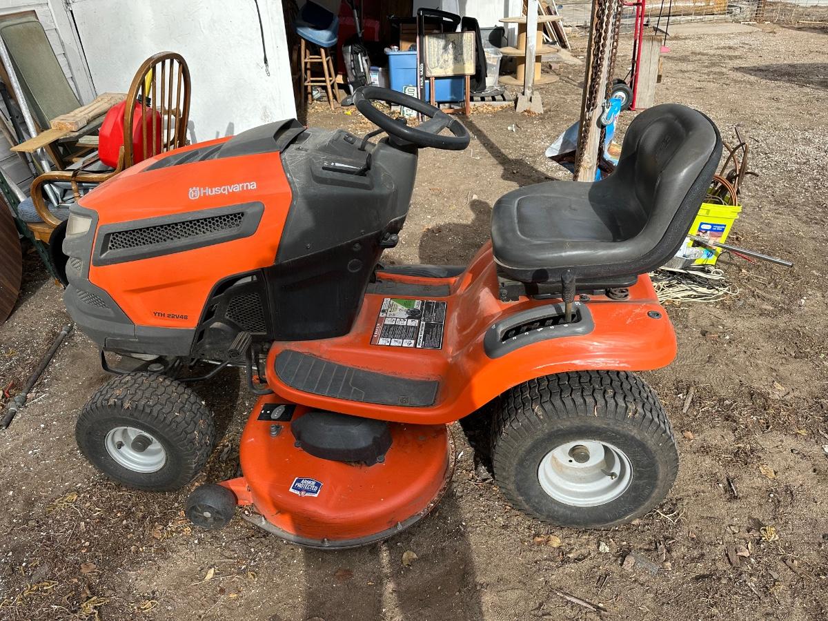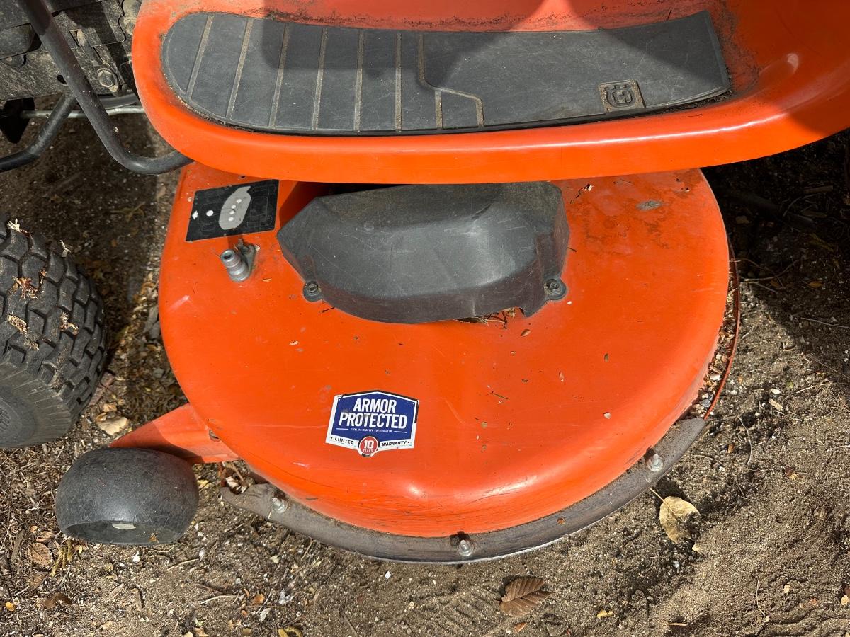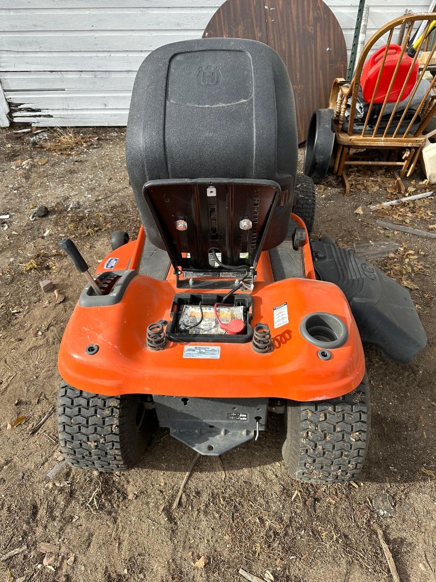 Husqvarna YTH22V46 riding lawnmower. It is in good condition with a few small cracks on the seat (see picture). This lawnmower has air induction mowing technology for excellent cutting performance. Has cruise control, pedal-operated hydrostatic transmission, fender-mounted cutting height adjustment, adjustable sliding seat when seated, dual draglinks, deck wash port, ergonomic steering wheel, safety switch under the seat, reverse operating system for safety, manual blade engagement, easy-access fuel cap, high back seat, reinforced cutting deck, headlights, powder coated cutting deck, cup holder, cast iron front axle for superior steering, anti scalp wheels and much more. See pictures for specifications on this lawnmower.