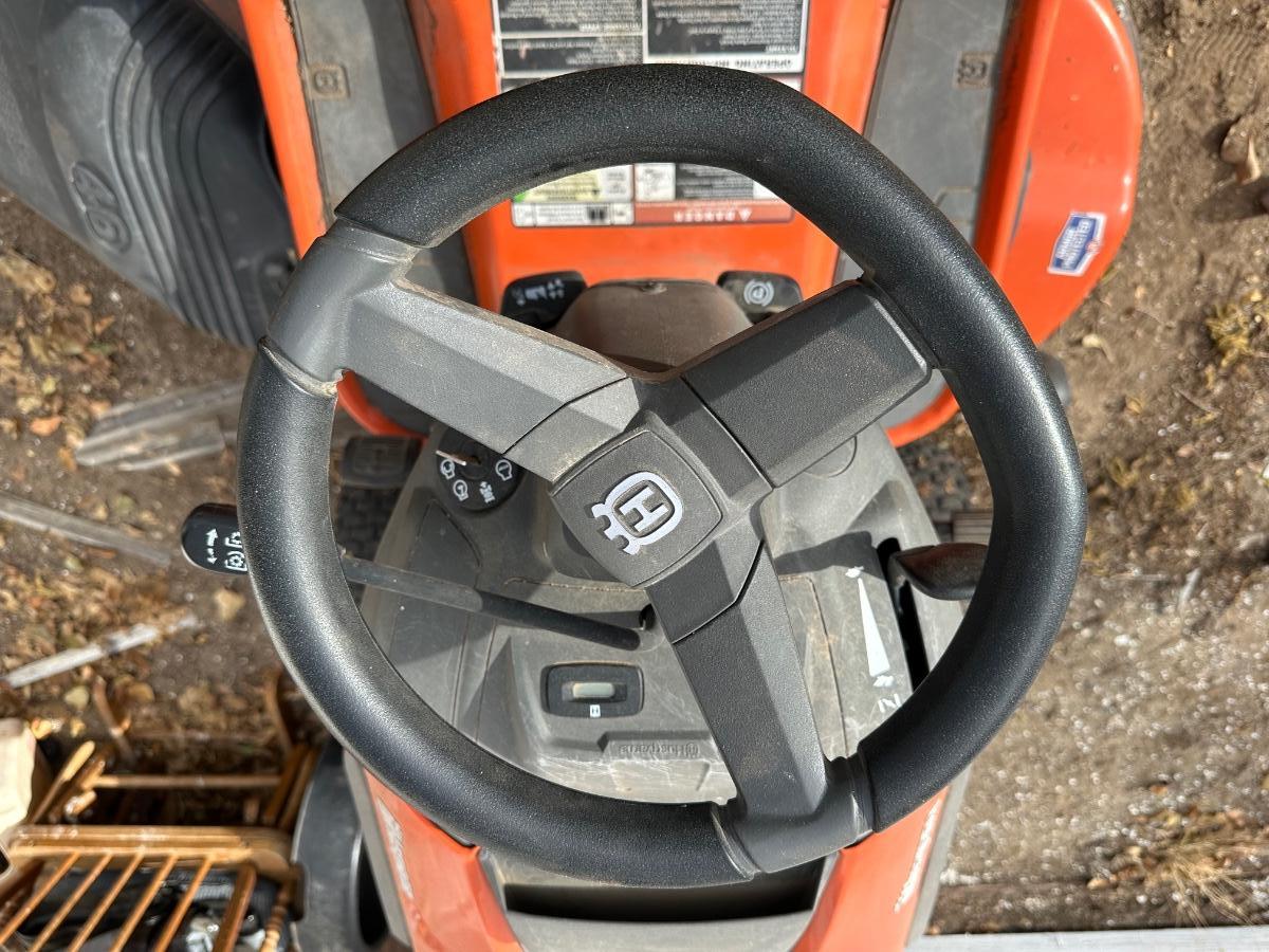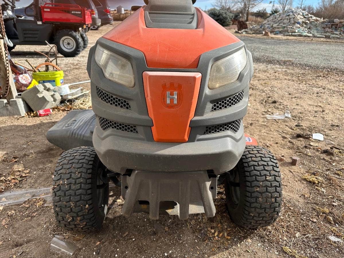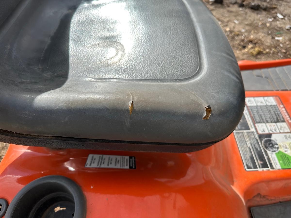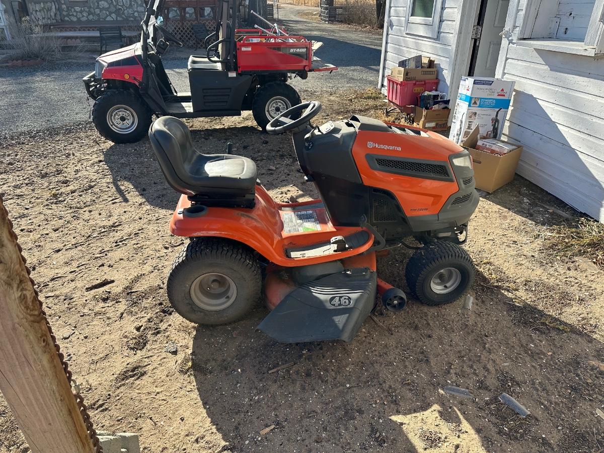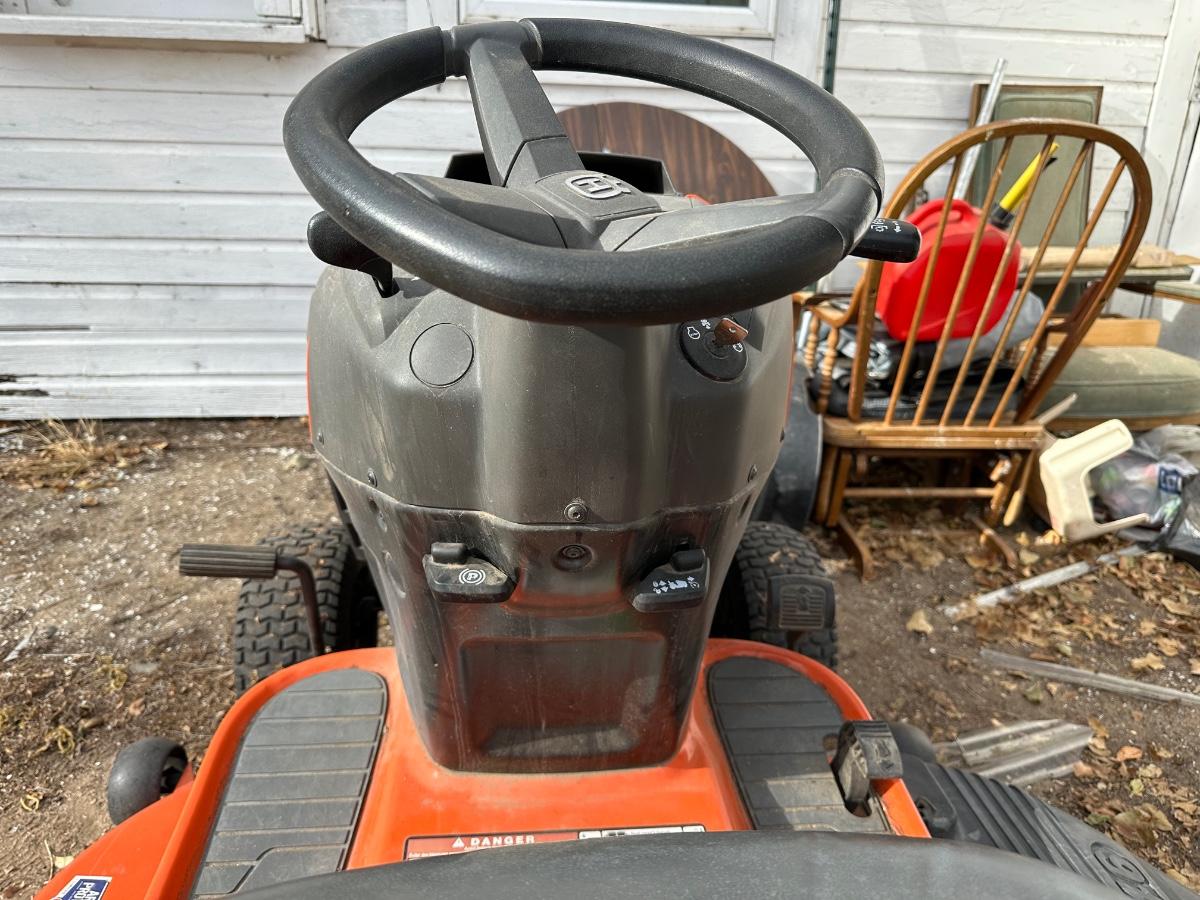 Husqvarna YTH22V46 riding lawnmower. It is in good condition with a few small cracks on the seat (see picture). This lawnmower has air induction mowing technology for excellent cutting performance. Has cruise control, pedal-operated hydrostatic transmission, fender-mounted cutting height adjustment, adjustable sliding seat when seated, dual draglinks, deck wash port, ergonomic steering wheel, safety switch under the seat, reverse operating system for safety, manual blade engagement, easy-access fuel cap, high back seat, reinforced cutting deck, headlights, powder coated cutting deck, cup holder, cast iron front axle for superior steering, anti scalp wheels and much more. See pictures for specifications on this lawnmower.