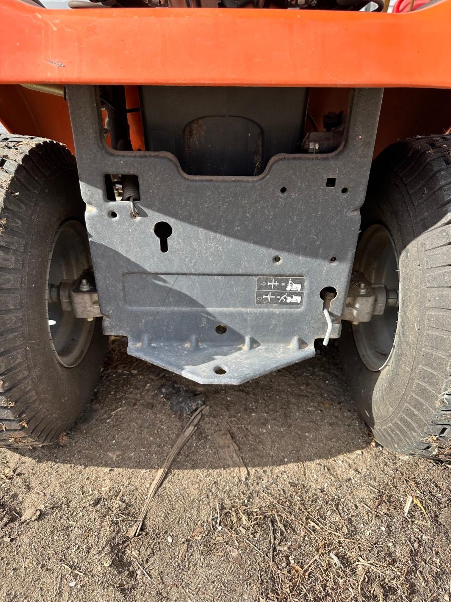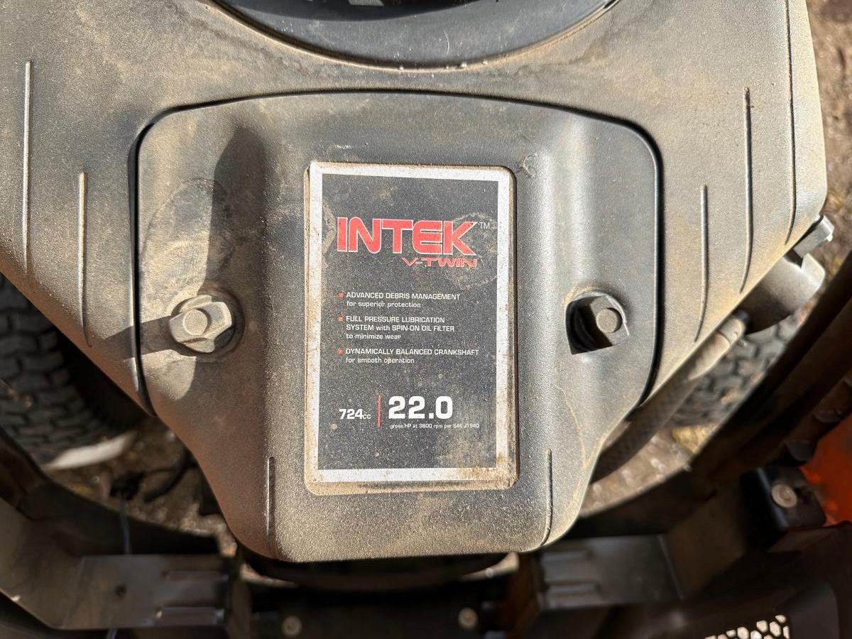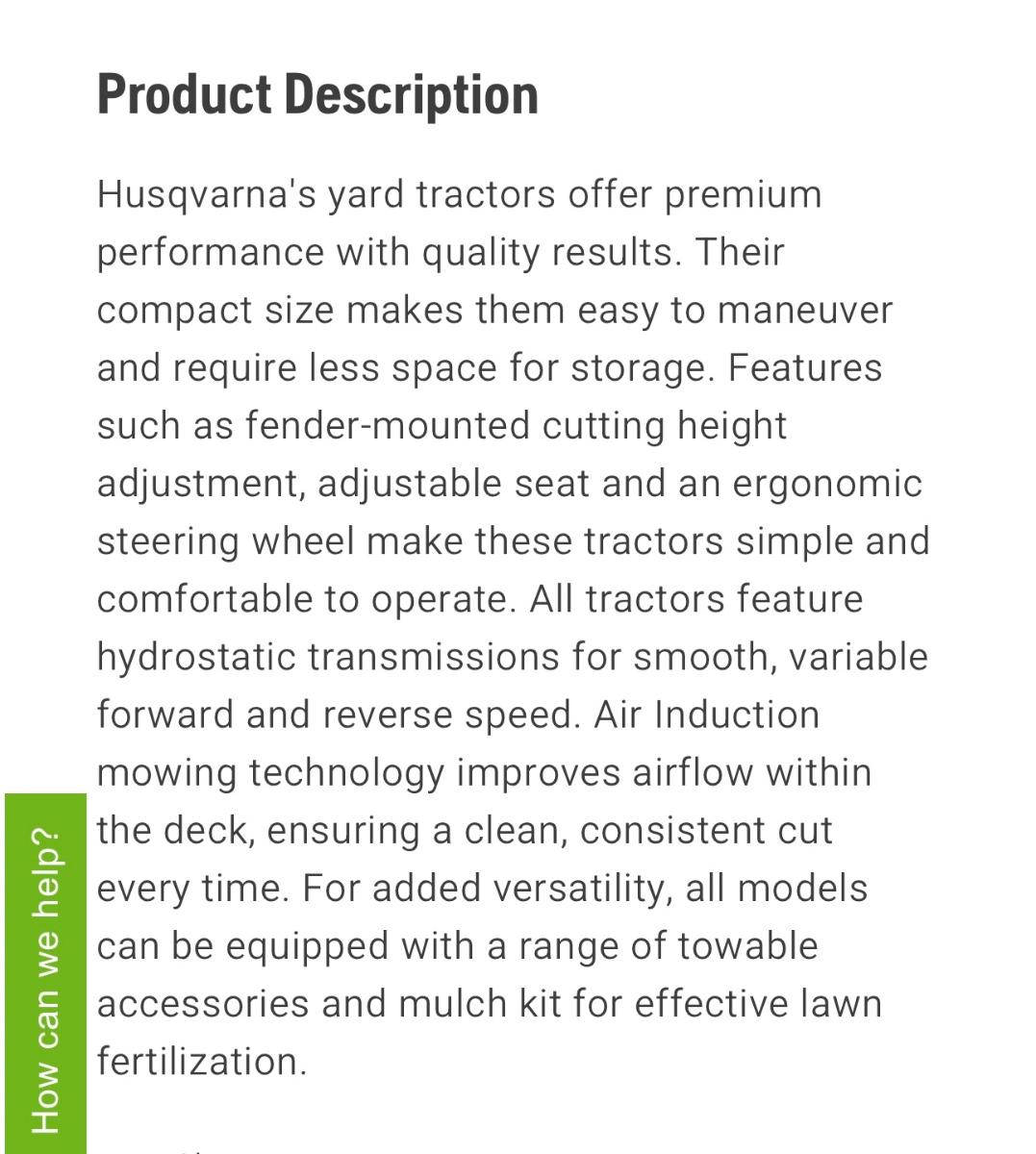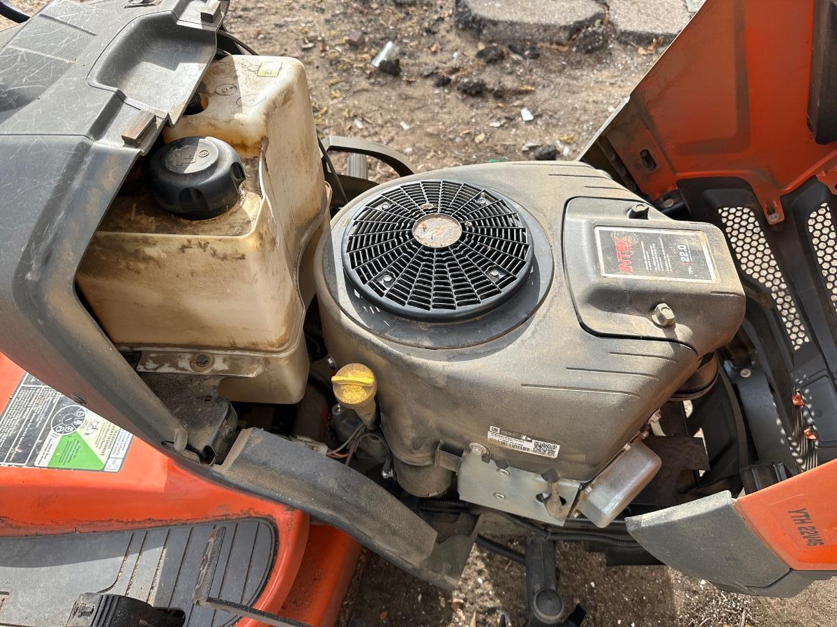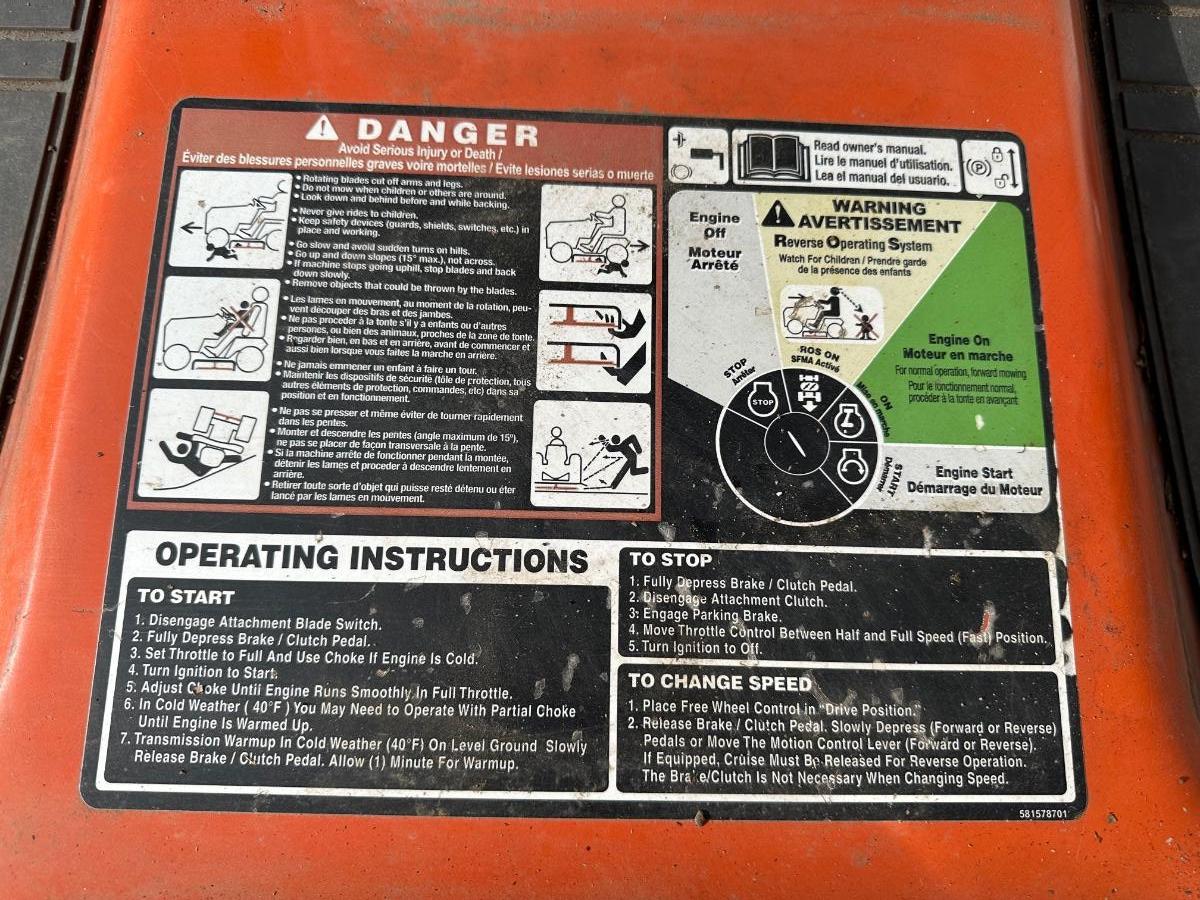Husqvarna YTH22V46 riding lawnmower. It is in good condition with a few small cracks on the seat (see picture). This lawnmower has air induction mowing technology for excellent cutting performance. Has cruise control, pedal-operated hydrostatic transmission, fender-mounted cutting height adjustment, adjustable sliding seat when seated, dual draglinks, deck wash port, ergonomic steering wheel, safety switch under the seat, reverse operating system for safety, manual blade engagement, easy-access fuel cap, high back seat, reinforced cutting deck, headlights, powder coated cutting deck, cup holder, cast iron front axle for superior steering, anti scalp wheels and much more. See pictures for specifications on this lawnmower.