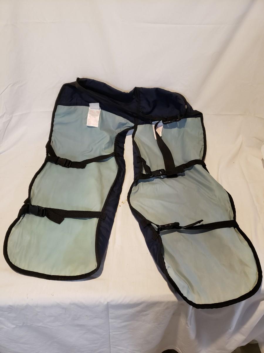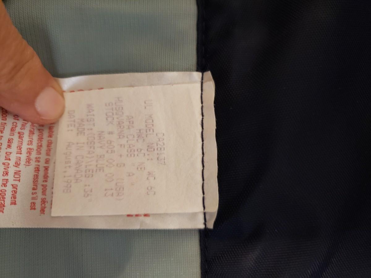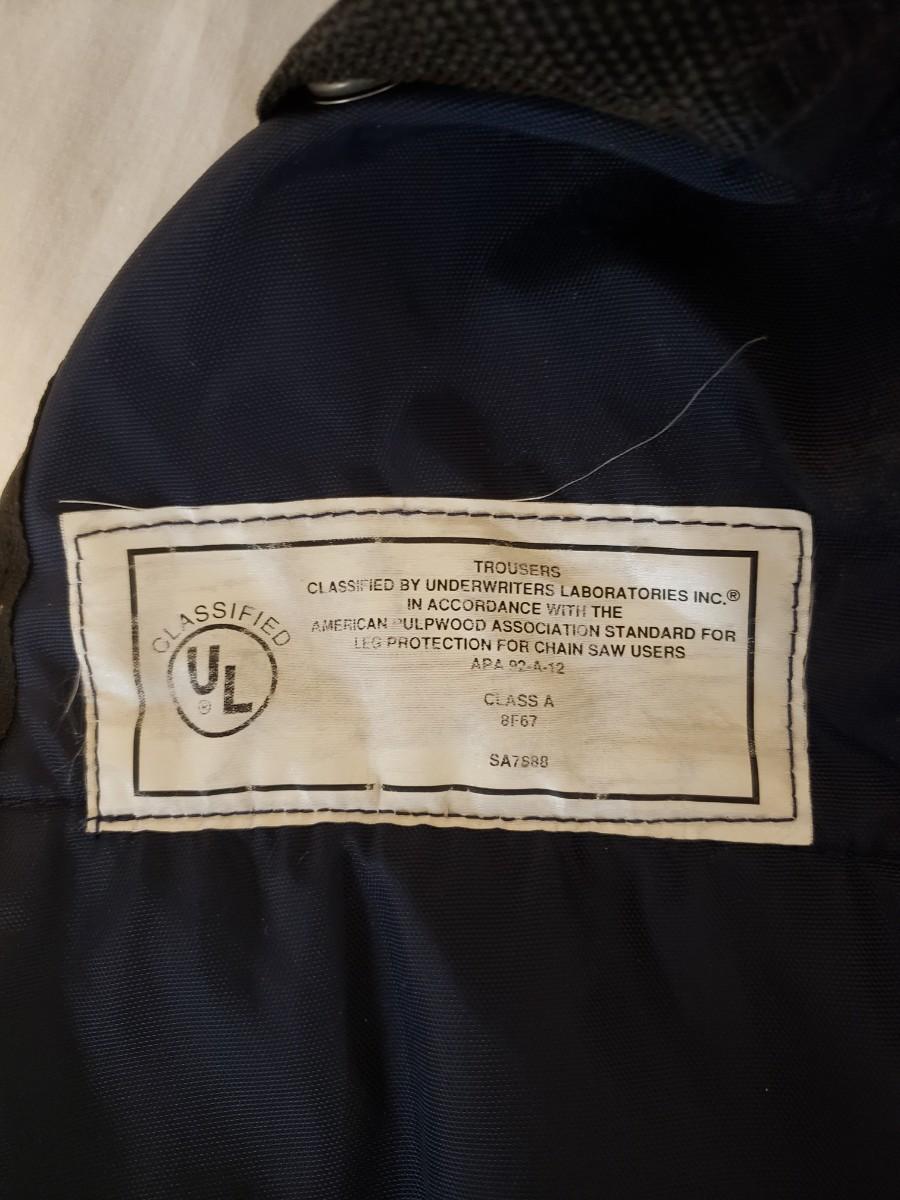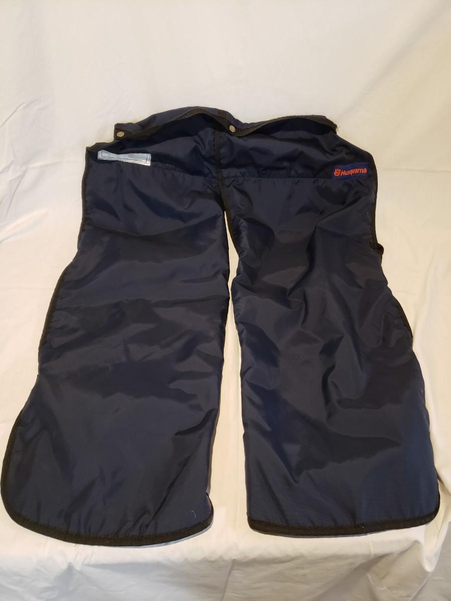 This lot is a pair of Husqvarna padded chain saw trousers. They are model WC-6C, class A trousers. They attach to your waist and the back of your legs by black clips as seen in the pictures. The tags did not have a size on them but estimate they are on the smaller size.. Shipping available.