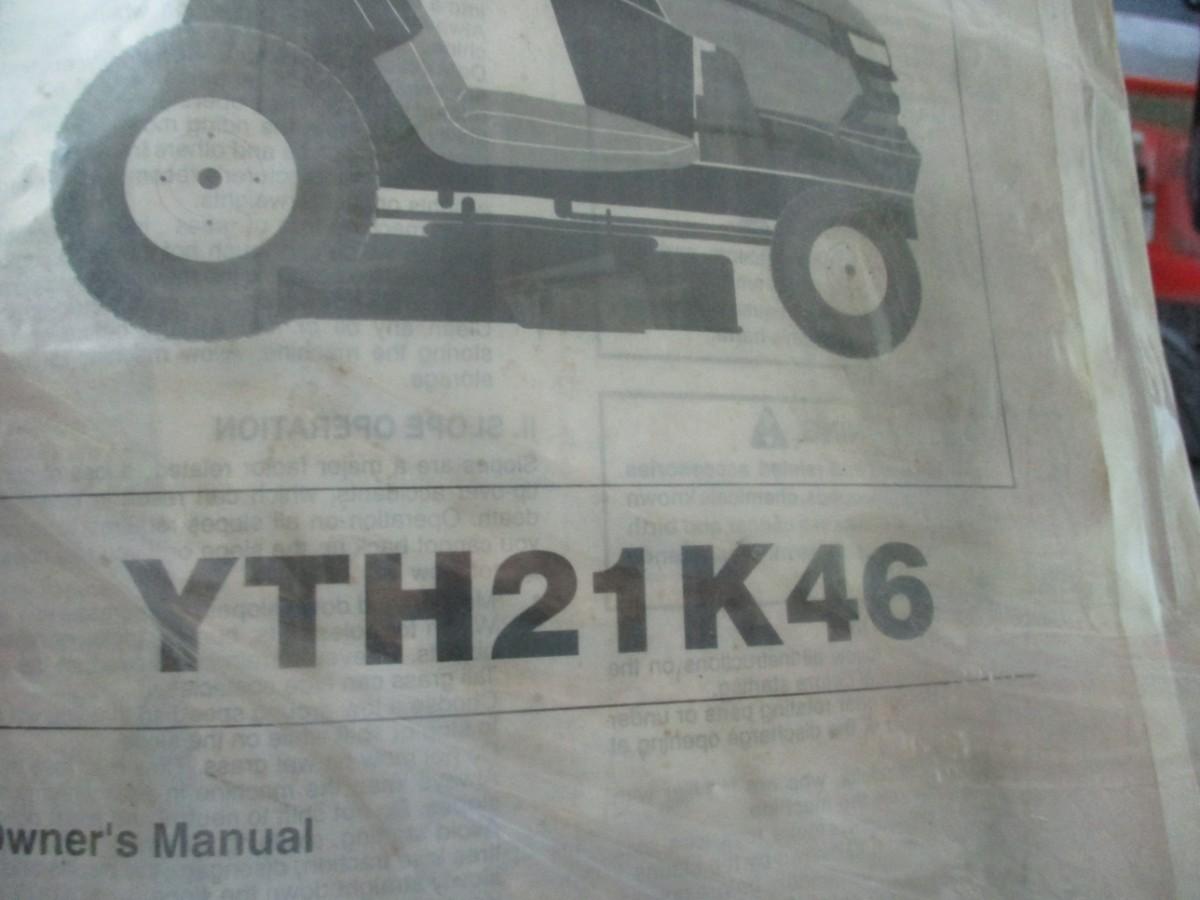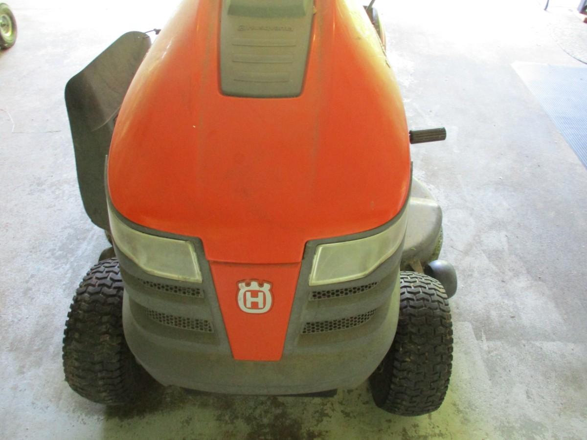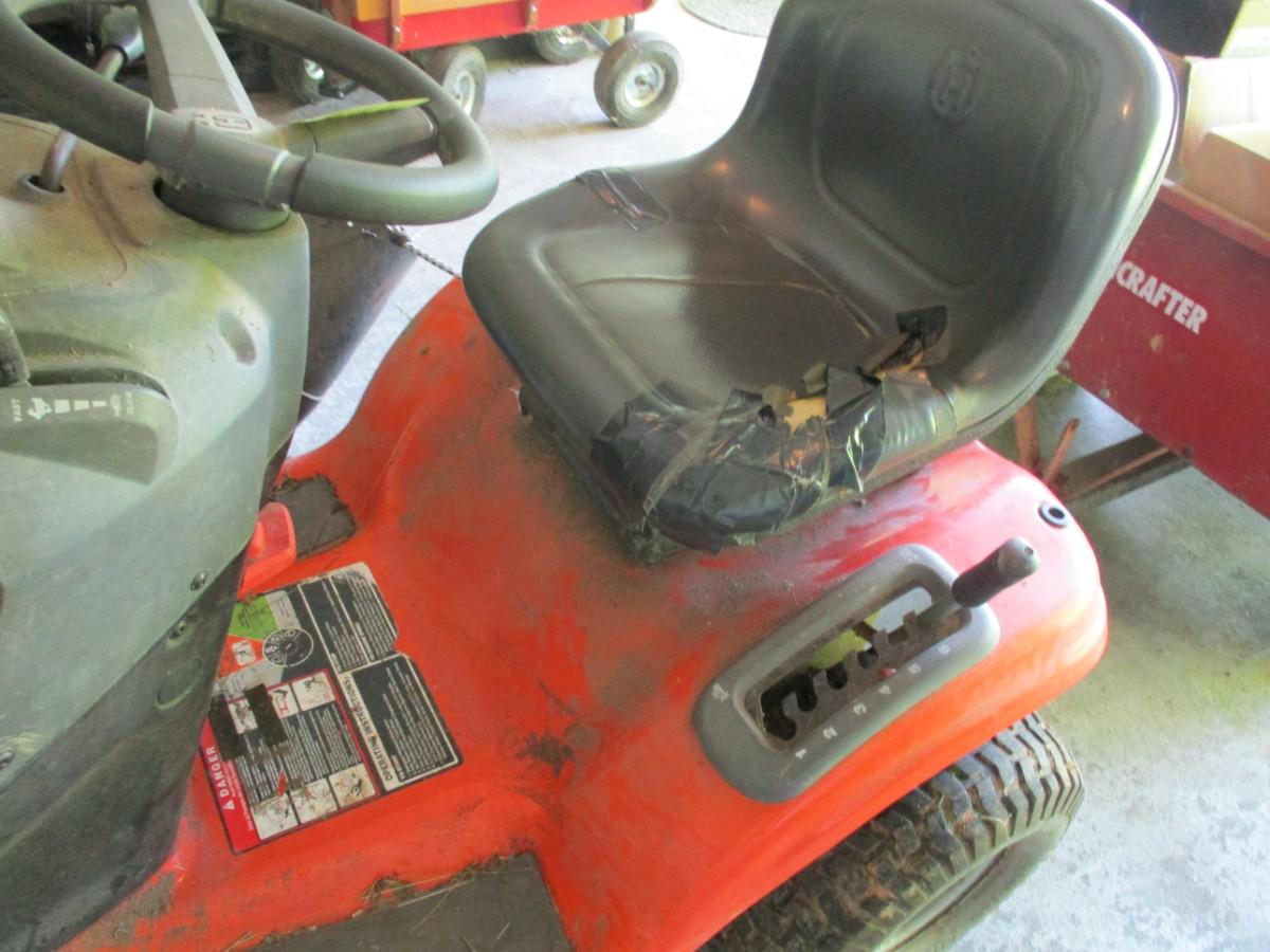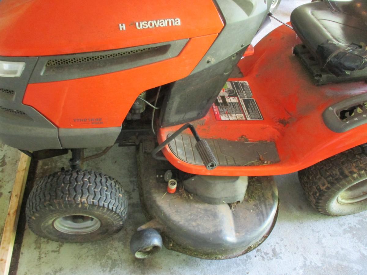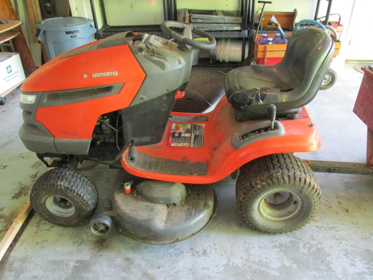Husqvarna Lawn Mower YTH21K46 tractor seems to be in working order. Needs new seat. The deck spindle bearings may need replacing soon.