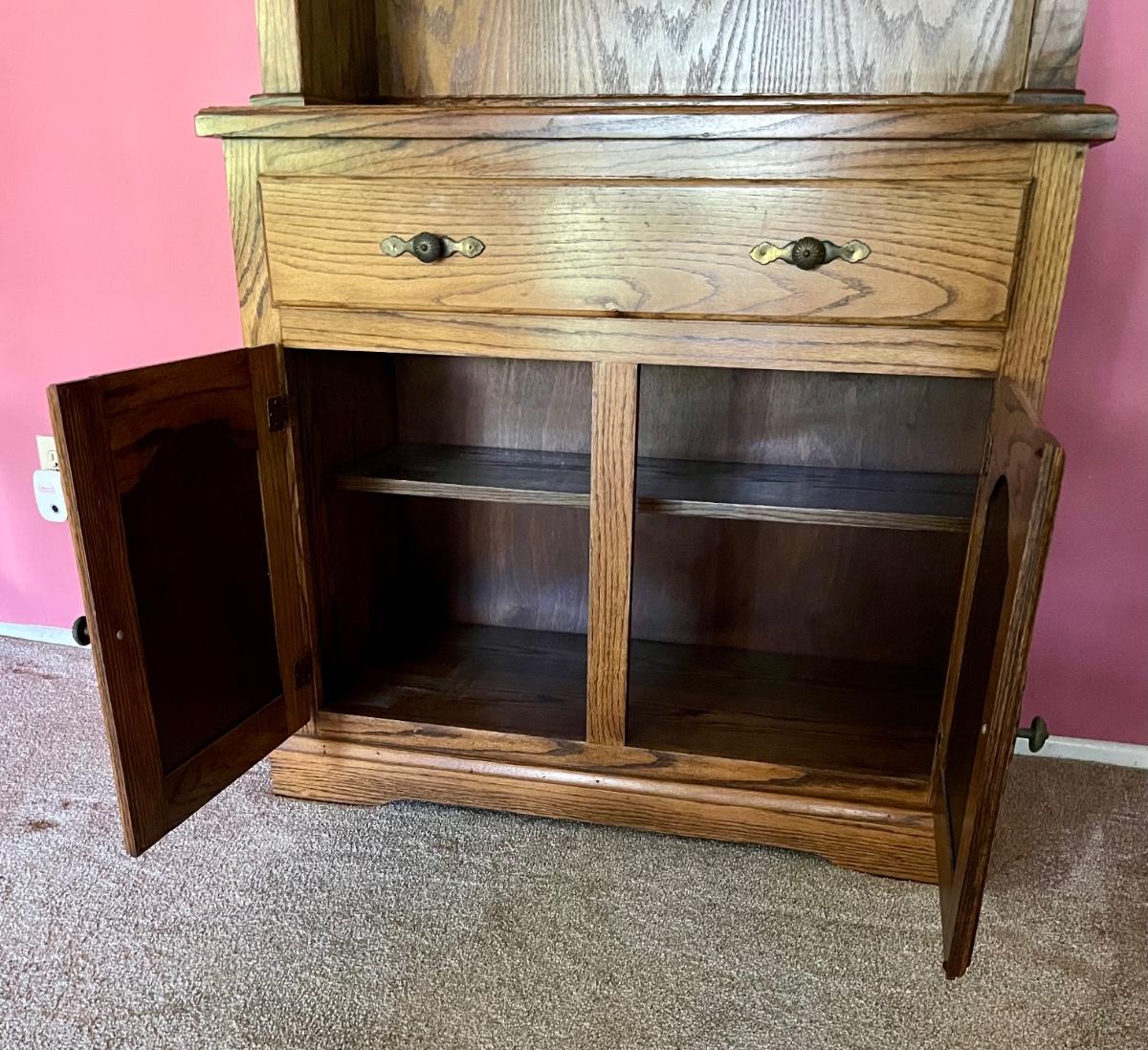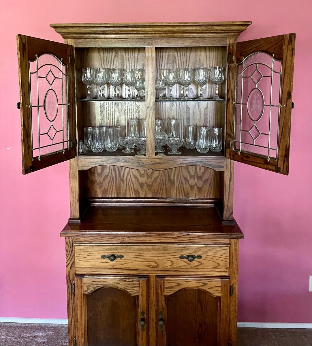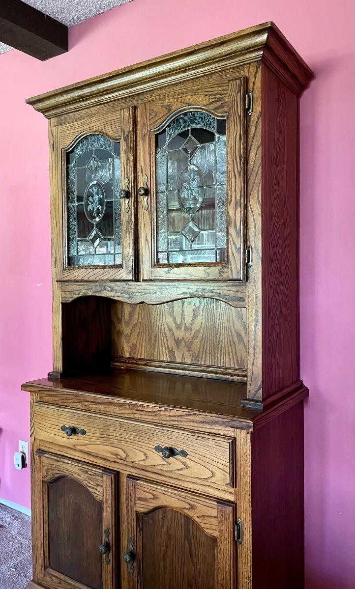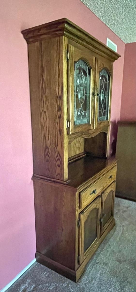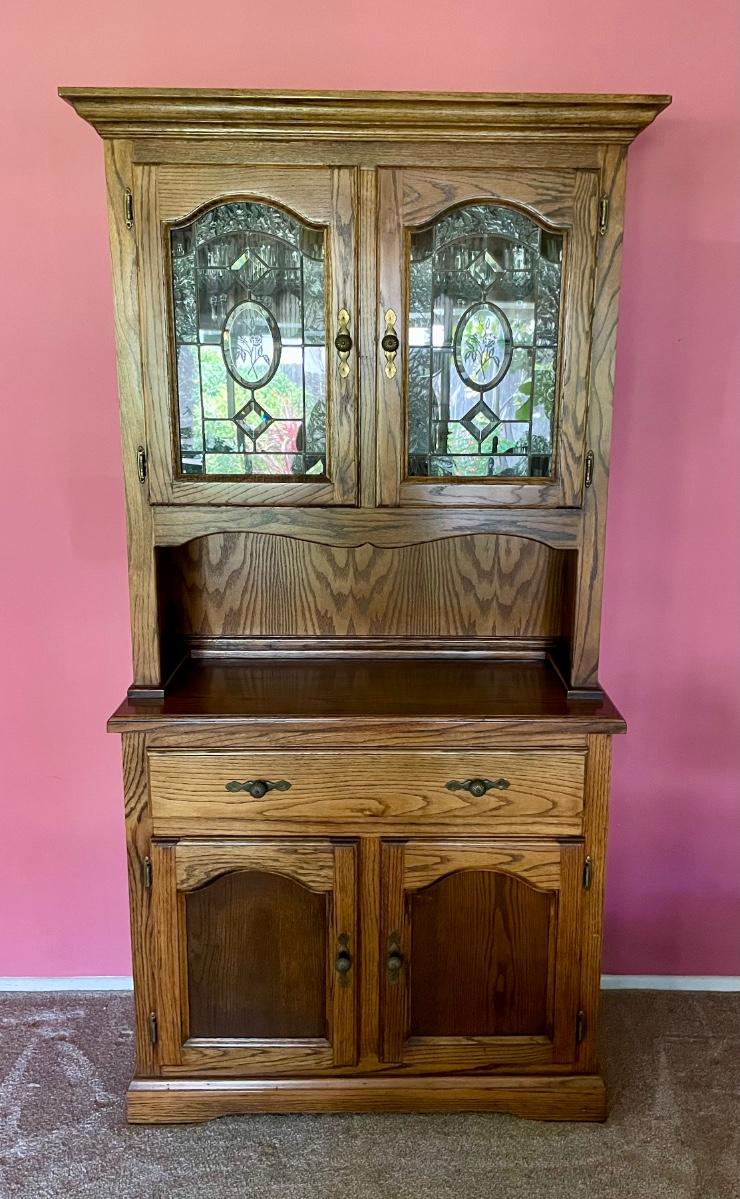 Oak China Hutch with leaded glass doors. Very good condition. 76” x 38” x 18”.