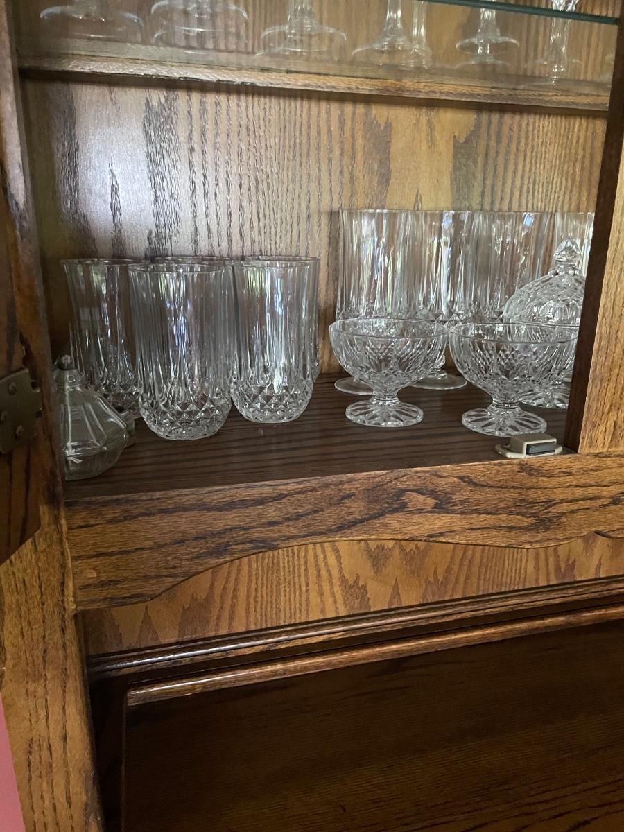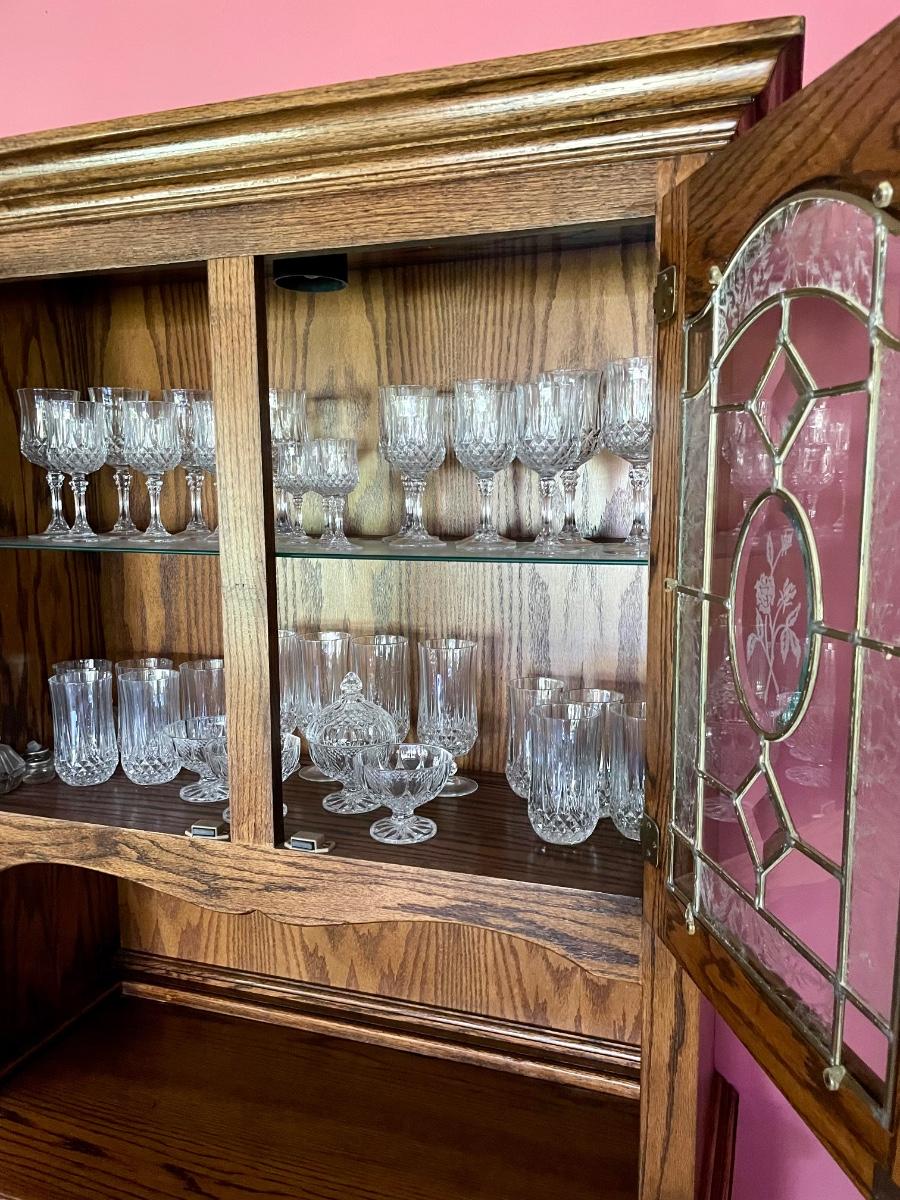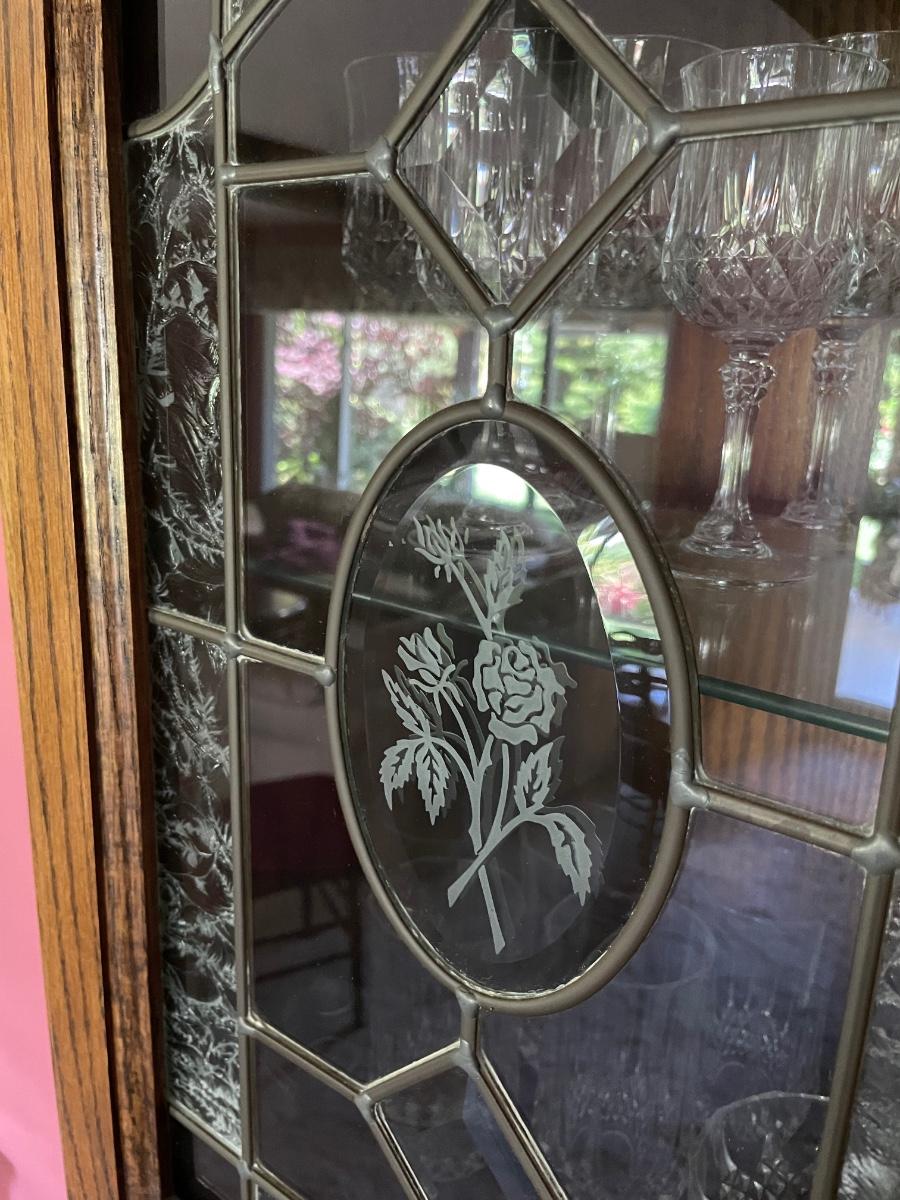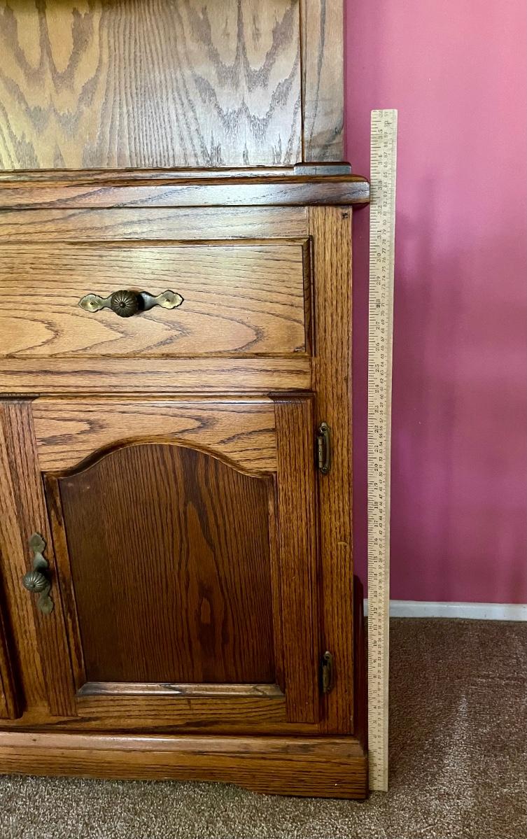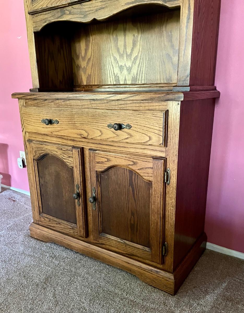 Oak China Hutch with leaded glass doors. Very good condition. 76” x 38” x 18”.