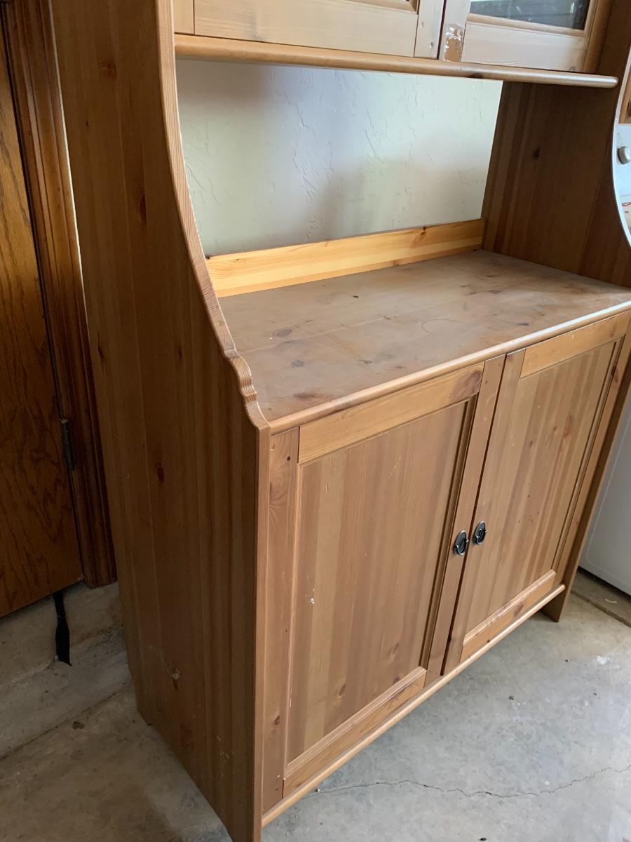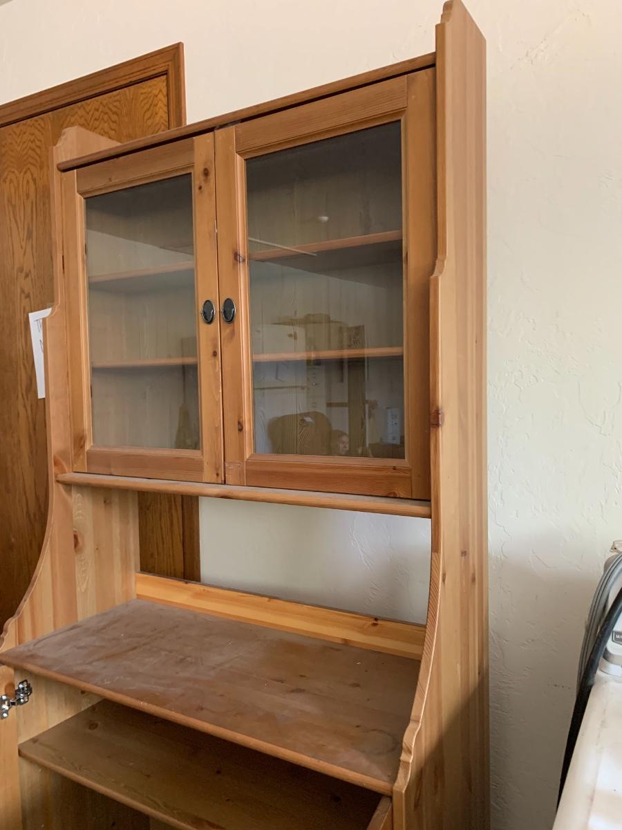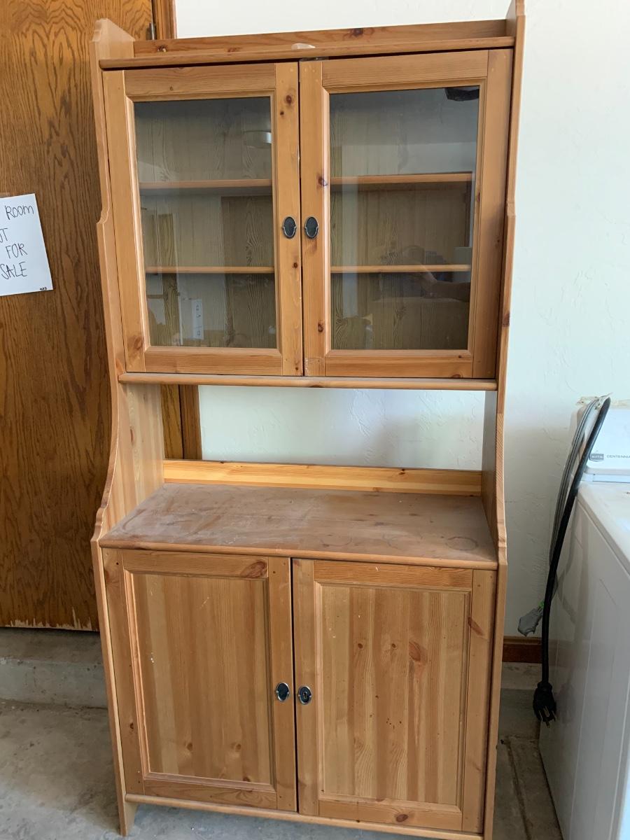 Hutch in fair condition (6 1/2 feet in height, 3 feet and 1/2 inch in width, 16 inches in depth). Has tape and tape residue on the cabinet doors.