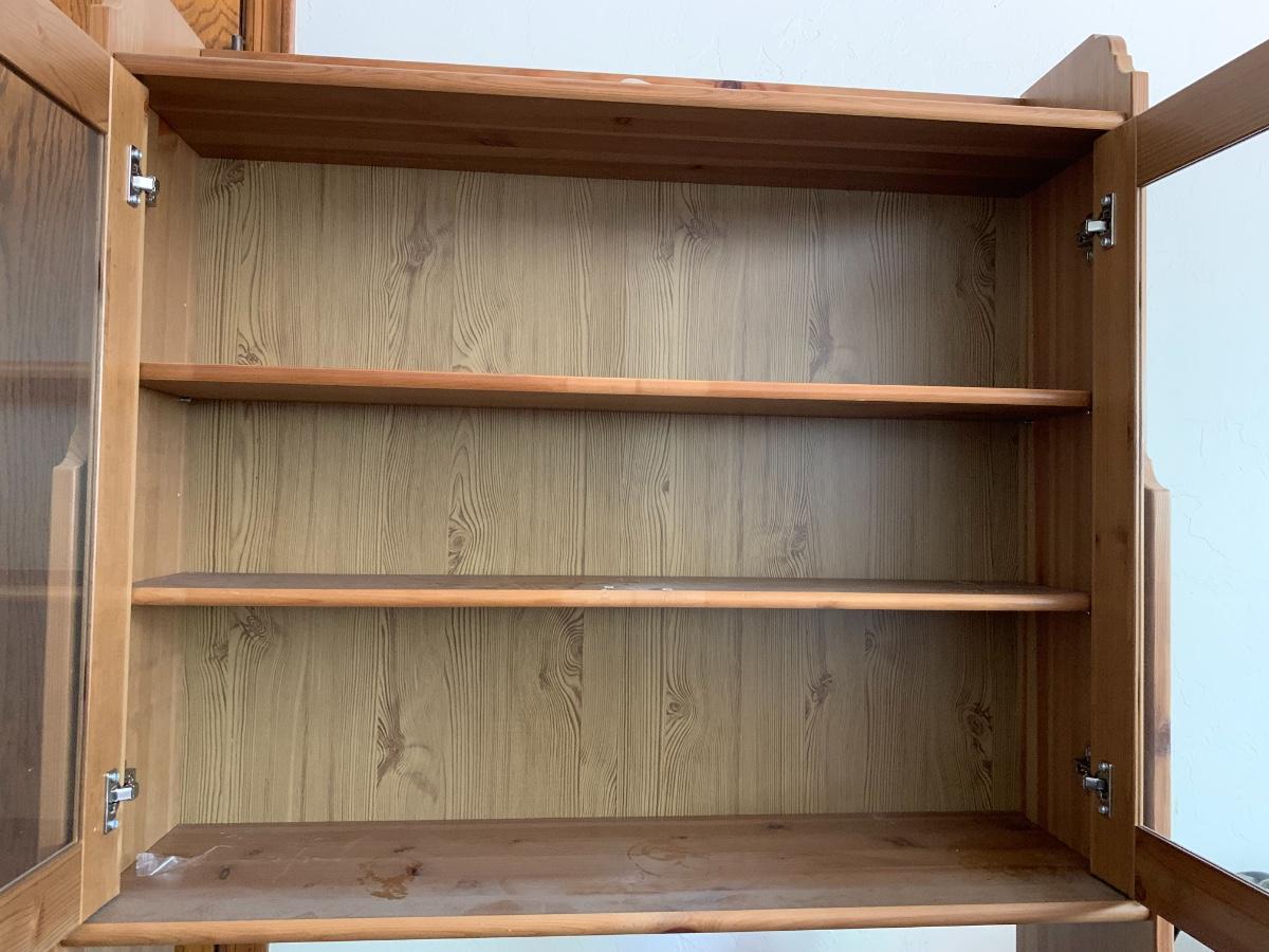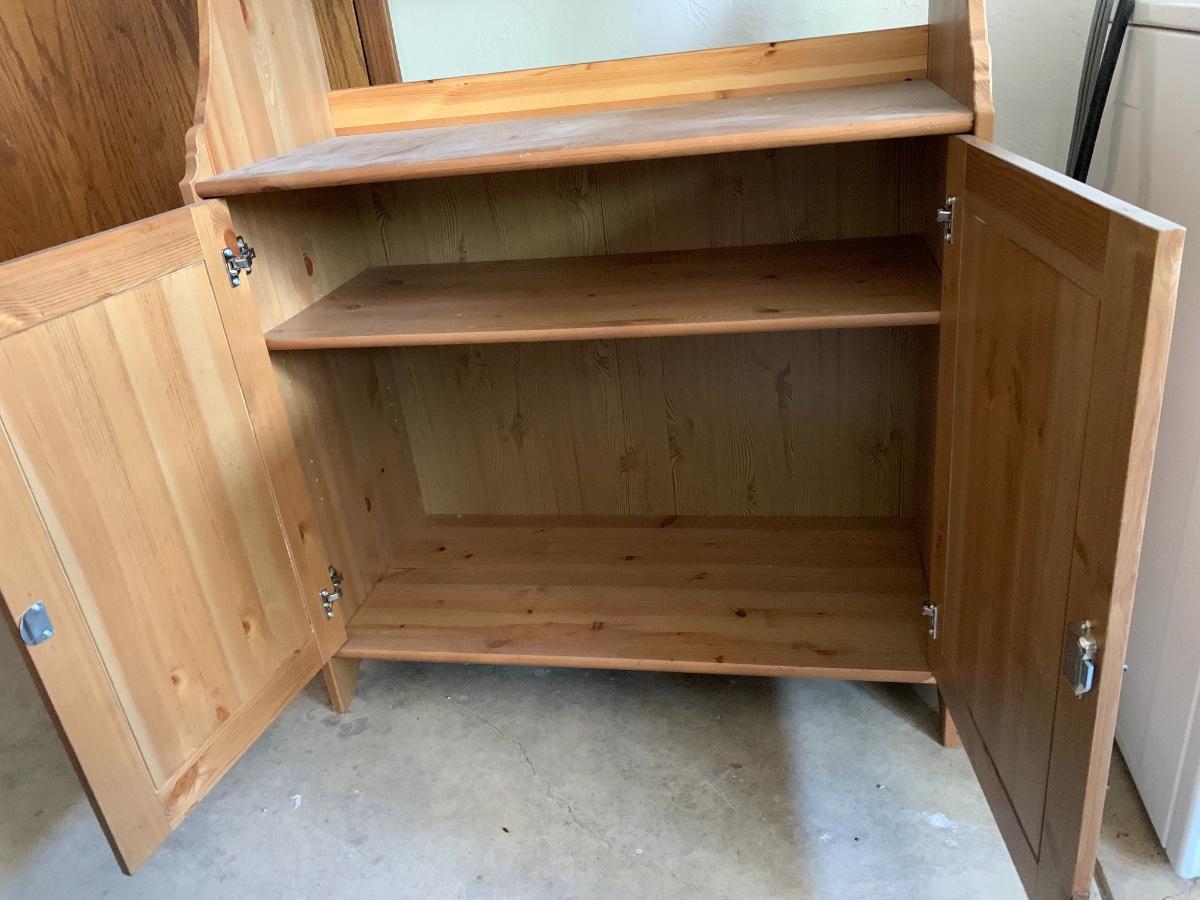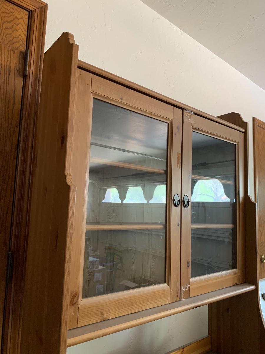 Hutch in fair condition (6 1/2 feet in height, 3 feet and 1/2 inch in width, 16 inches in depth). Has tape and tape residue on the cabinet doors.