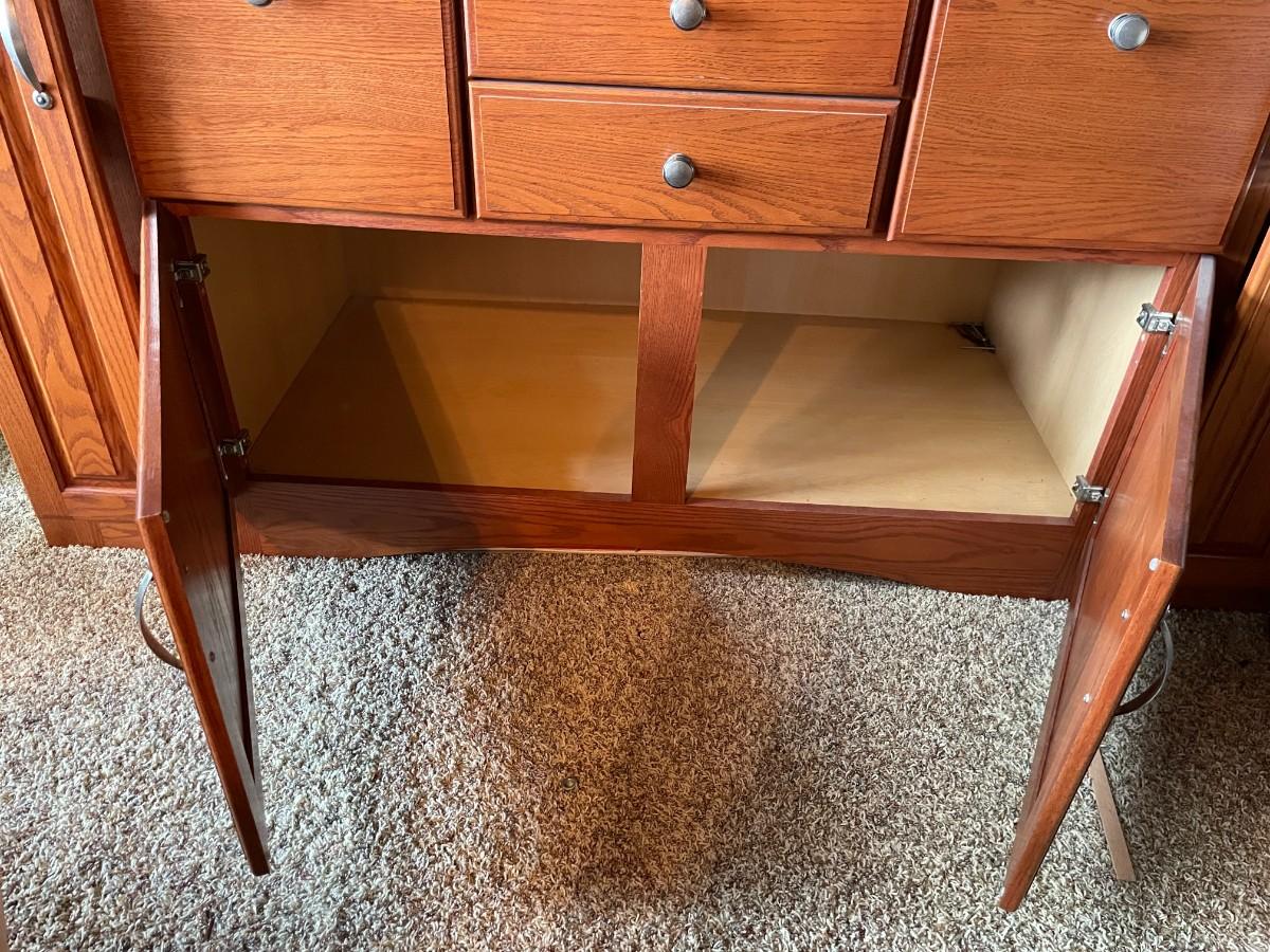 This 2-piece hutch has plenty of storage and a wine rack. Beautifully maintained. Top section: 70L x 15 1/2w x 57H. Bottom section: 70L x 25W x 36H.