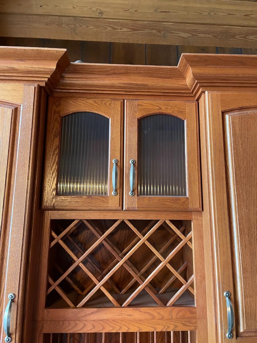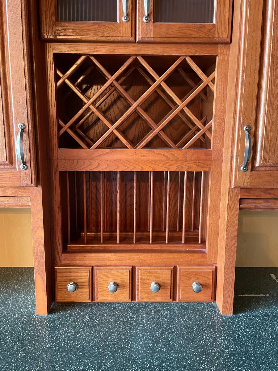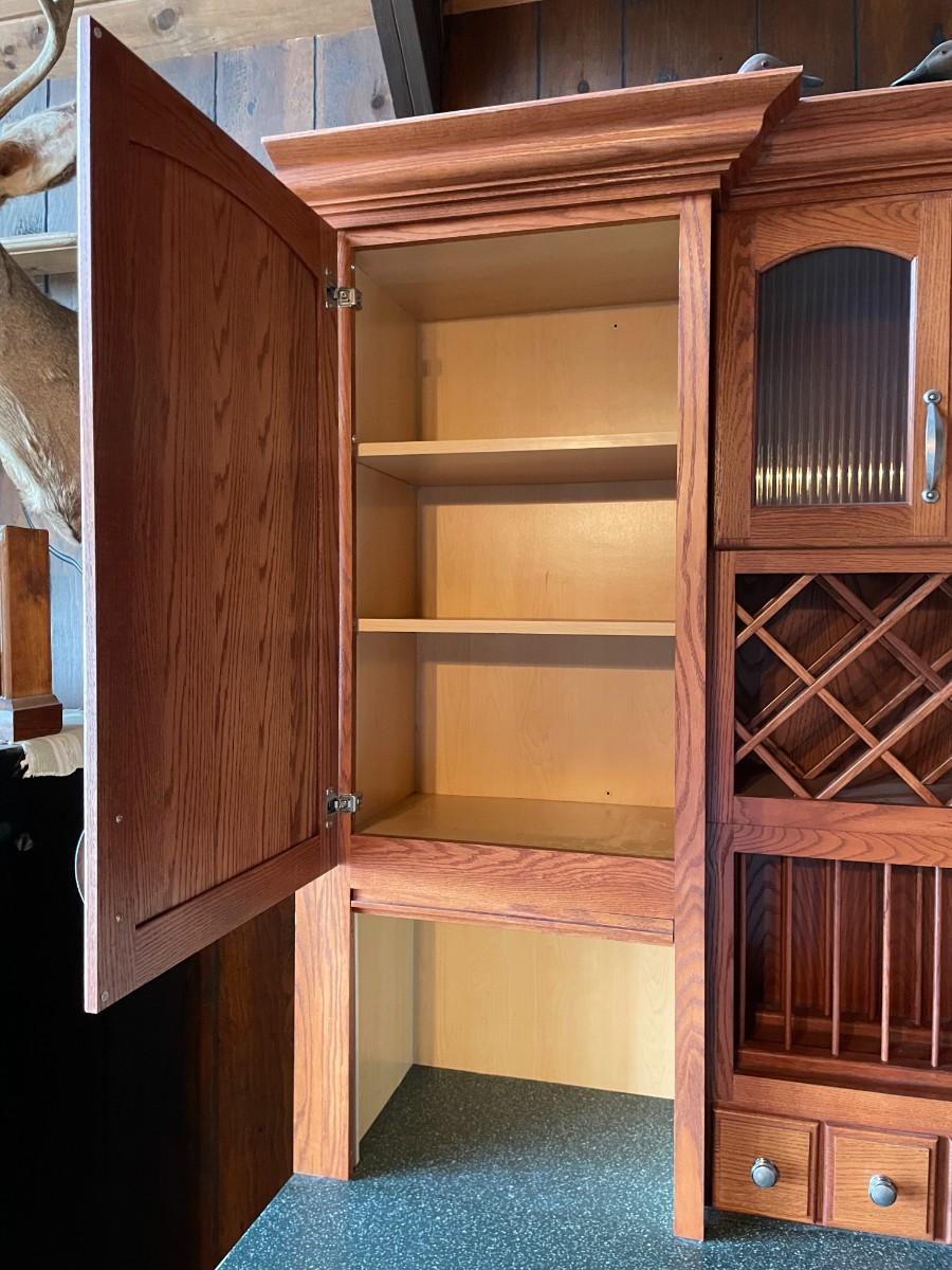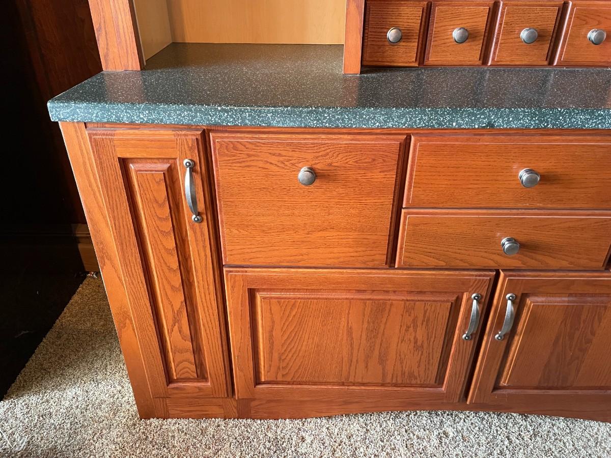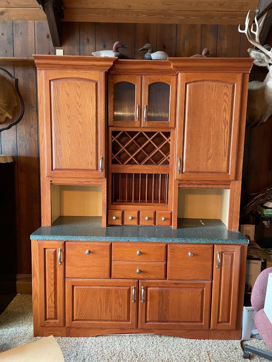 This 2-piece hutch has plenty of storage and a wine rack. Beautifully maintained. Top section: 70L x 15 1/2w x 57H. Bottom section: 70L x 25W x 36H.