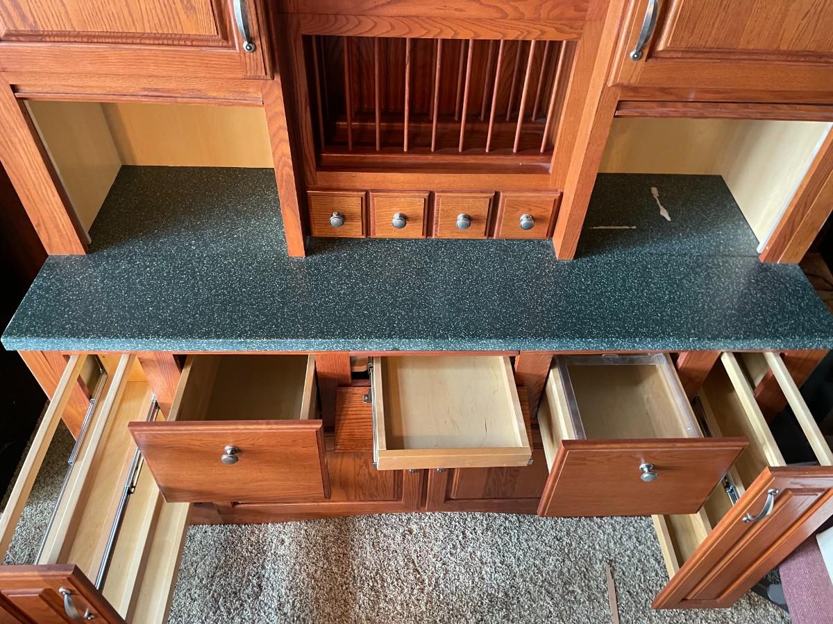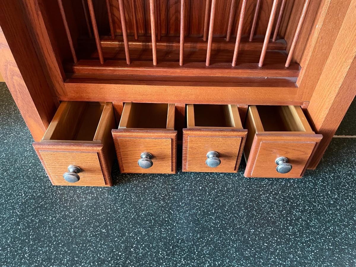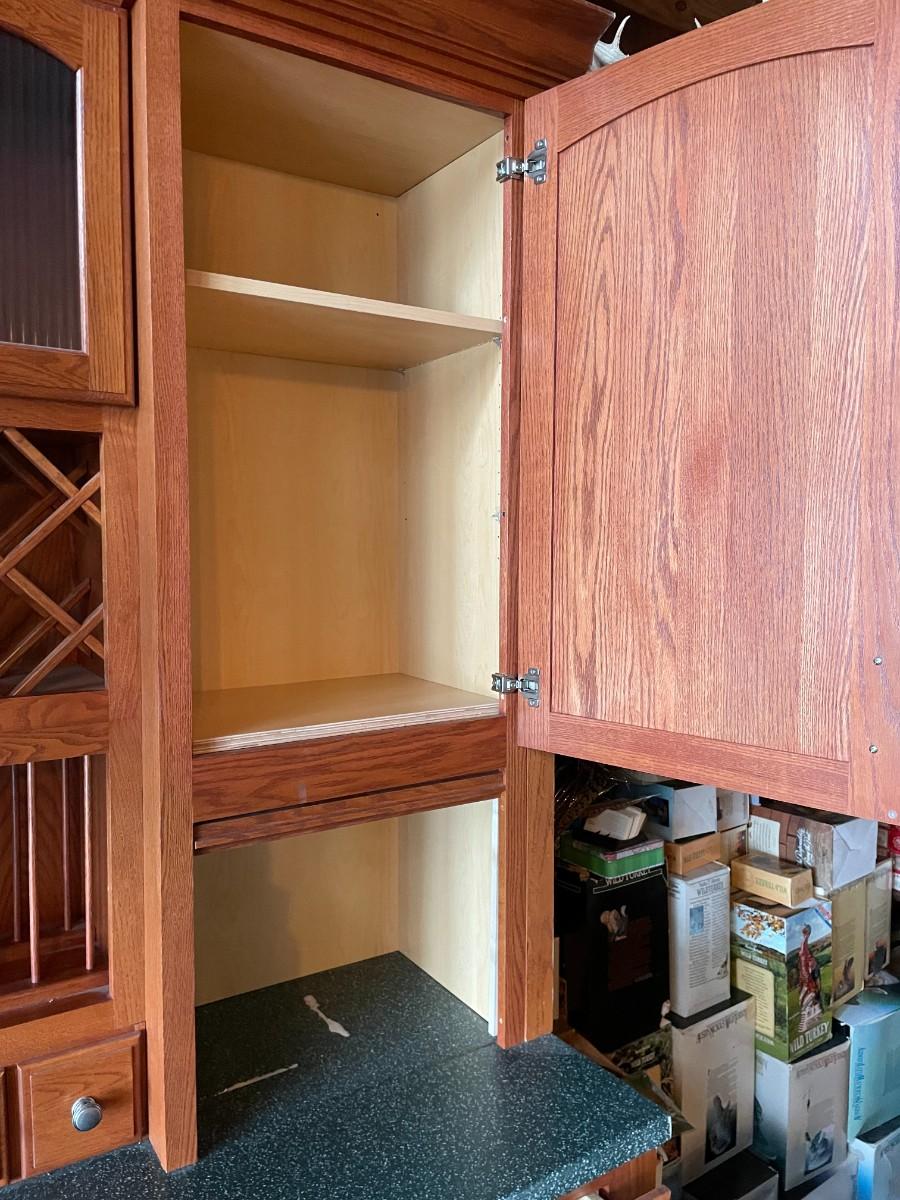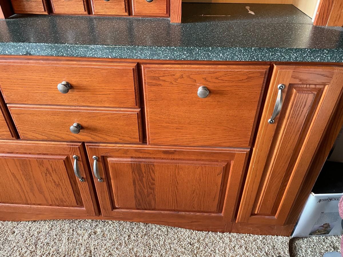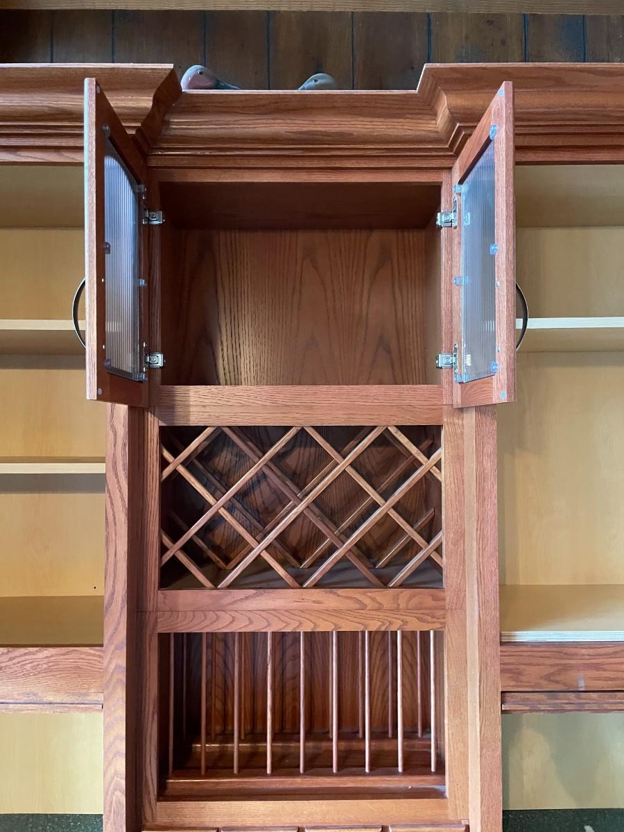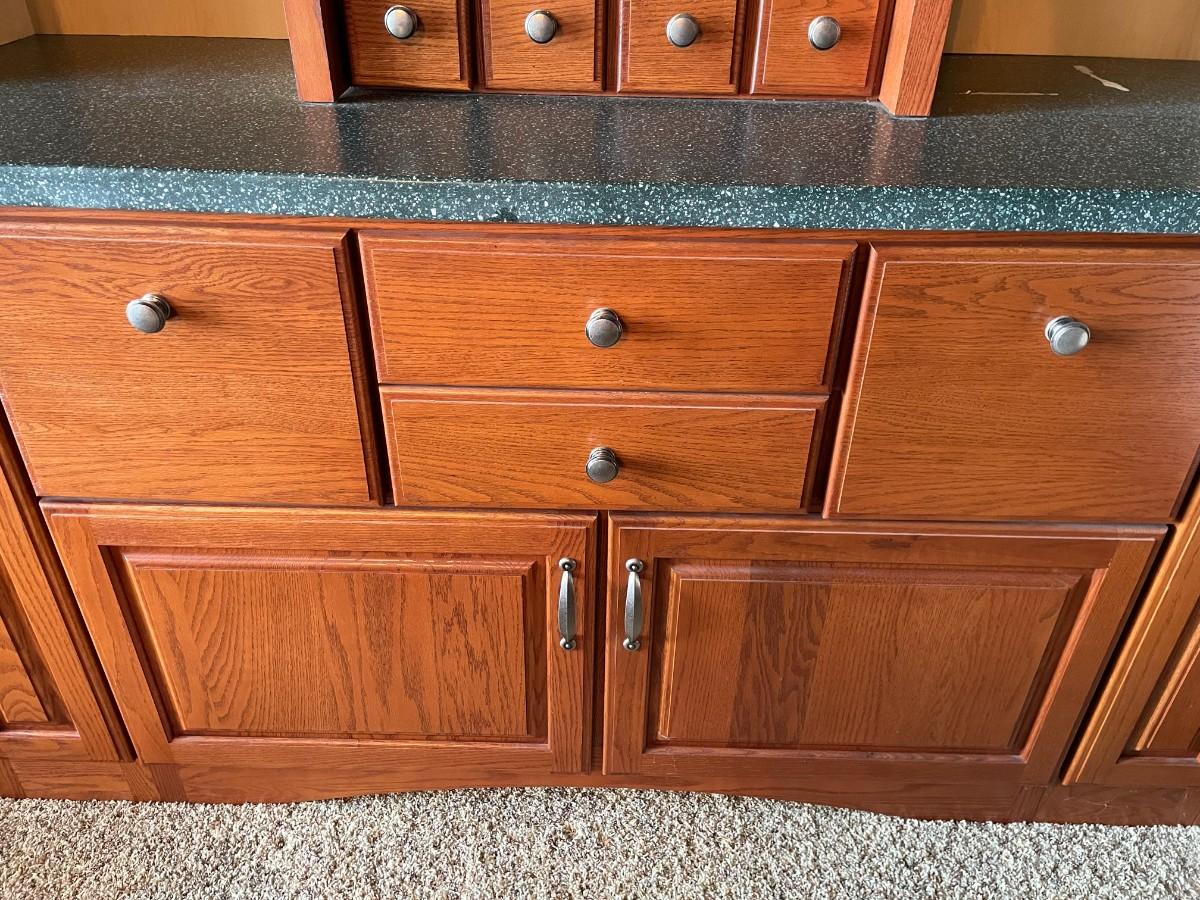 This 2-piece hutch has plenty of storage and a wine rack. Beautifully maintained. Top section: 70L x 15 1/2w x 57H. Bottom section: 70L x 25W x 36H.