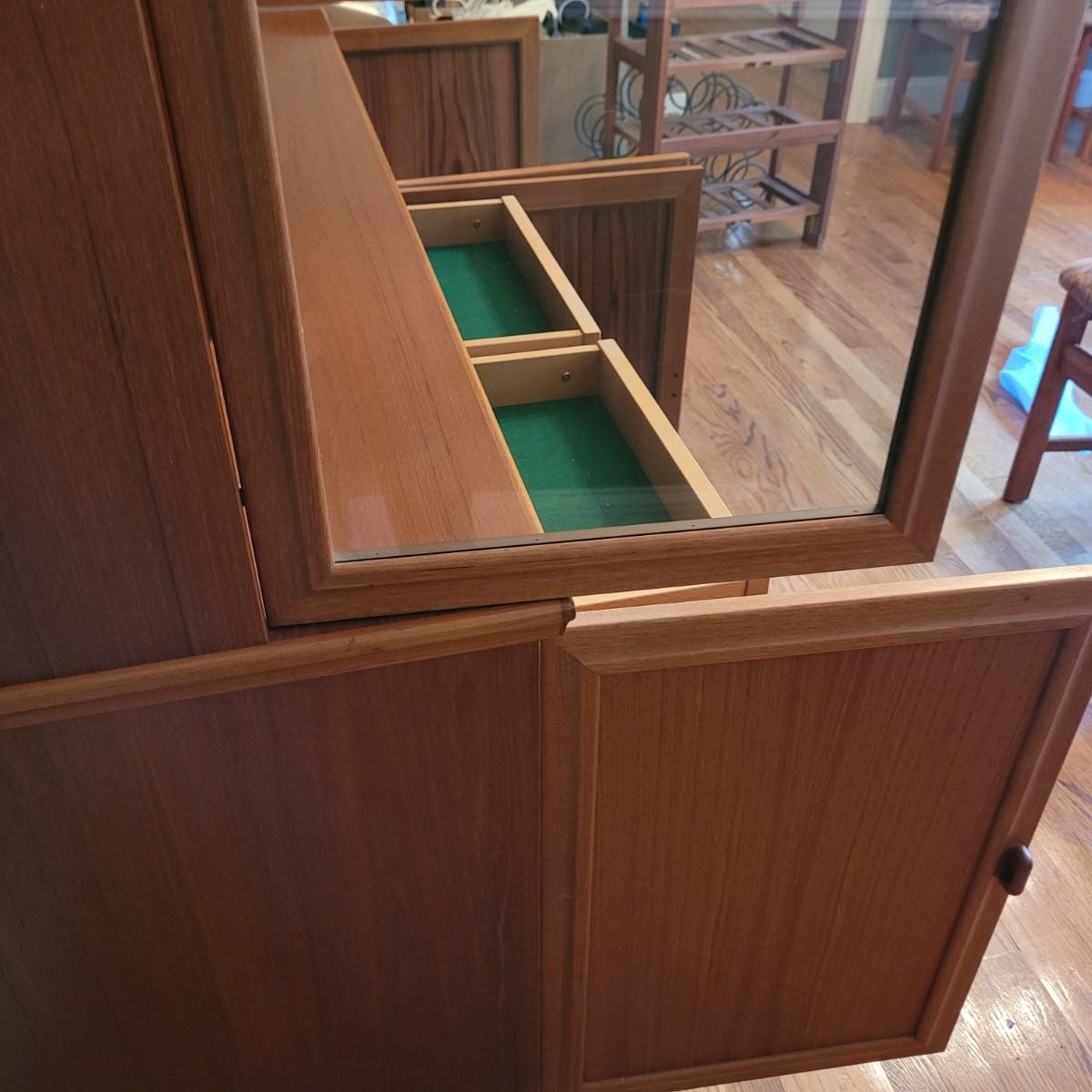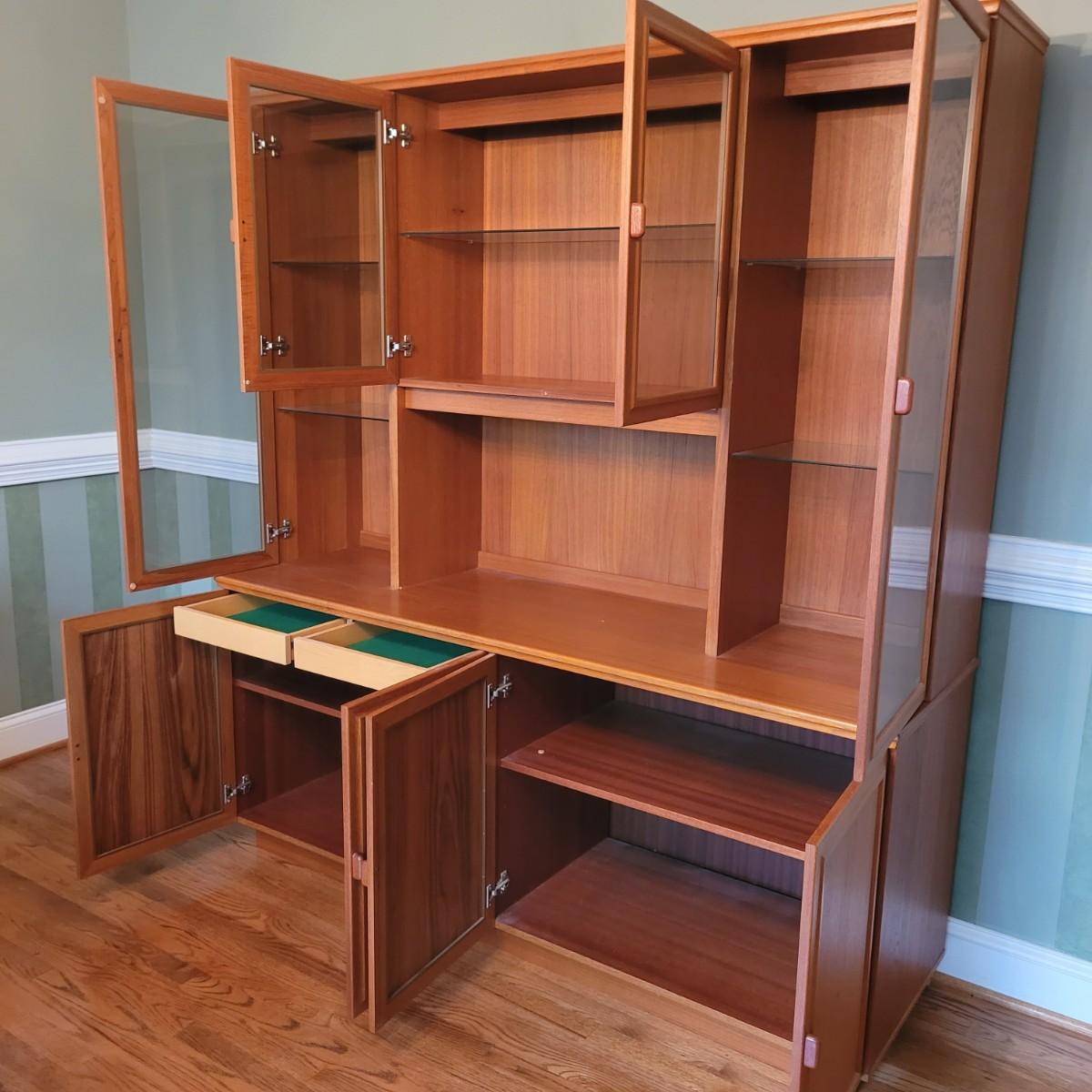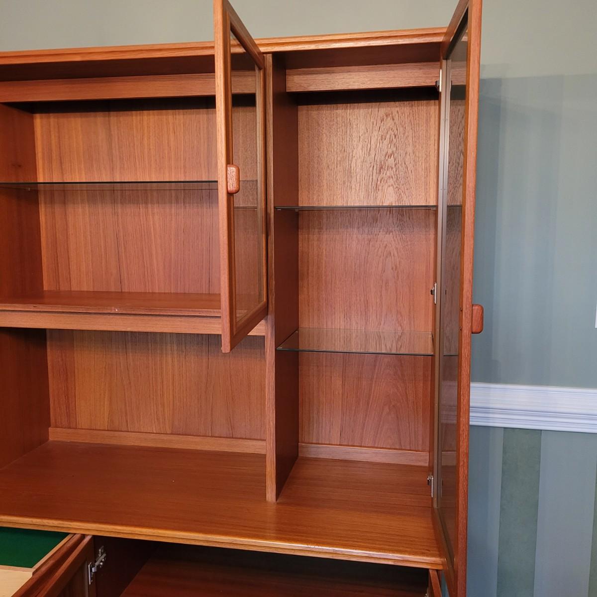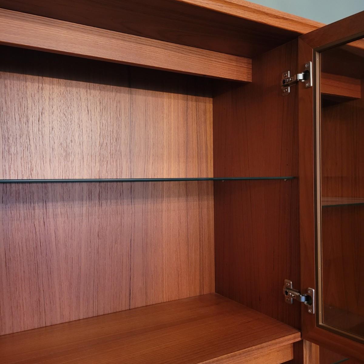 This MCM style sleek wooden hutch by Uldum Industries of Denmark has large and small glass cabinets with shelving, in addition to lower cabinets with small drawers and adjustable shelving. Lighting runs throughout the upper shelves and in lower opening, operates with switch above front open shelf All bulbs powered on when plugged in.
