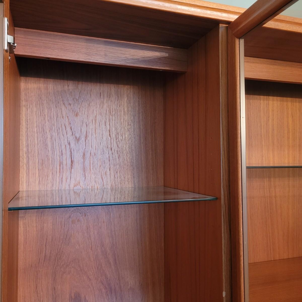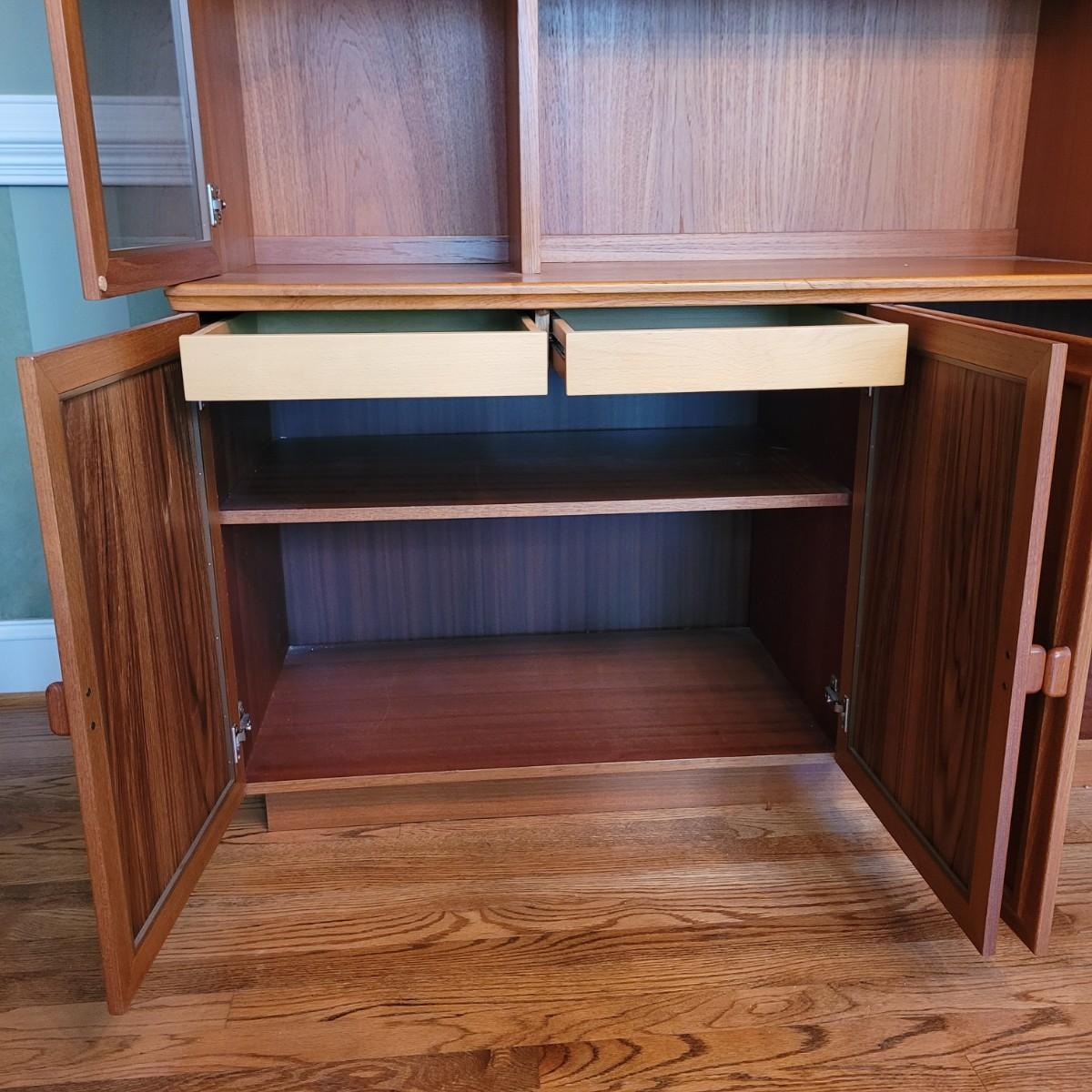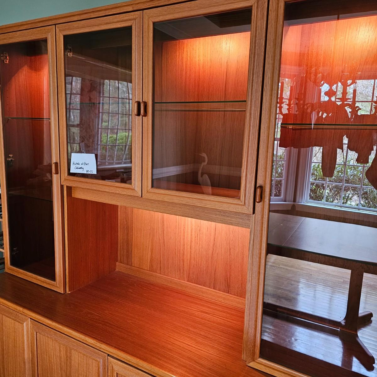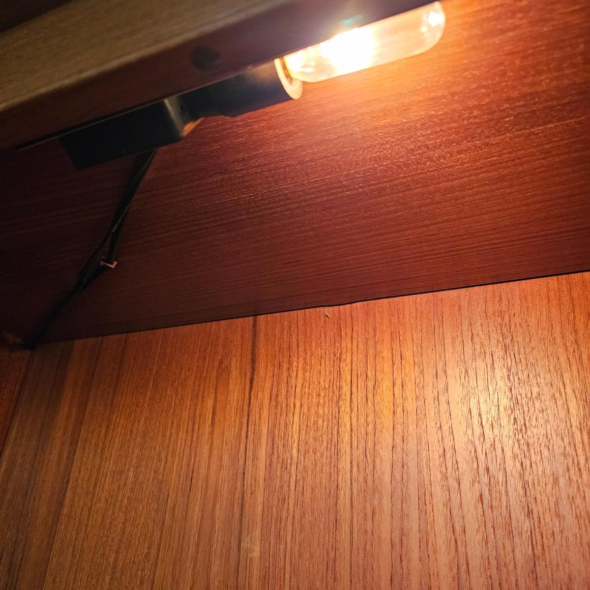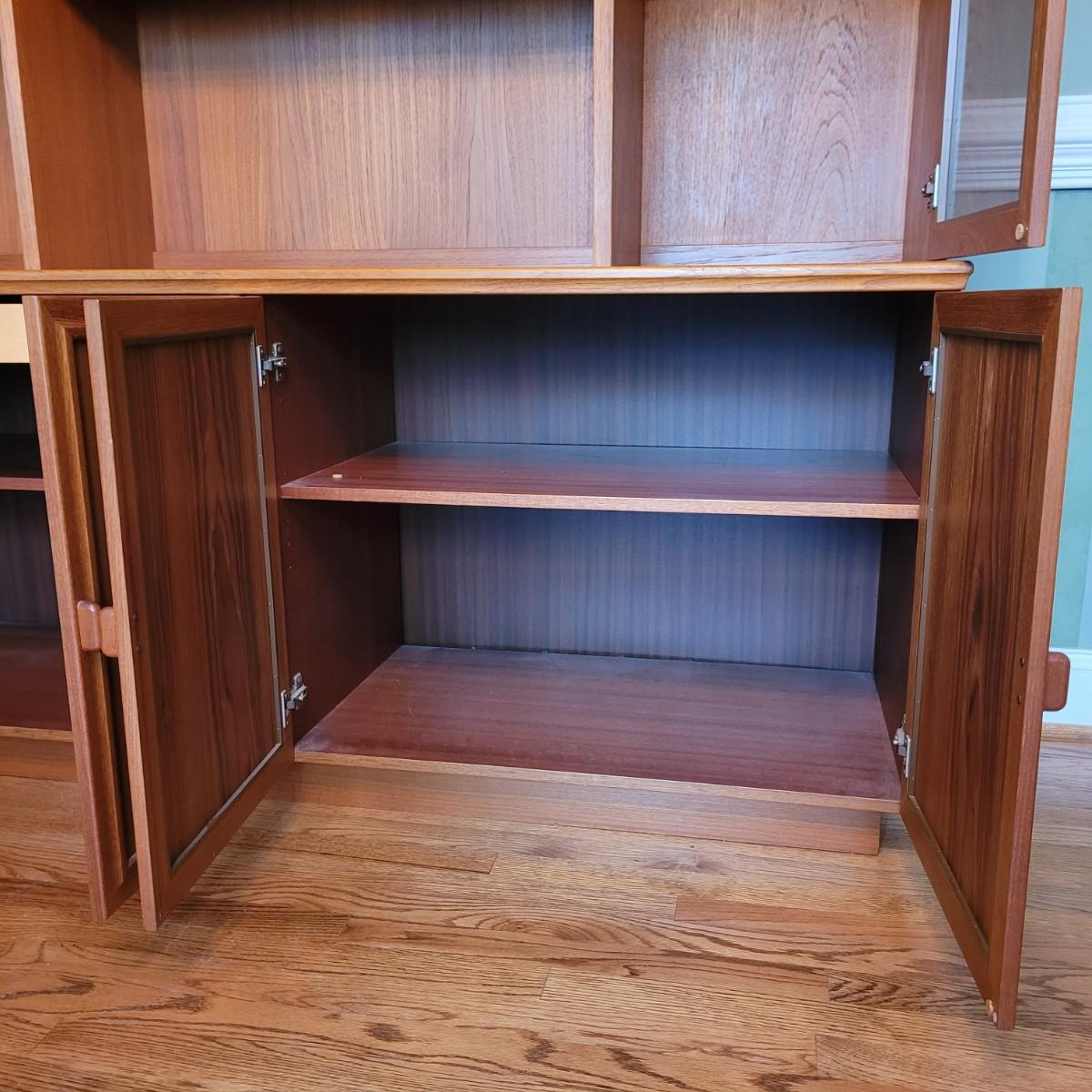 This MCM style sleek wooden hutch by Uldum Industries of Denmark has large and small glass cabinets with shelving, in addition to lower cabinets with small drawers and adjustable shelving. Lighting runs throughout the upper shelves and in lower opening, operates with switch above front open shelf All bulbs powered on when plugged in.