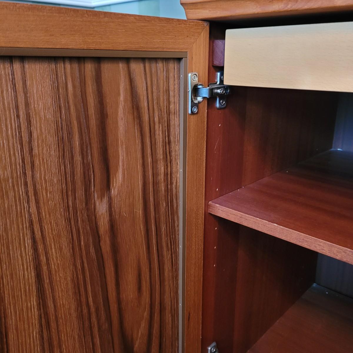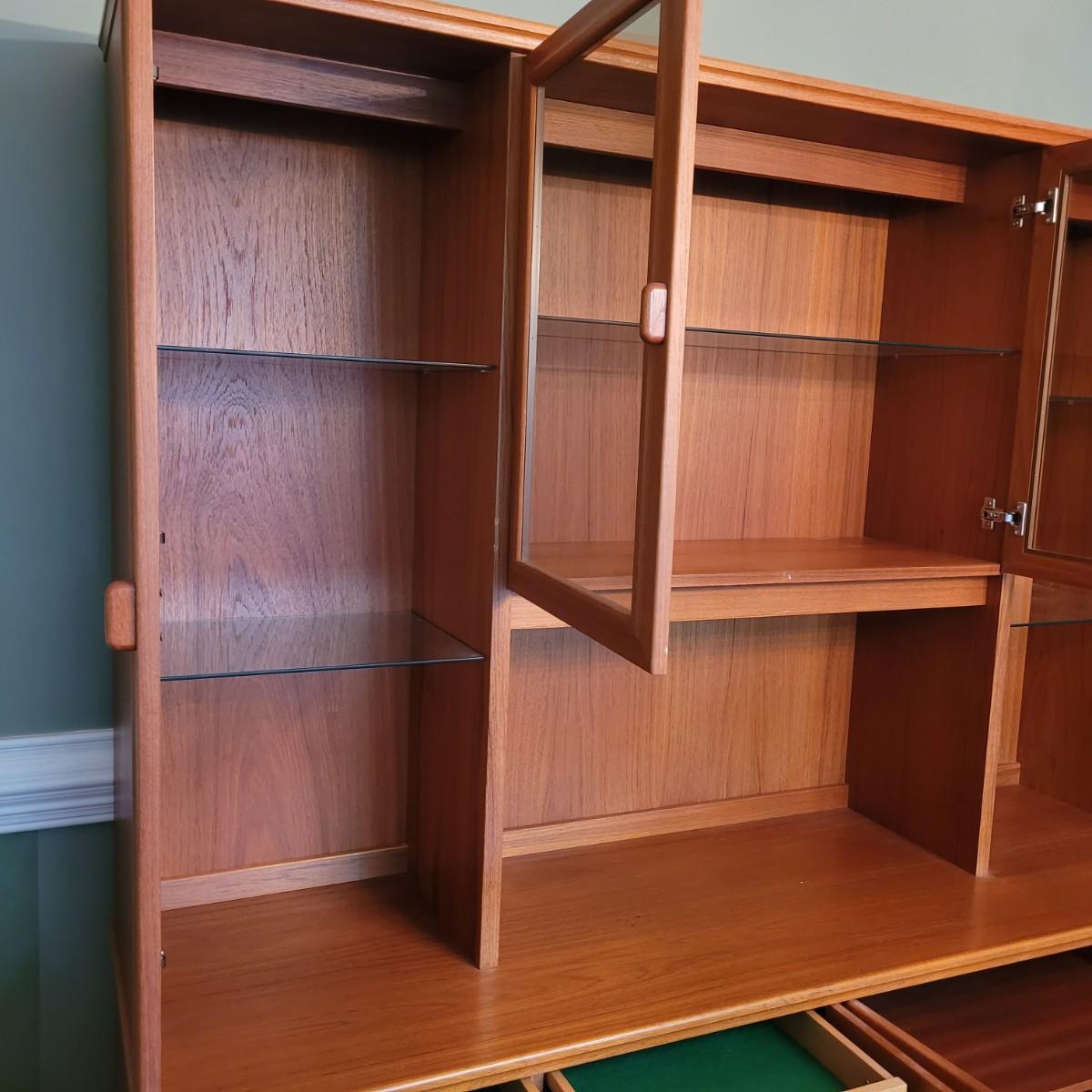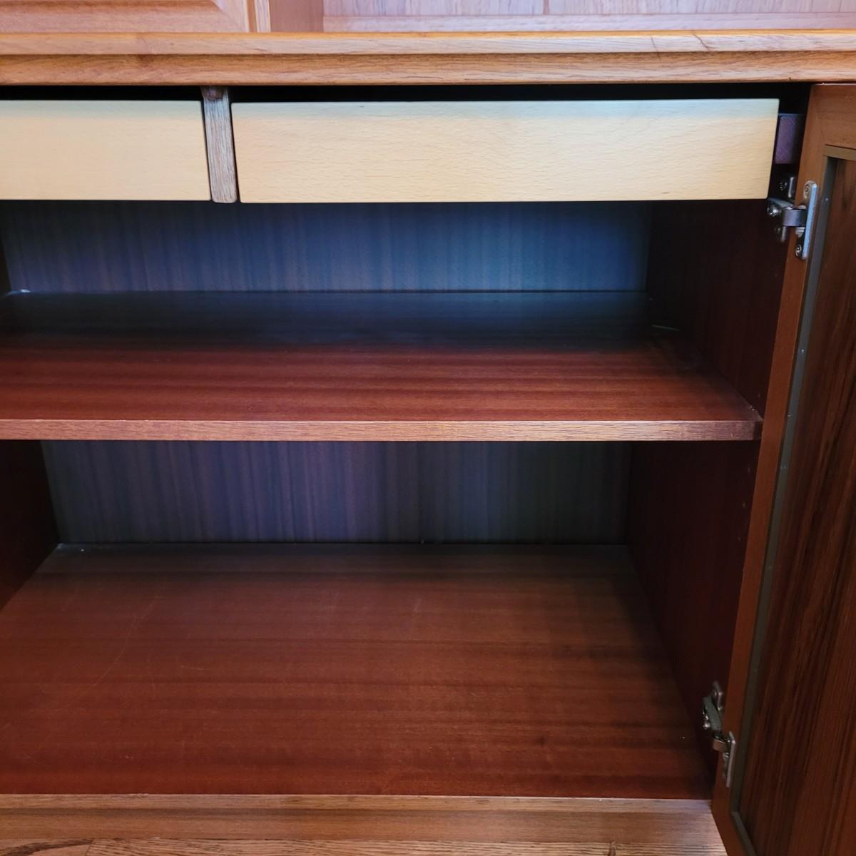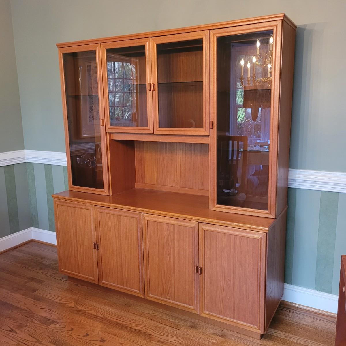 This MCM style sleek wooden hutch by Uldum Industries of Denmark has large and small glass cabinets with shelving, in addition to lower cabinets with small drawers and adjustable shelving. Lighting runs throughout the upper shelves and in lower opening, operates with switch above front open shelf All bulbs powered on when plugged in.
