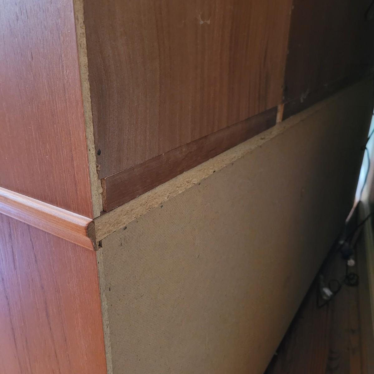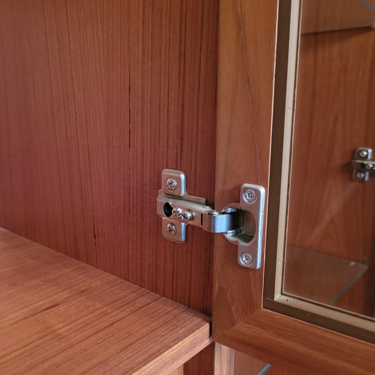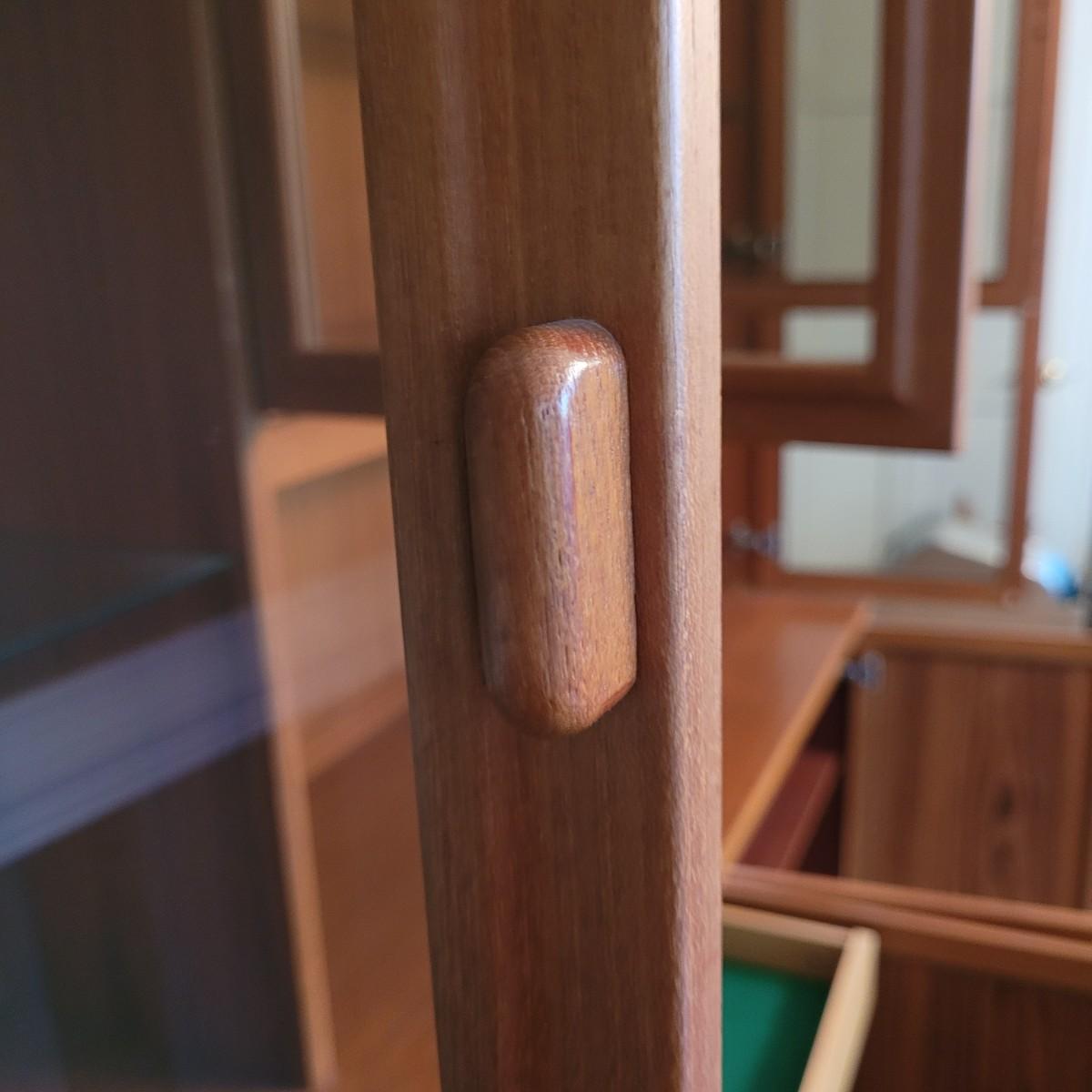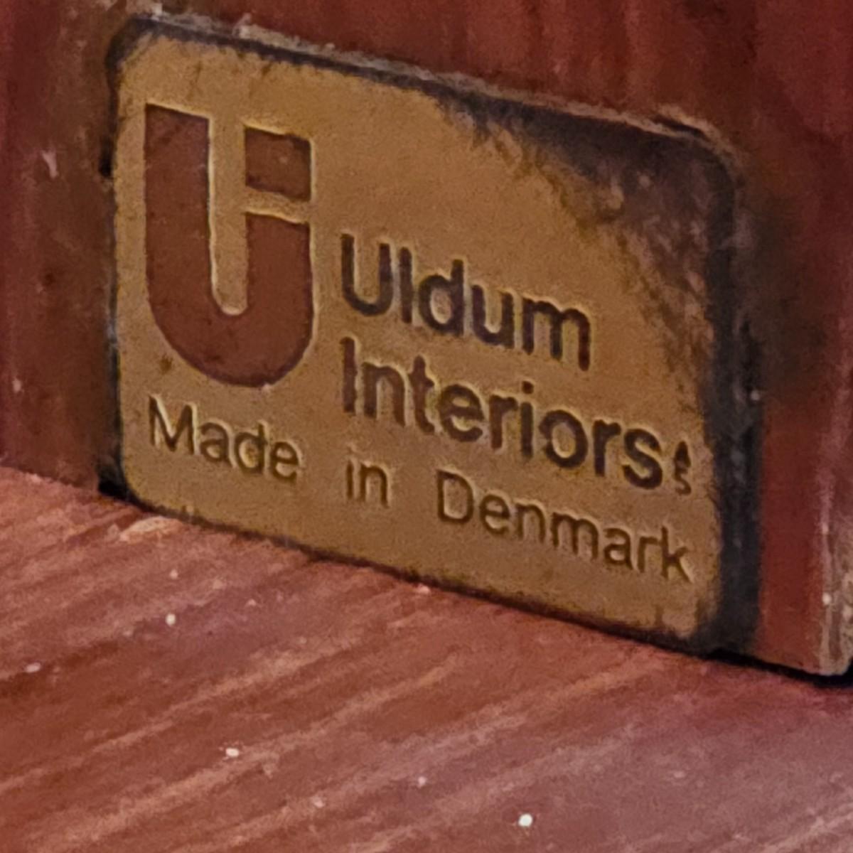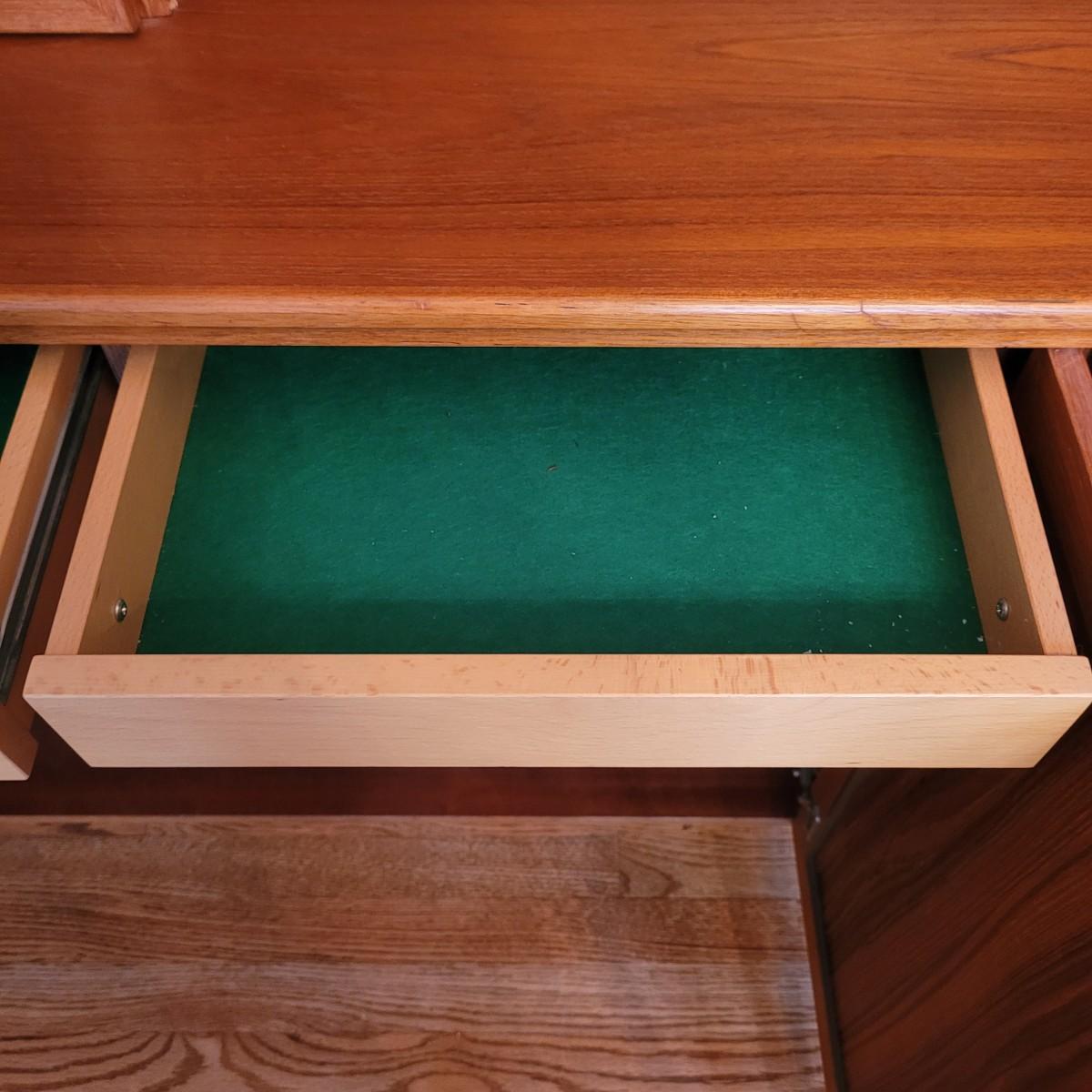 This MCM style sleek wooden hutch by Uldum Industries of Denmark has large and small glass cabinets with shelving, in addition to lower cabinets with small drawers and adjustable shelving. Lighting runs throughout the upper shelves and in lower opening, operates with switch above front open shelf All bulbs powered on when plugged in.