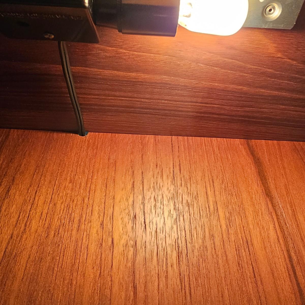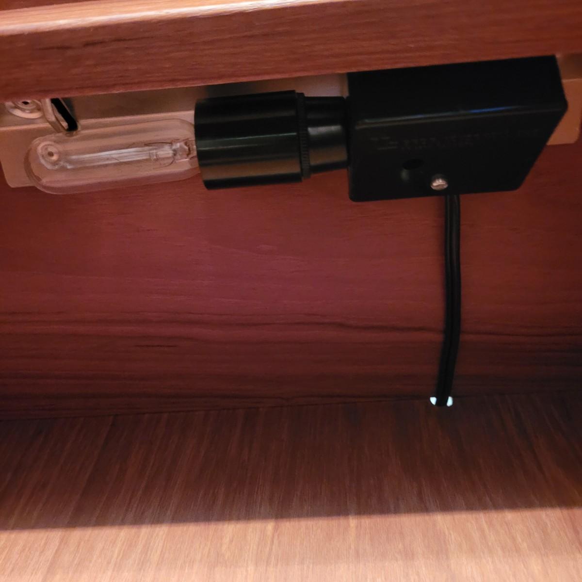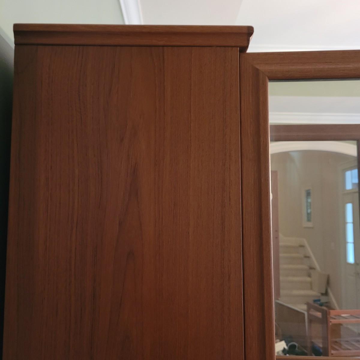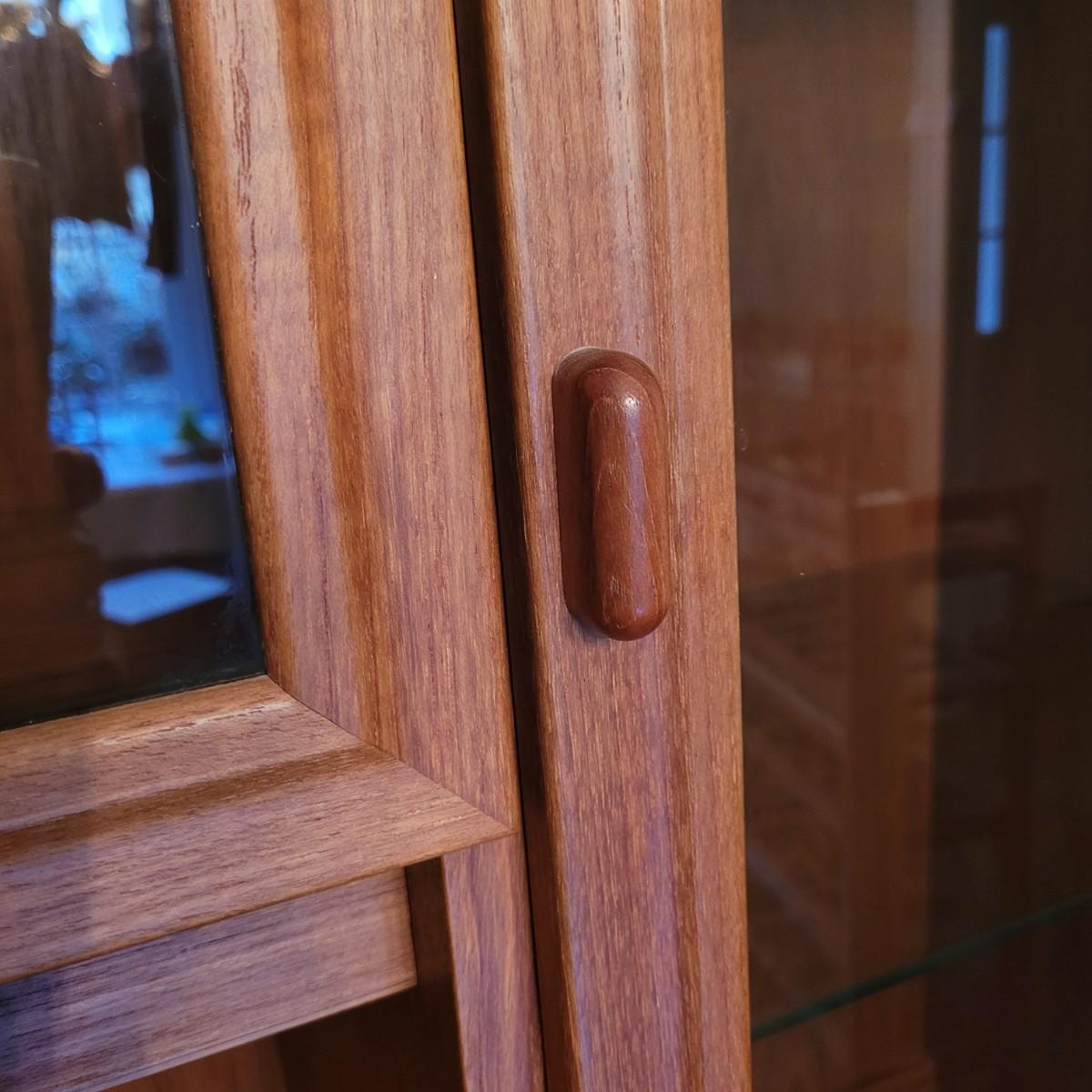 This MCM style sleek wooden hutch by Uldum Industries of Denmark has large and small glass cabinets with shelving, in addition to lower cabinets with small drawers and adjustable shelving. Lighting runs throughout the upper shelves and in lower opening, operates with switch above front open shelf All bulbs powered on when plugged in.