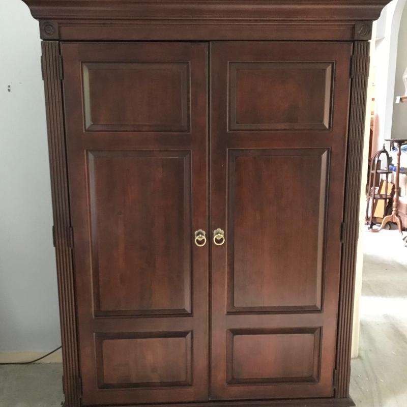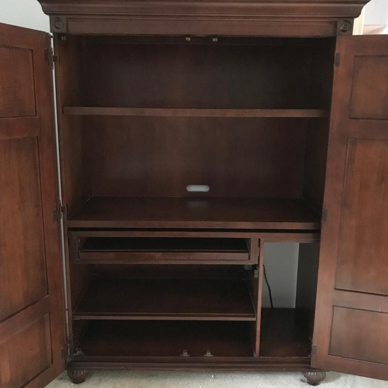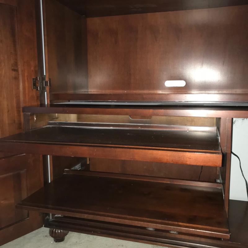 This large hutch/desk was used as an office space. Shelves pull out like drawers to make a desktop for keyboard. Dark reddish-colored wood. Approx. 51” x 21” x 67”. Heavy. Please bring help to move and load. No shipping available. Local pickup only in Hendersonville, NC.