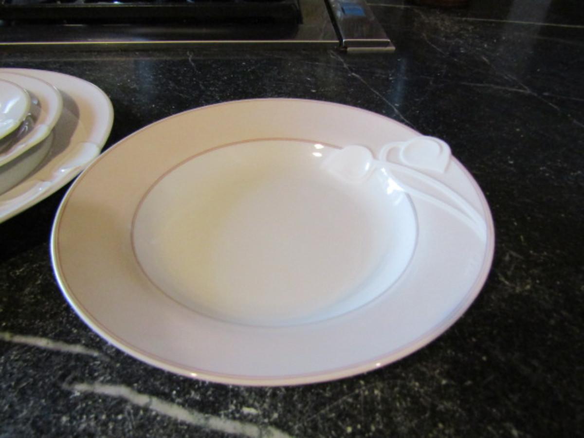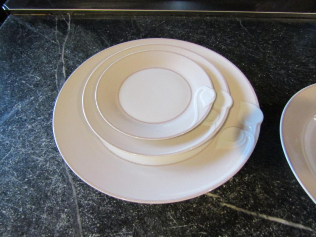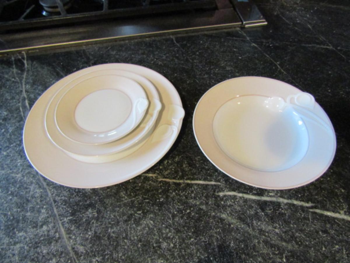 Hutschenreuther Fine China- Chloe Pattern with Pink Rim- 45 Pieces. Dinner plates- 7, Salad plates- 6, Bread plates- 8, Soup bowls- 6, Cups- 8, Saucers- 8, Creamer and Covered Sugar Bowl. Also included are padded zippered storage cases.