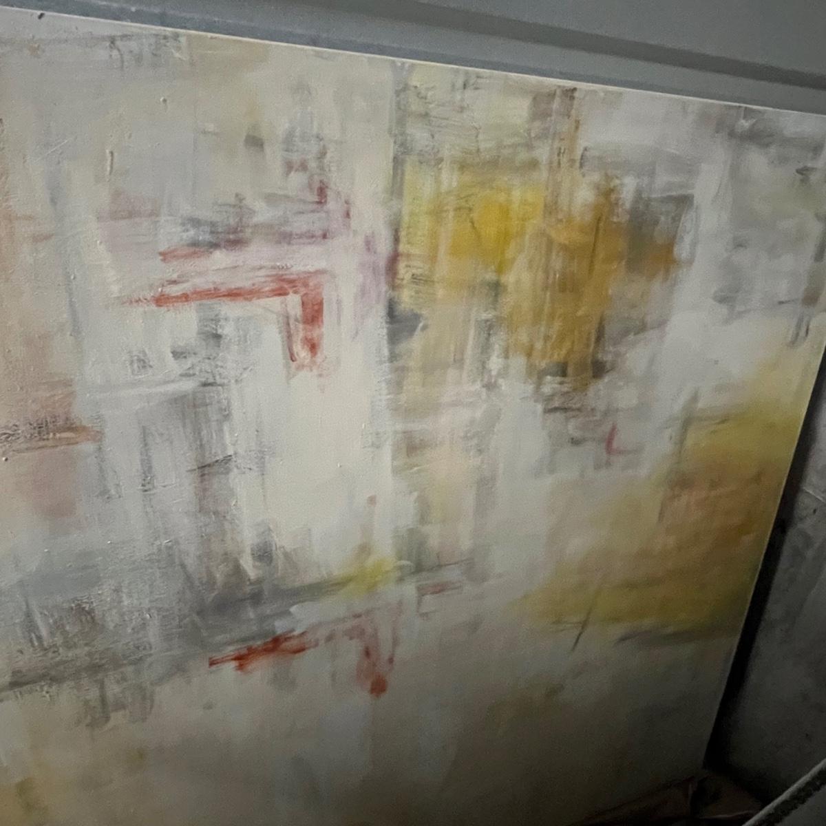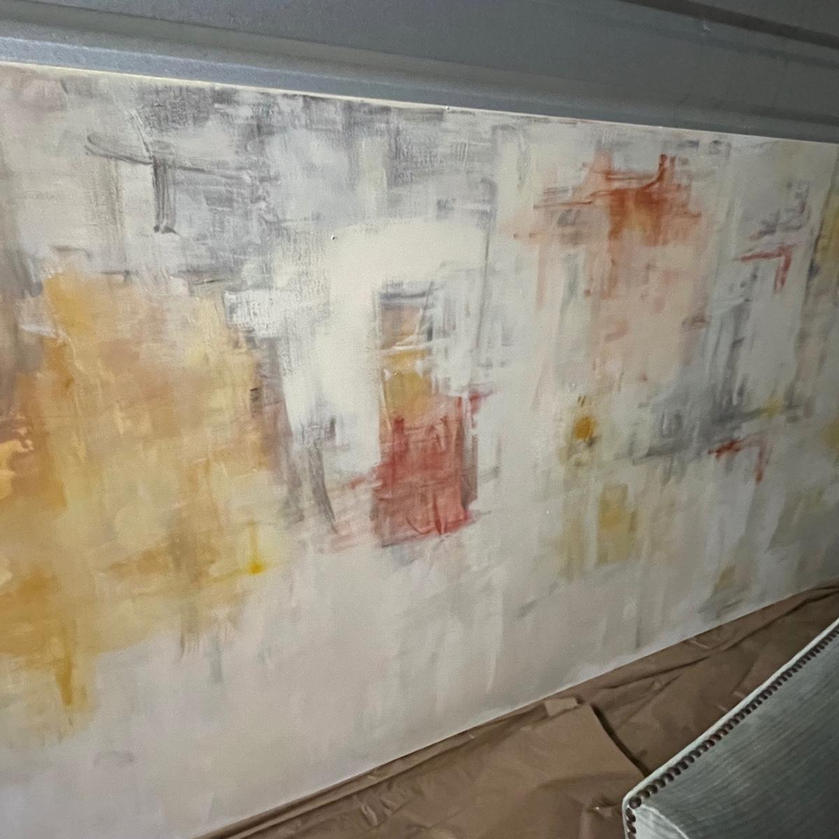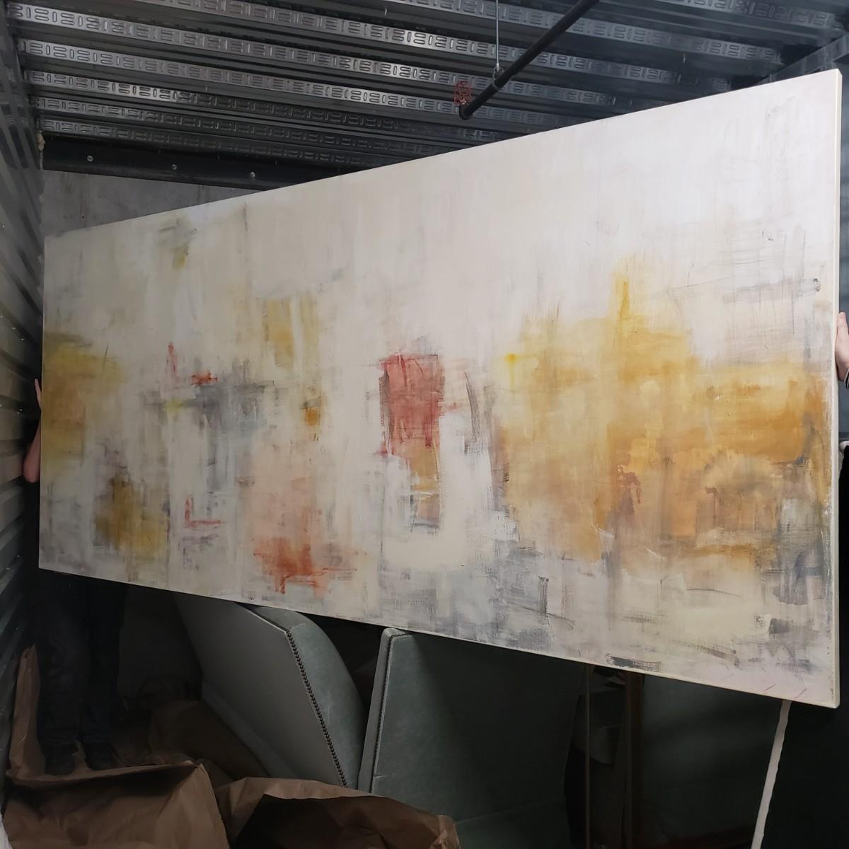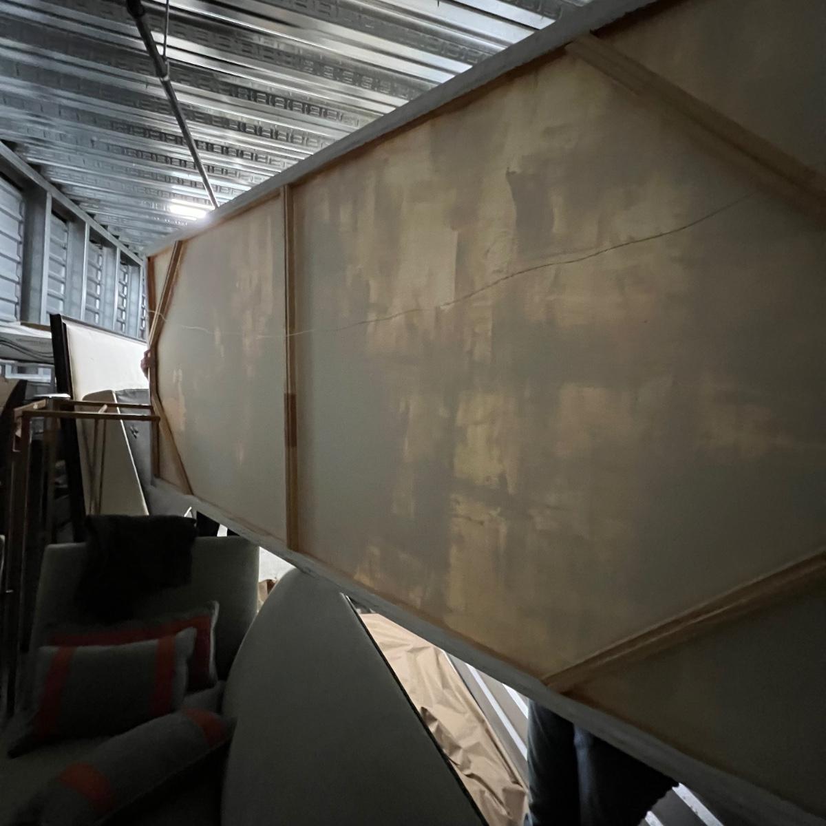 This very large canvas has no identifying marks but we are told by the estate owner that the artist is Hutton Snelling and it appears to be an acrylic on canvas. Frame for canvas is wood and it measures 120” x 2” x 54”H.