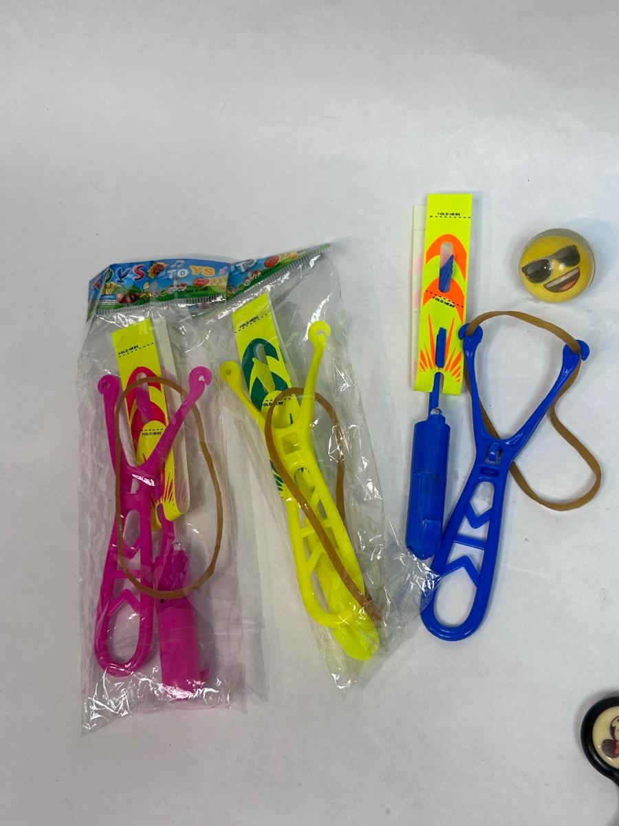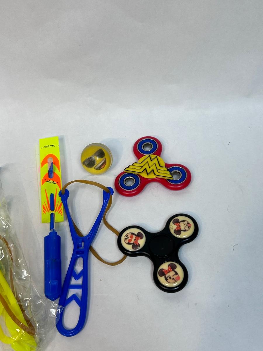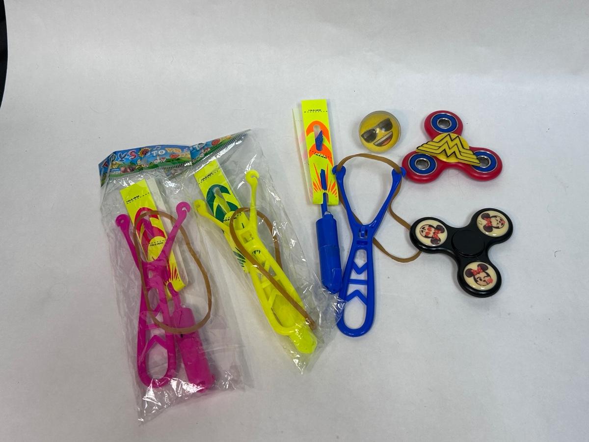 Pair of Fidget Spinners and Rubber Band Shooter Toys. In good condition. Includes a happy face bouncy ball.