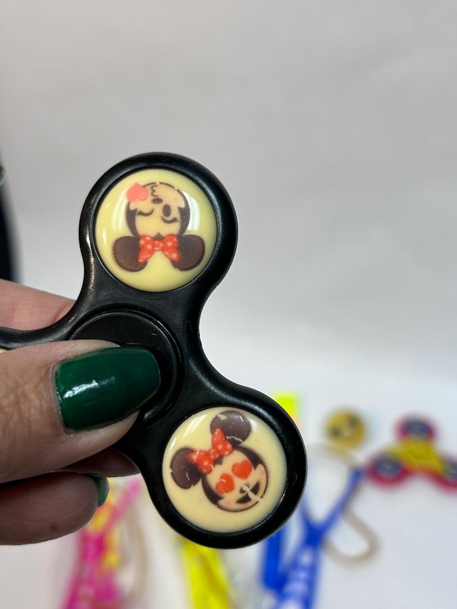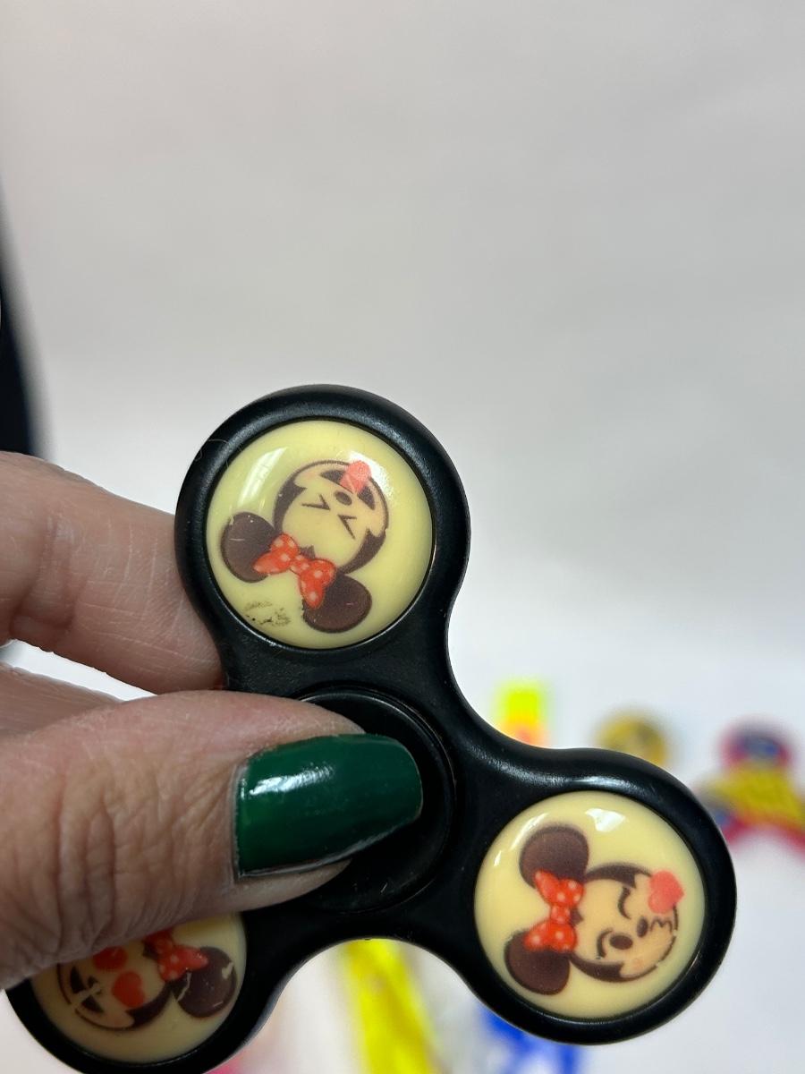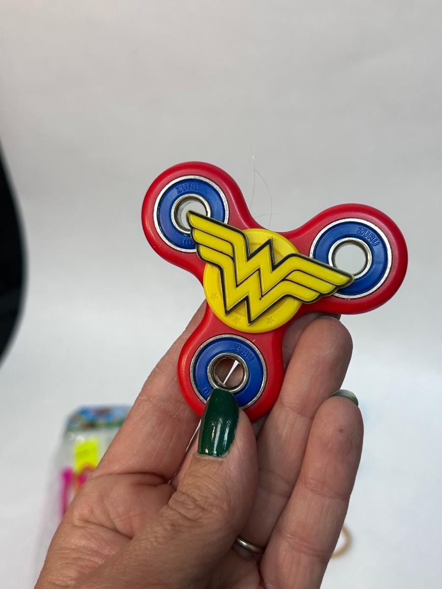 Pair of Fidget Spinners and Rubber Band Shooter Toys. In good condition. Includes a happy face bouncy ball.