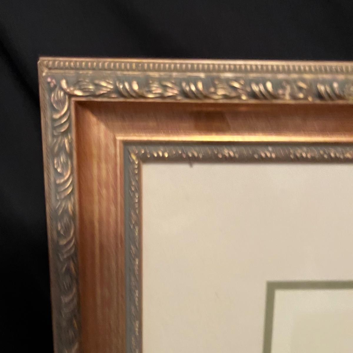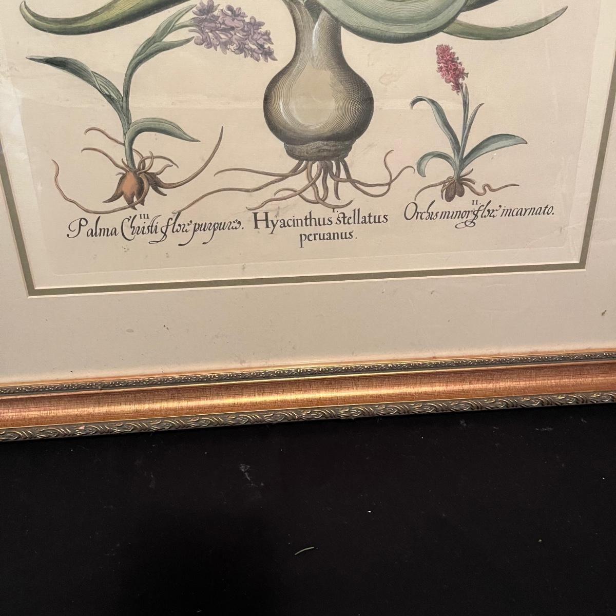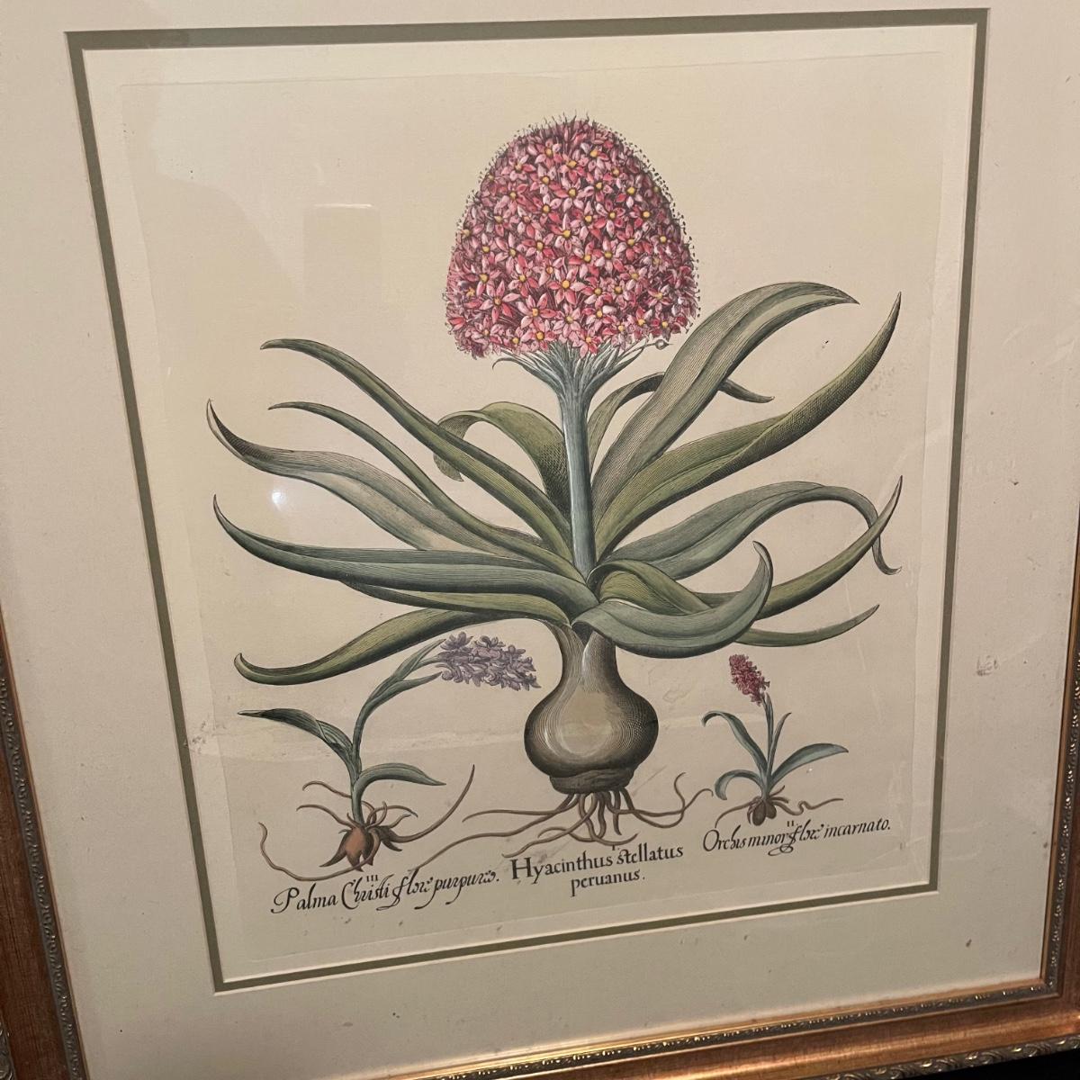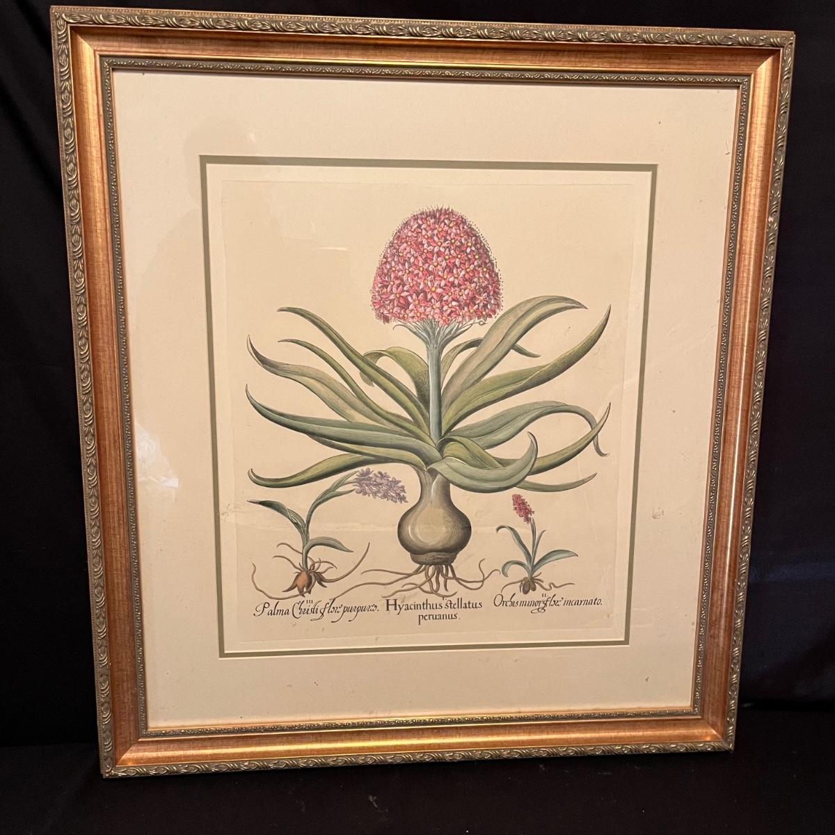 Lot includes a gold colored wooden framed and matted Hyacinthus print under glass. Frame measures 27.5” x 30” x 1.5”. Paper on back has tear, see pictures.