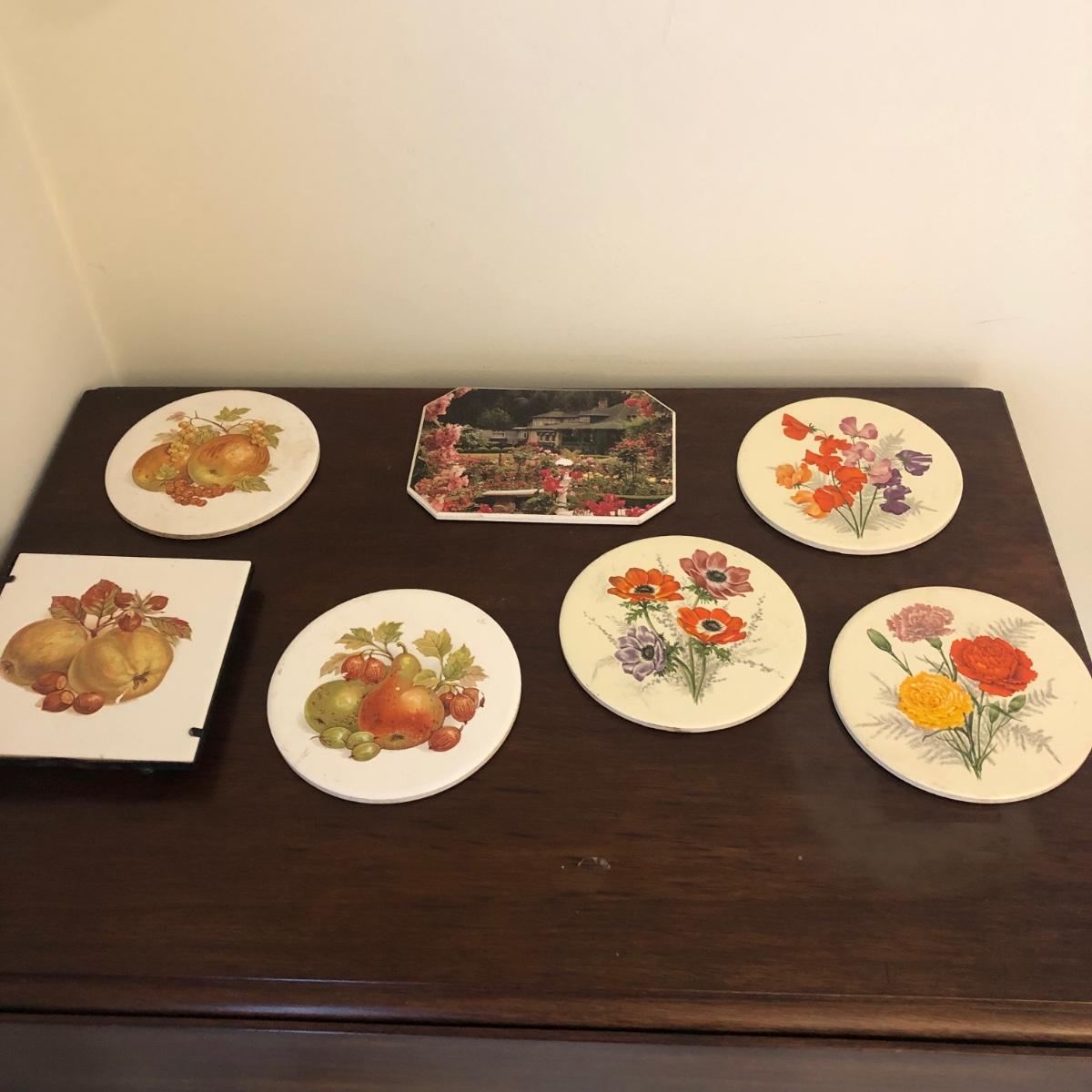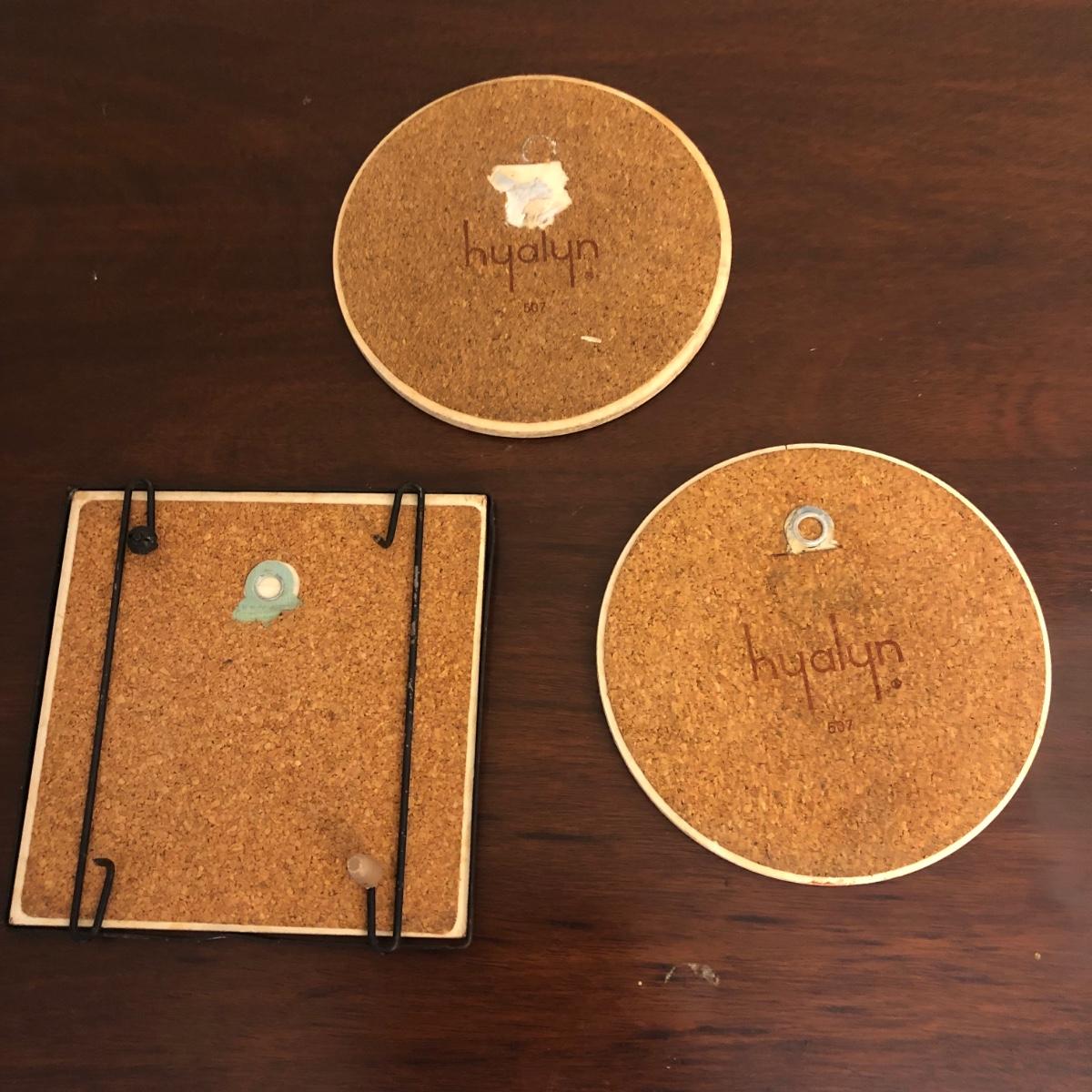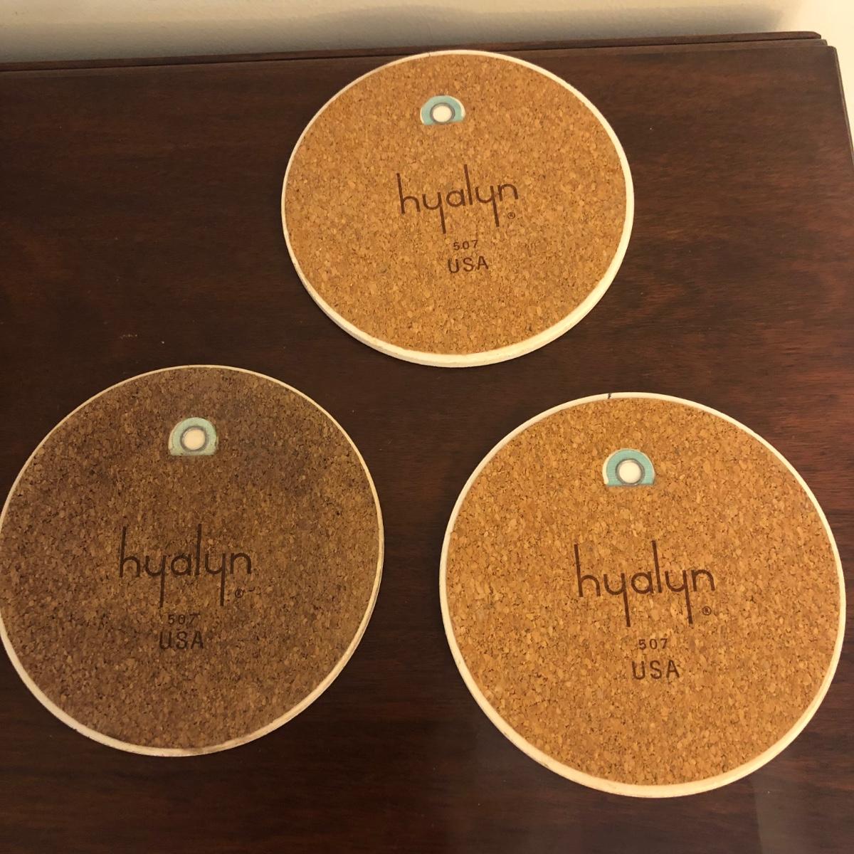 There are five oval Hyalyn trivets all measuring 6” in diameter, as well as two square/rectangular trivets. Shipping Available.