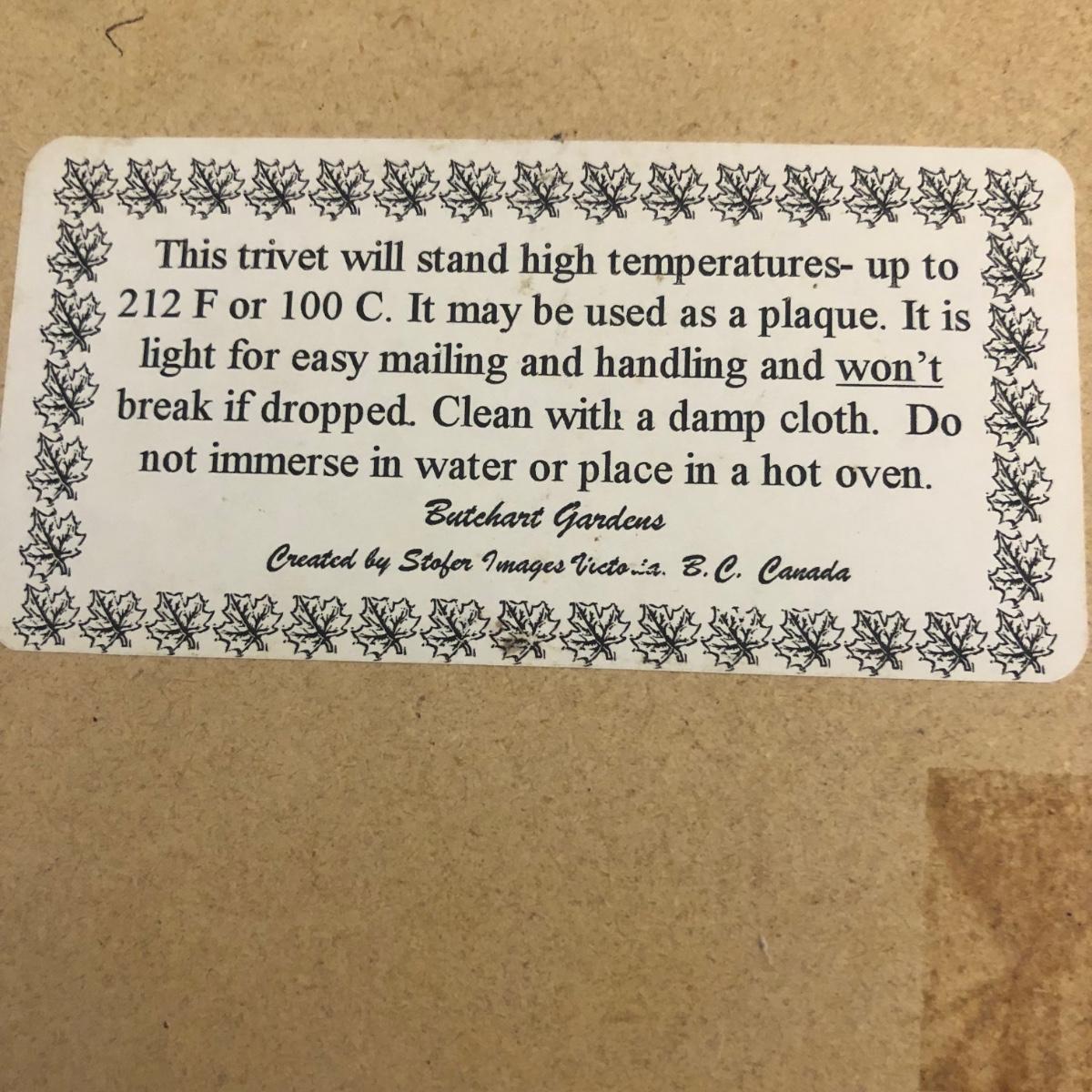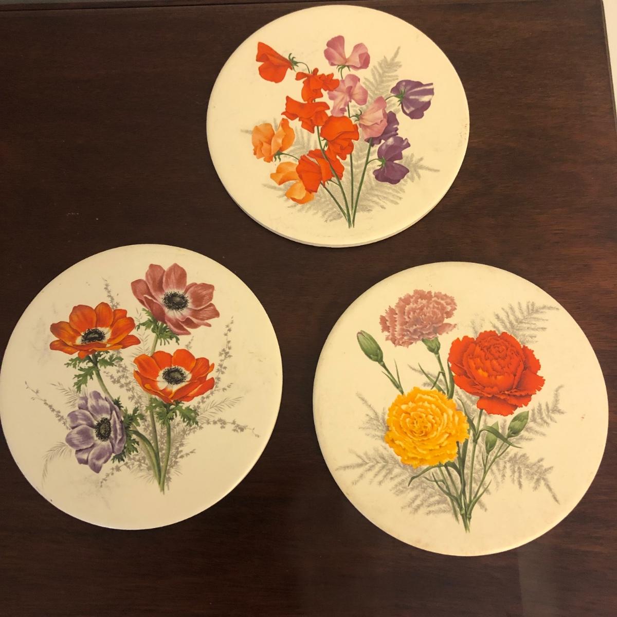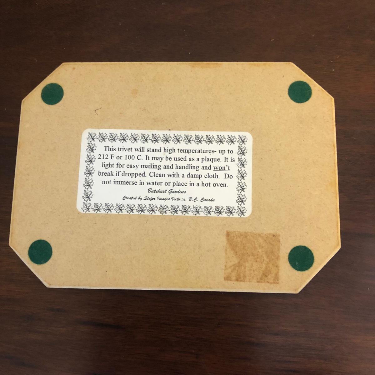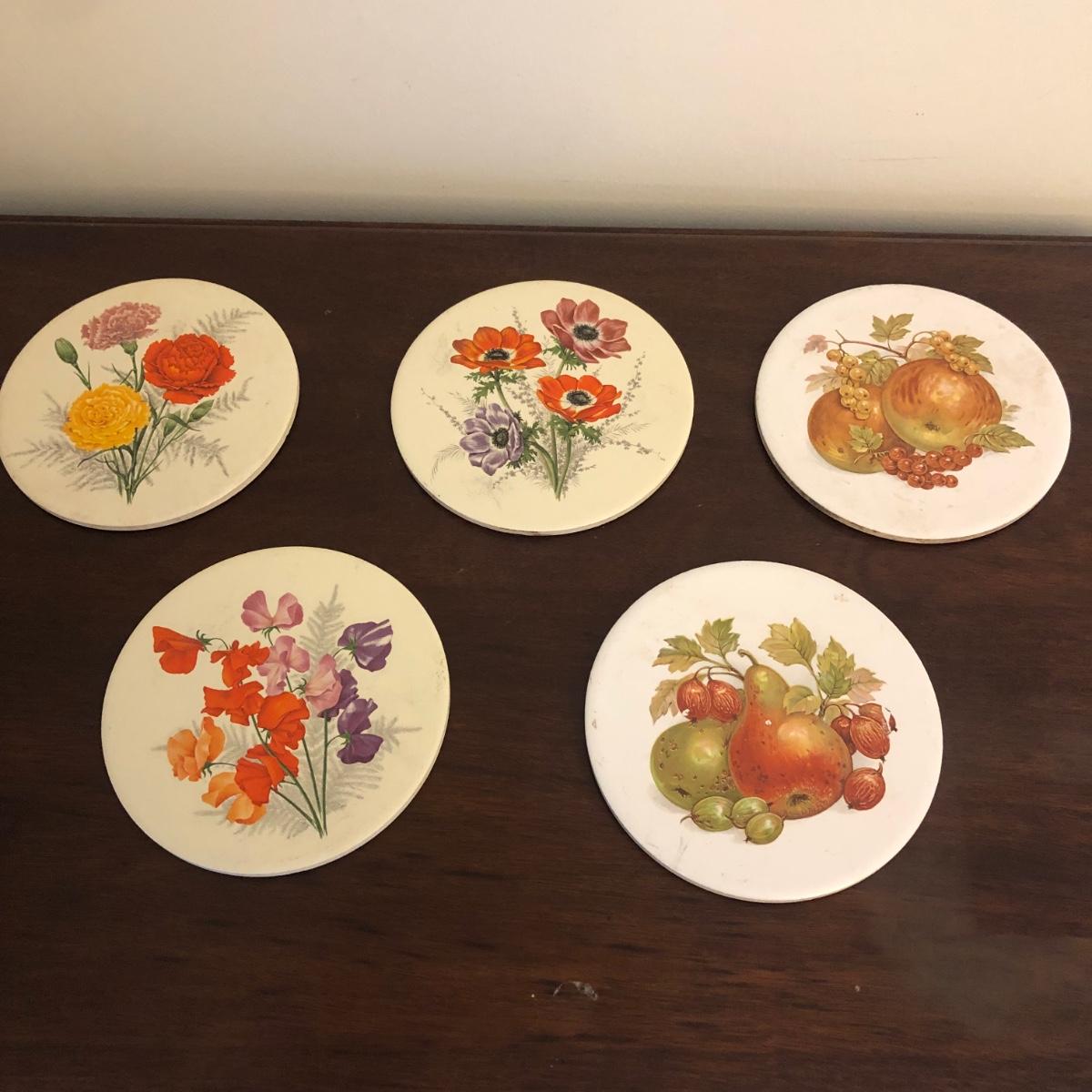 There are five oval Hyalyn trivets all measuring 6” in diameter, as well as two square/rectangular trivets. Shipping Available.