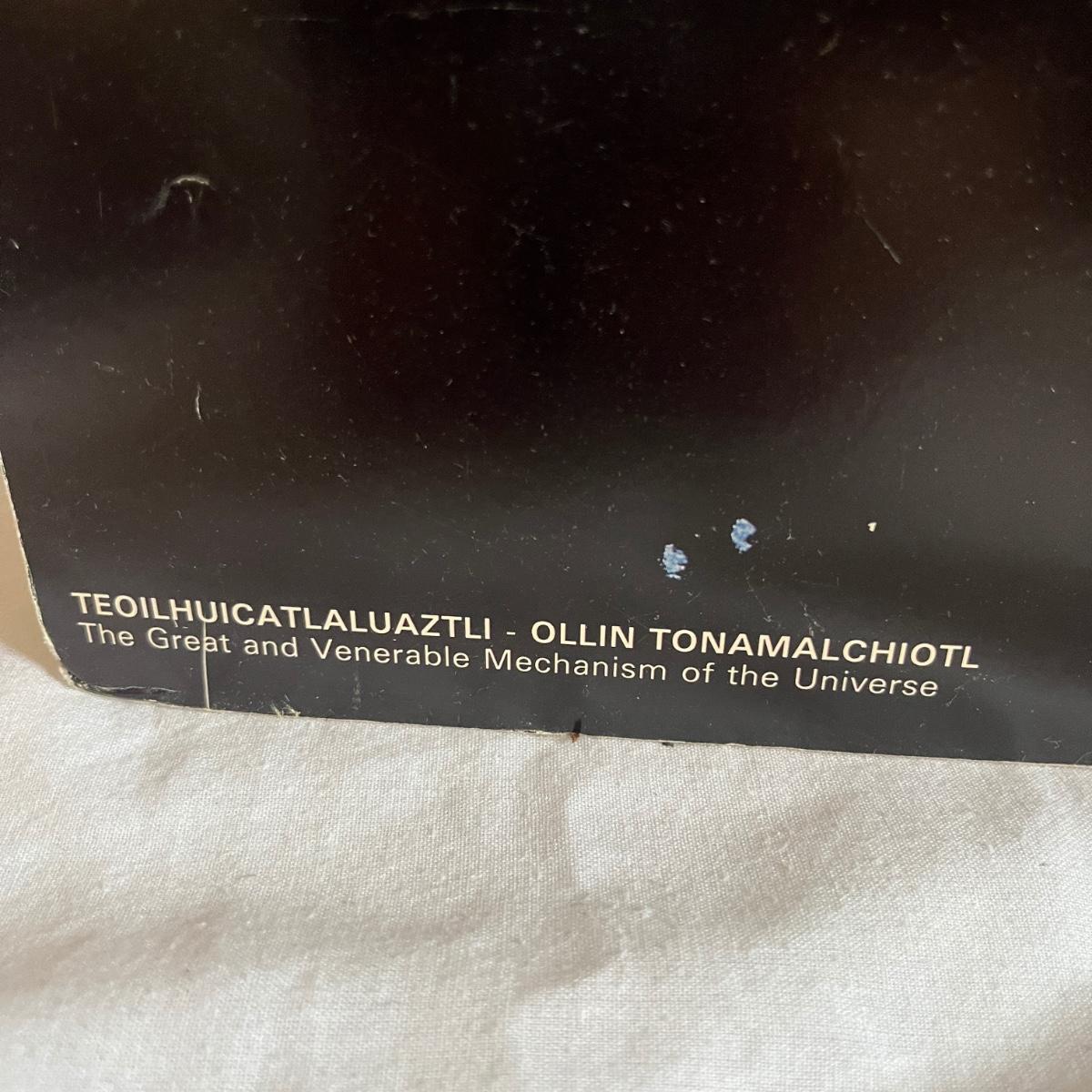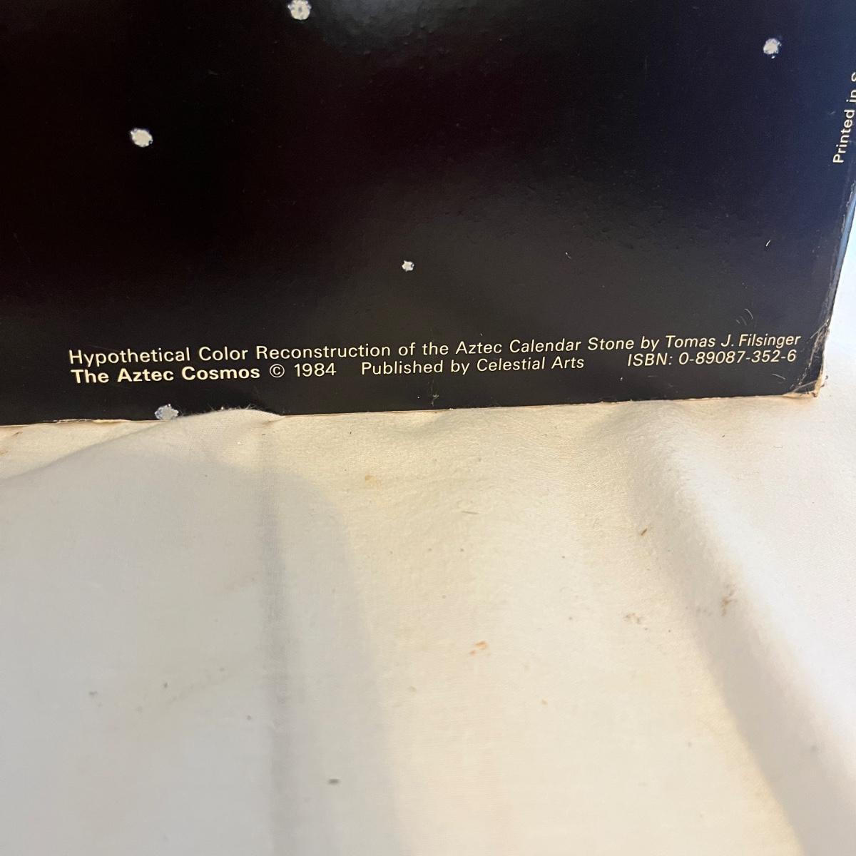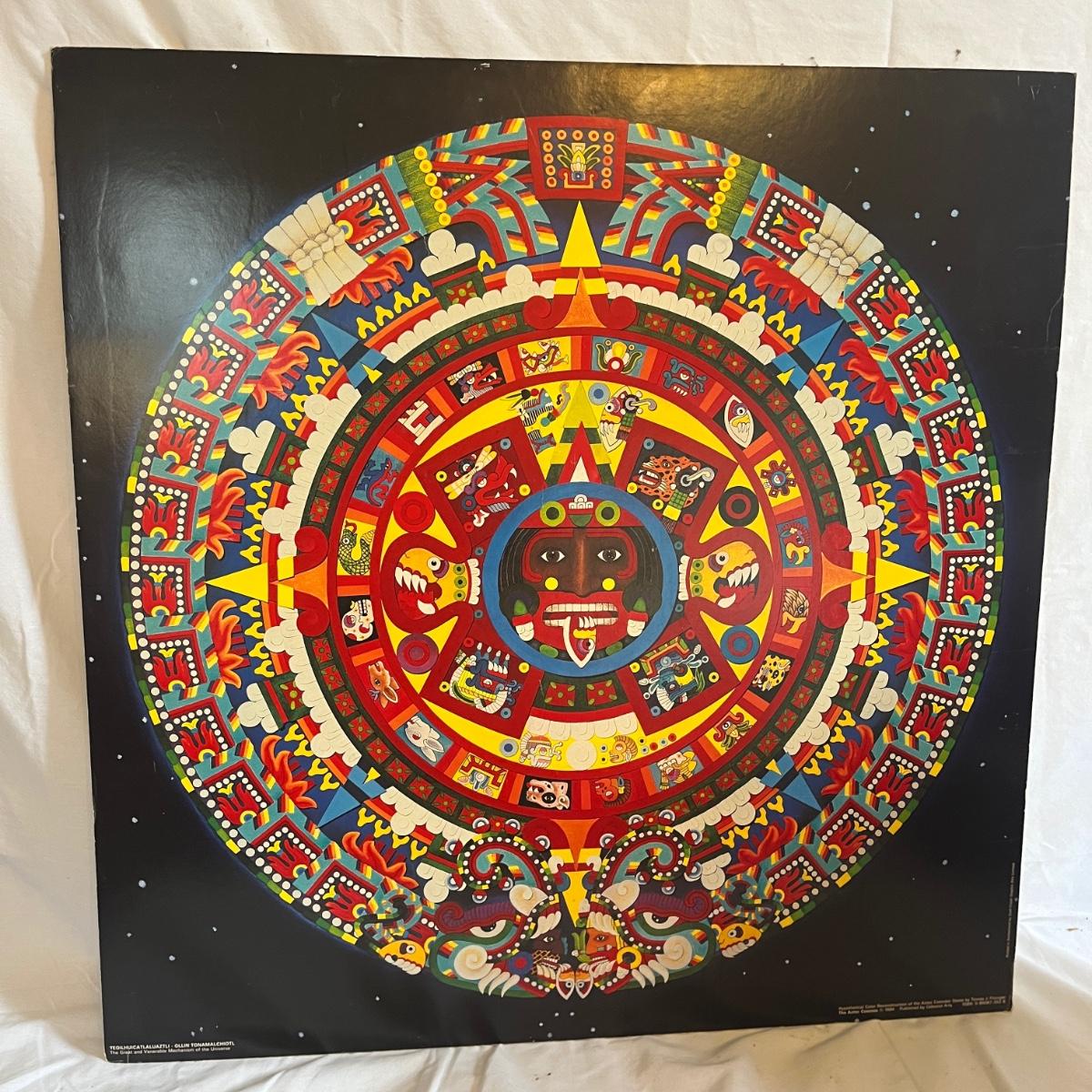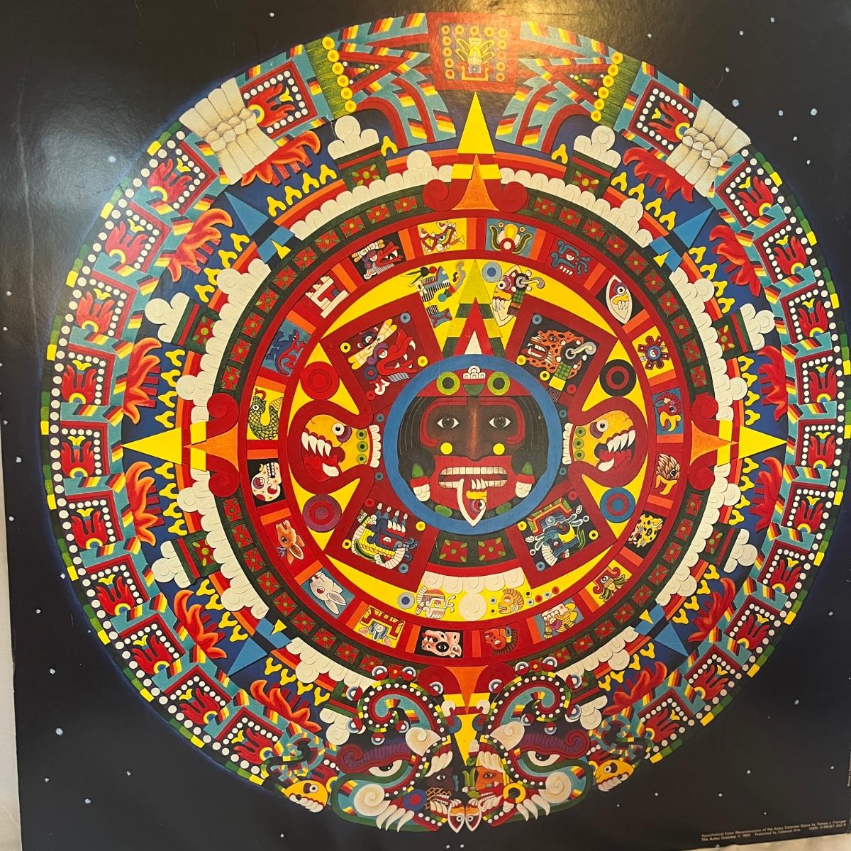 Lot includes a print on a plastic board of a hypothetical color reconstruction of the Aztec calendar stone. Piece measures 35” x 35”.