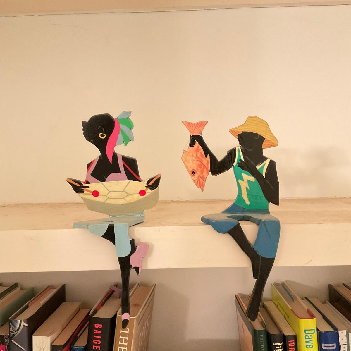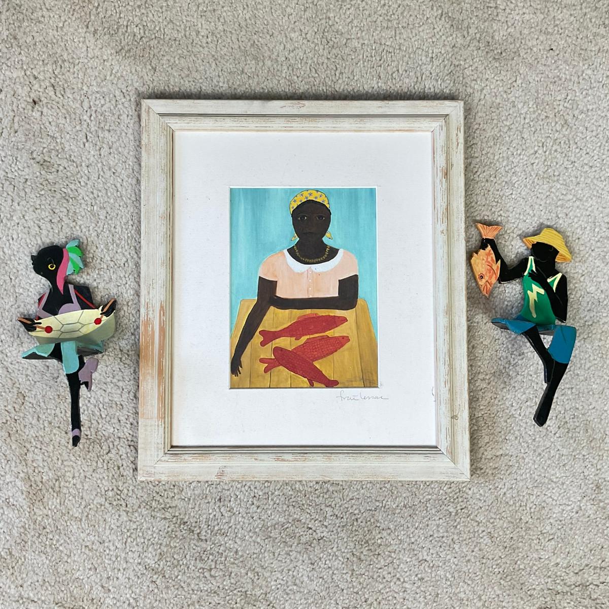 HZ296 Original Folk Art of Woman With Fish signed Frané Lessac and Shelf Figures