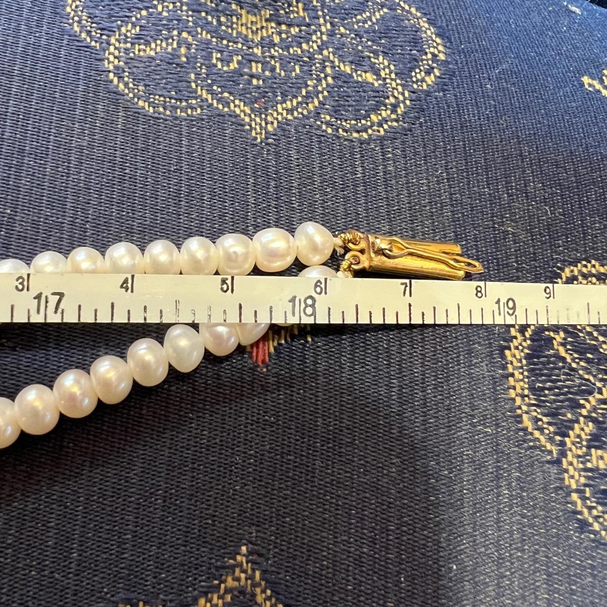 18" long end to end. White with cream colored pearl pattern. Safety clasp.
