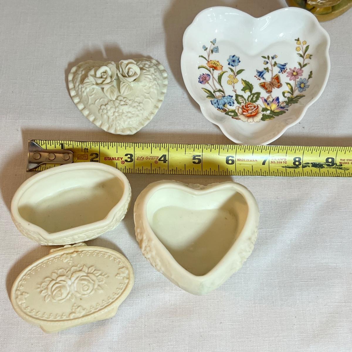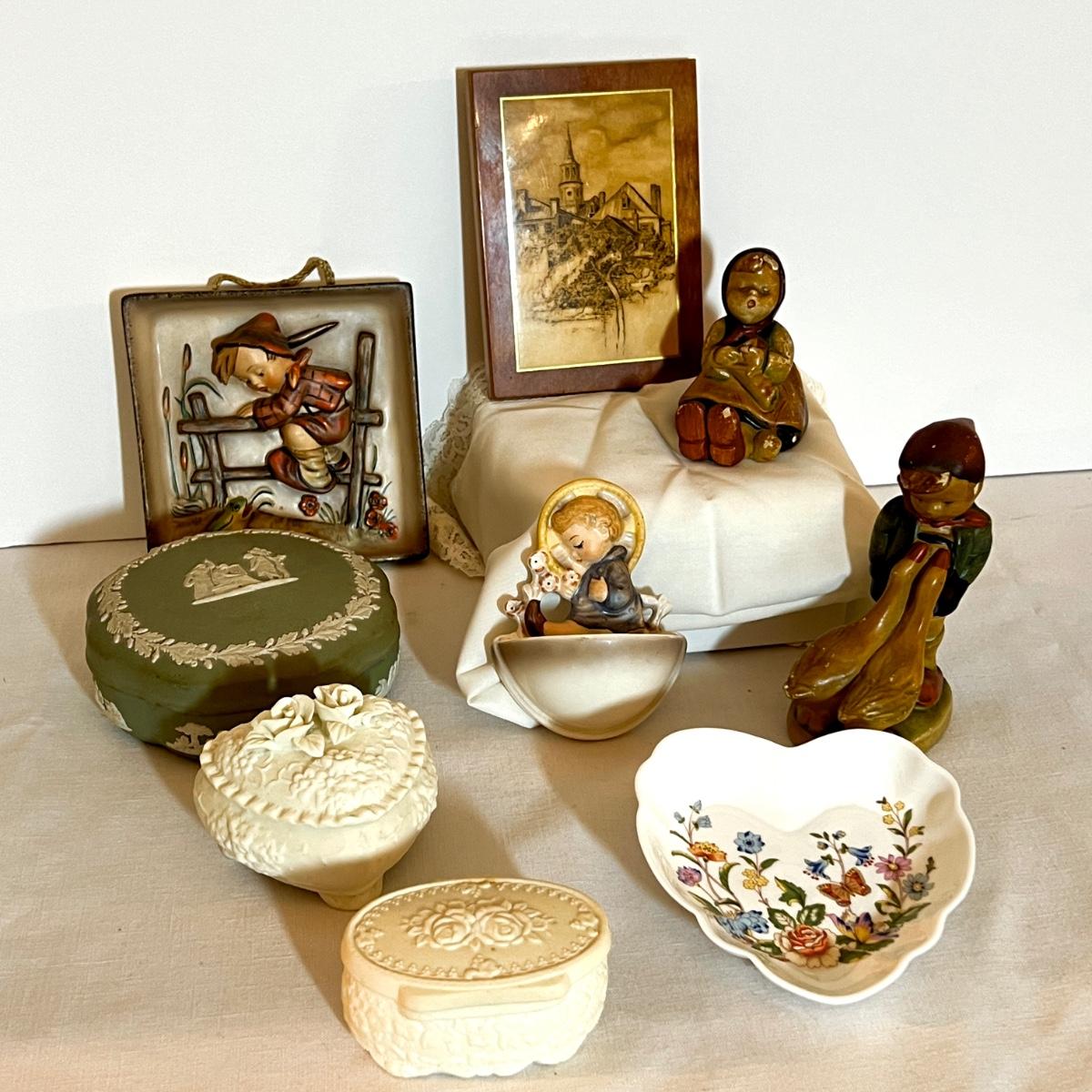 Lovely collection of collectibles including 2 authentic Hummel pieces as well as 2 reproduction Hummels. The heart dish is Aynsley, the Jasperware trinket bowl with top is signed.