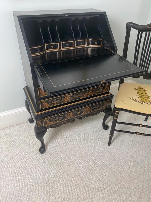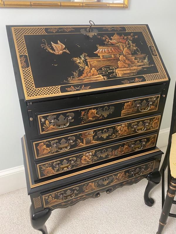 I - 799 Oriental Lacquered Black and Gold Painted Chinoiserie Style Slant Front Ladies Desk