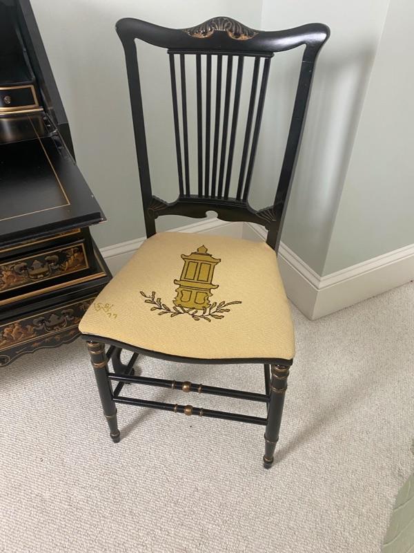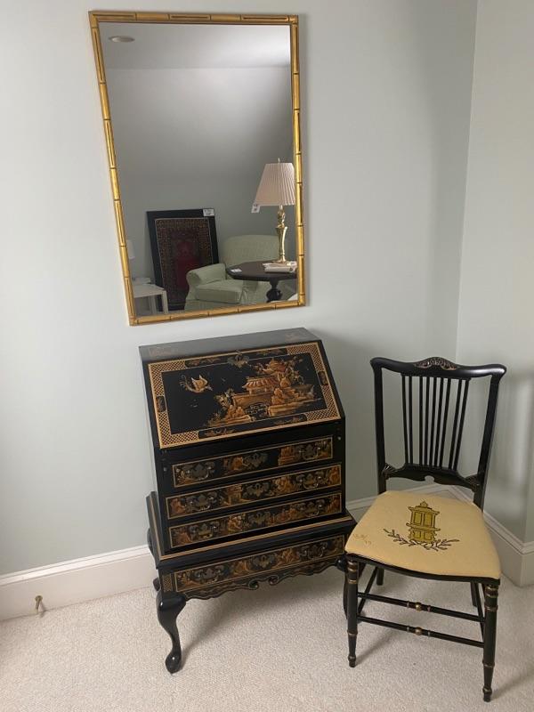 Oriental Lacquered Black and Gold Painted Chinoiserie Style Slant Front Ladies Desk with Black Needlepoint Chair & Gold Bamboo Style Wall Mirror.
