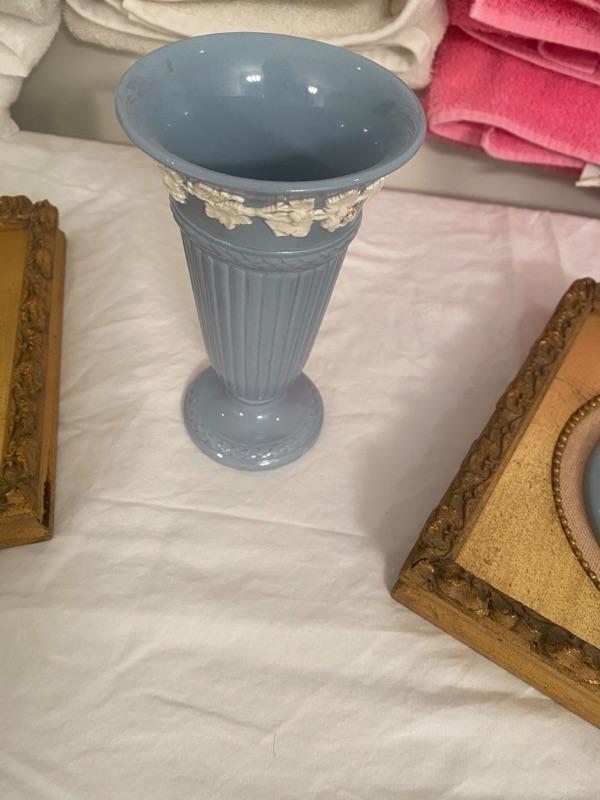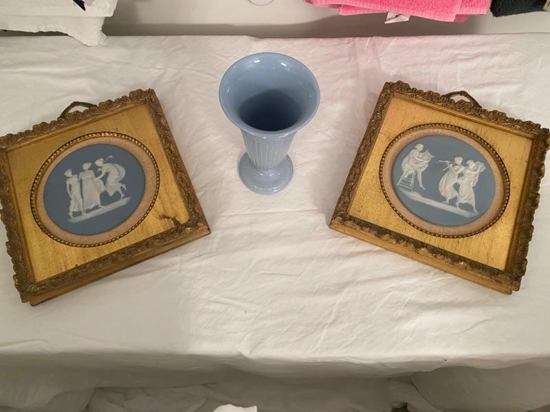 I - 812 Pair of Blue and White Framed Jasperware Plaques & Wedgwood Vase