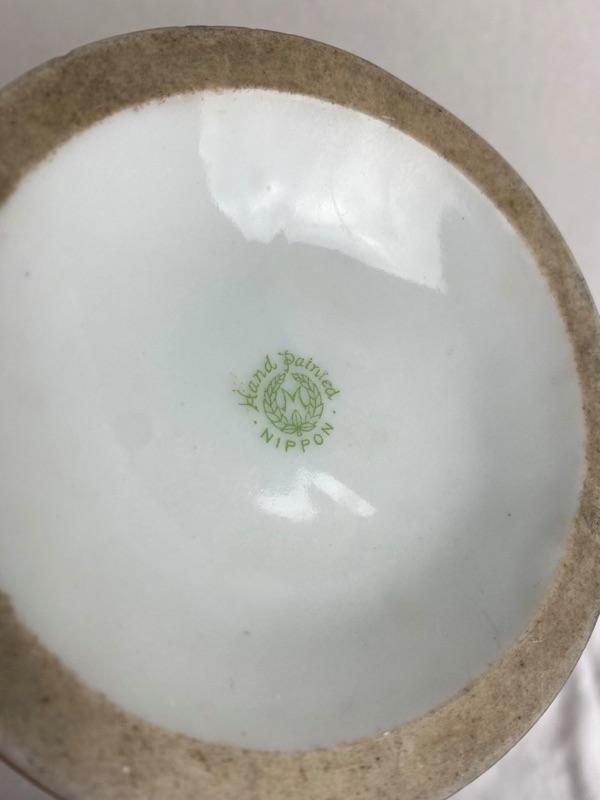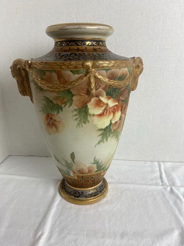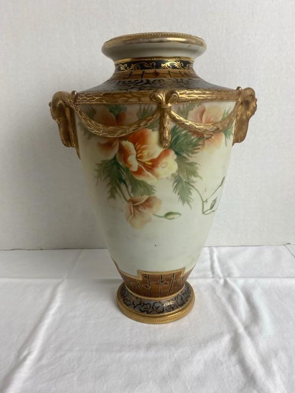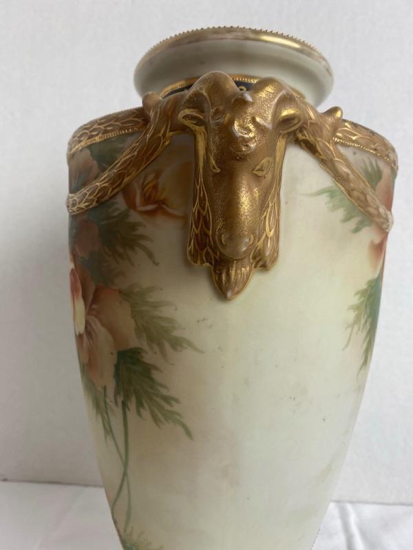 I - 903 Vintage Hand Painted Nippon Floral Gold Ramshead Handle Vase