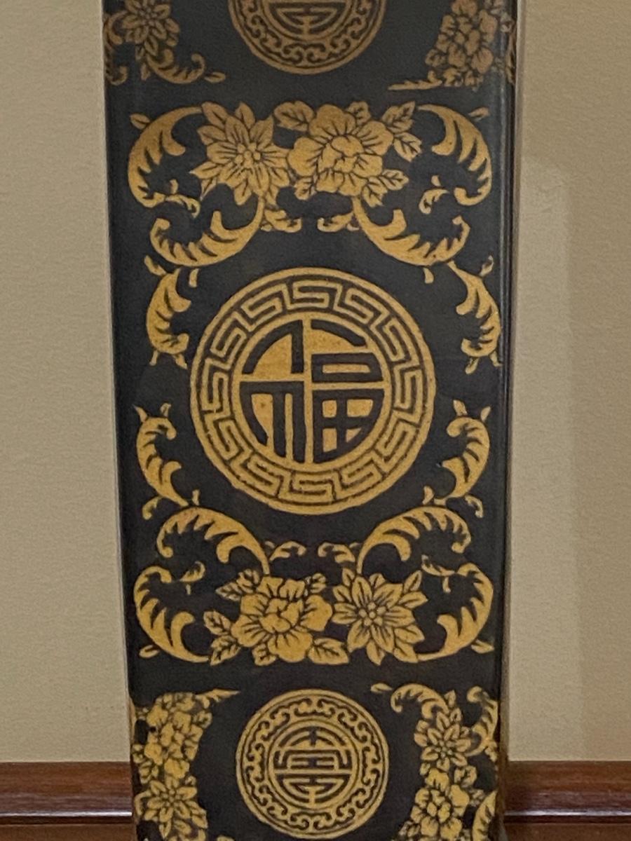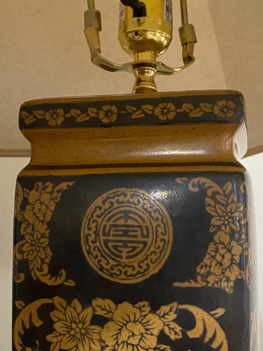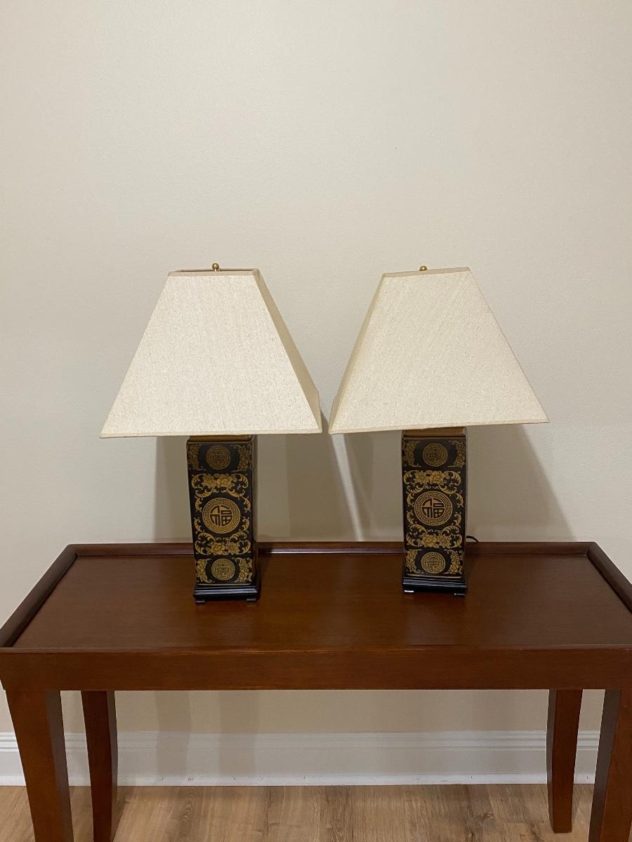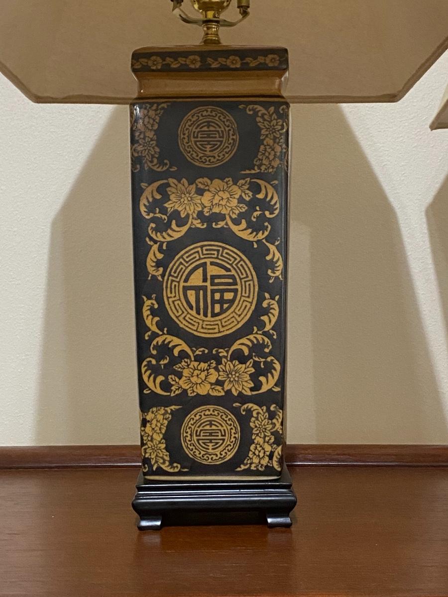 Pair of Black & Gold Porcelain Oriental 2-Way Lamps with Cream Shades
