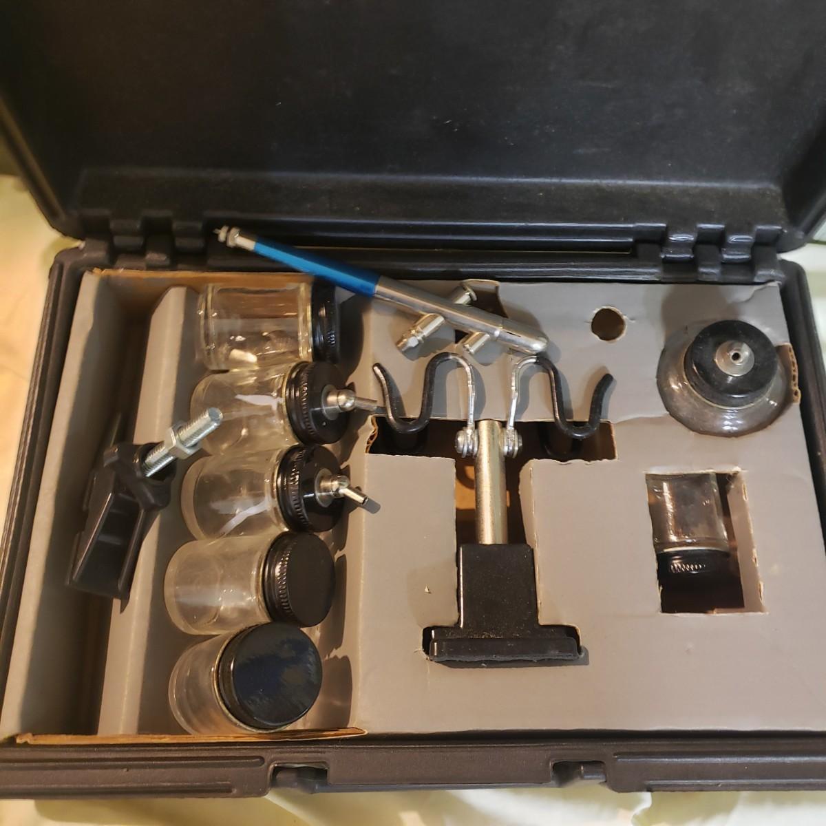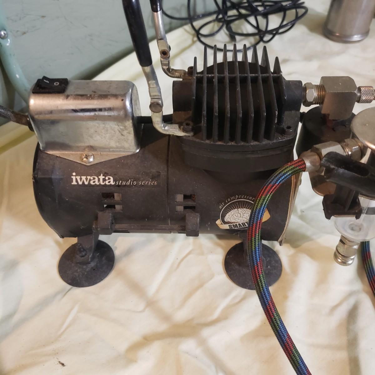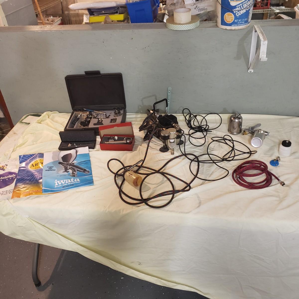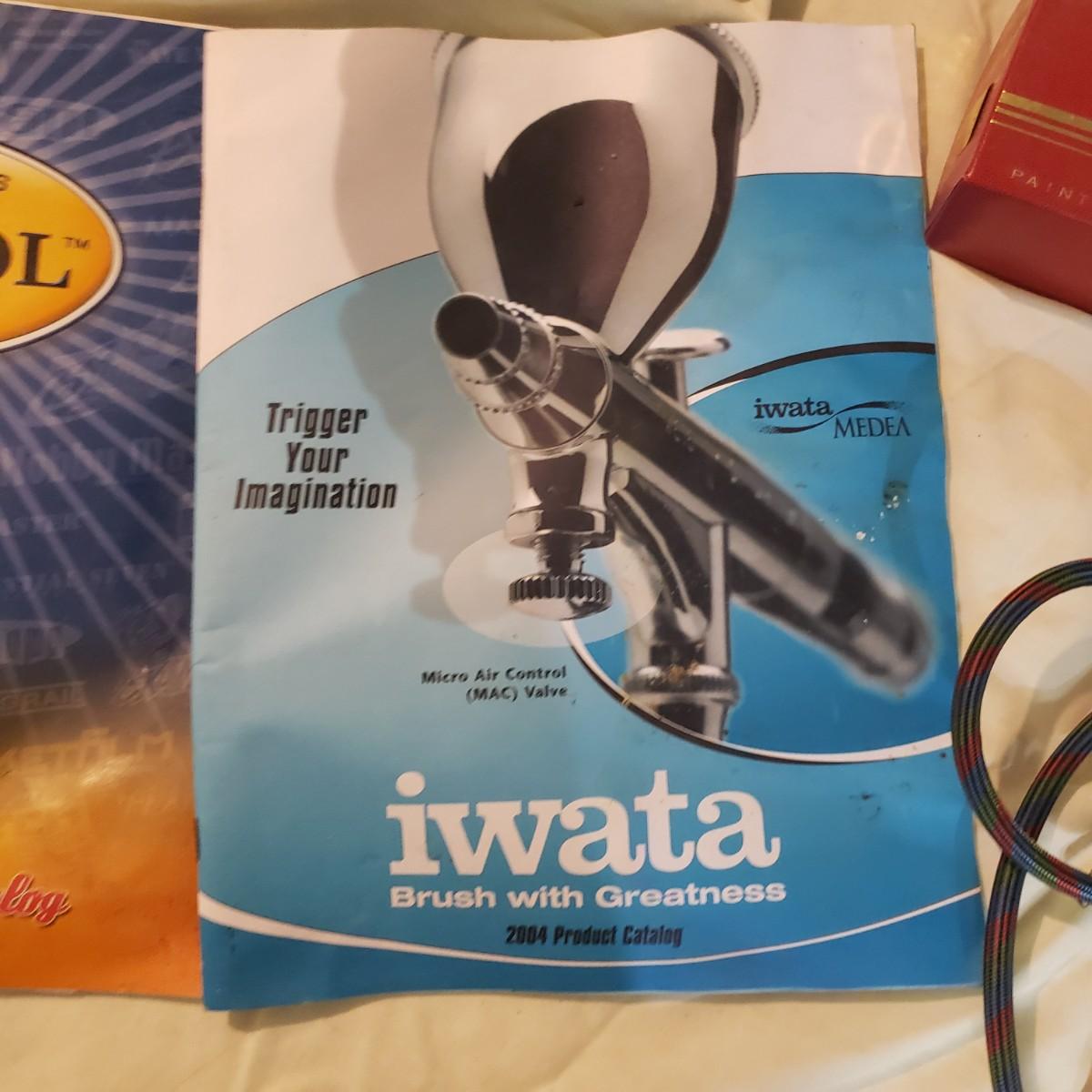 This is an Iwata air brush with many accessories. The Iwata machine measures 7" x 11" x 9"H. It comes with Omni tip, Beugler paint pinstripe tools Badger Basic Gift Set, model 200, extra hoses, spray bottles and containers. Three manuals are also included. See pictures for details.