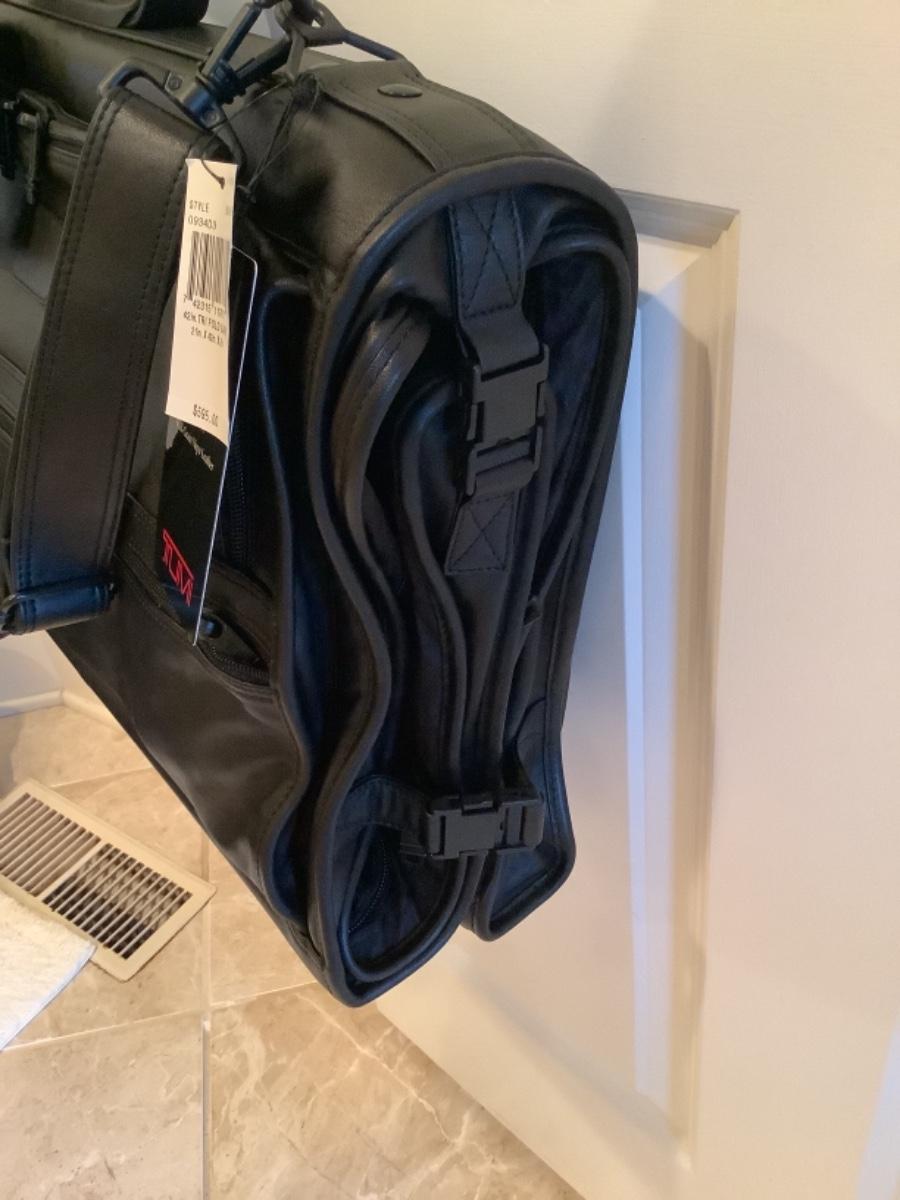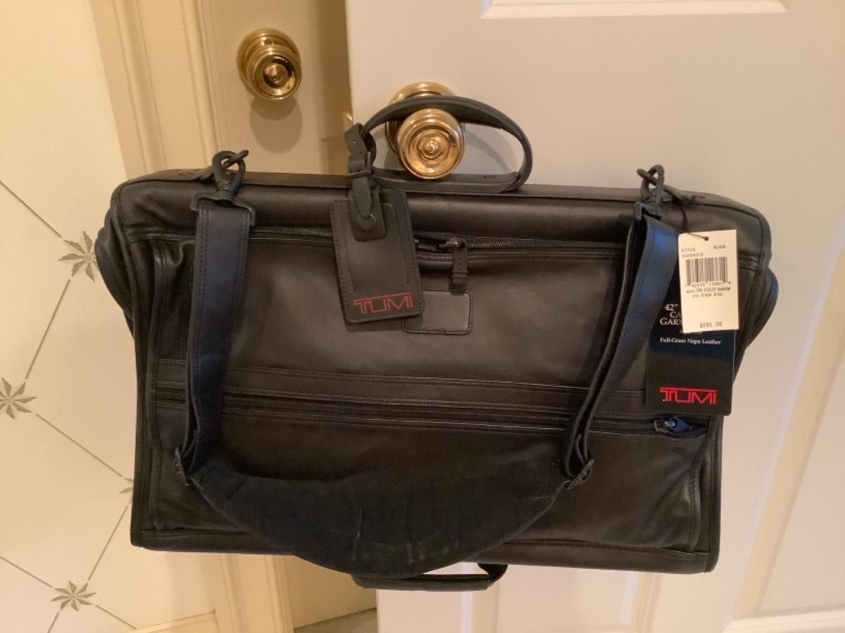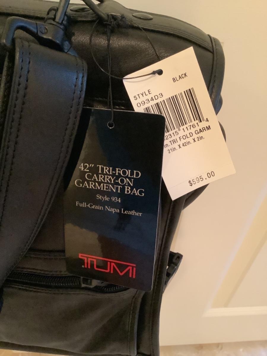 I1499 New with Tag 42” Trifold TUMI Carry on Black Leather Garment Bag