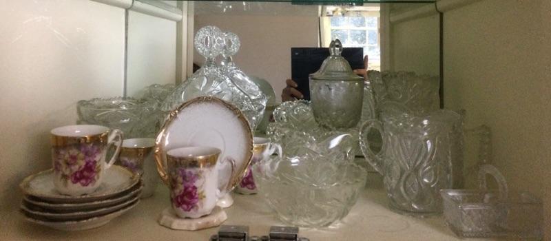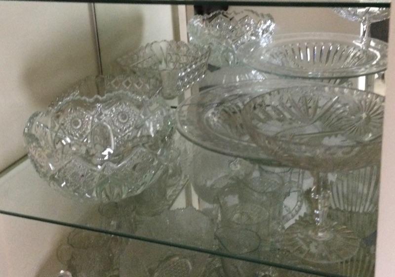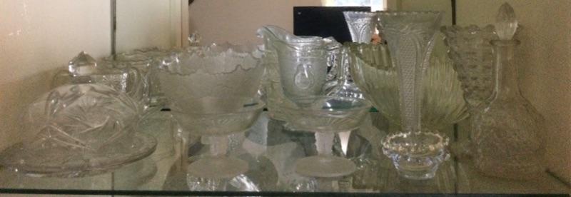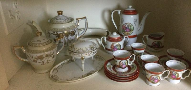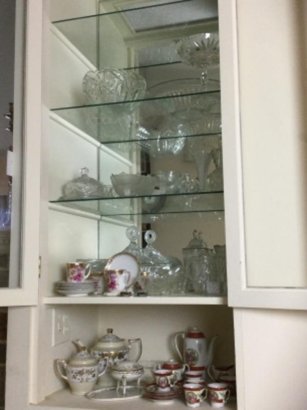 Vintage pressed glasss items. Hand painted Nippon footed sugar bowl with lid and small serving plate. J.B. Betson 15 piece hand painted tea set. Tea pot and sugar bowl hand painted Japan