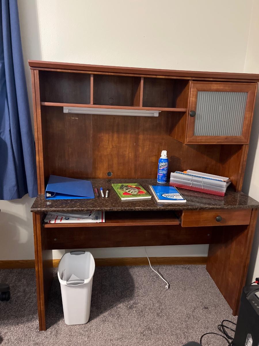 See pics desk is 47.5” w x 19.5”d x 30” h. Top piece 13”d x 27”h