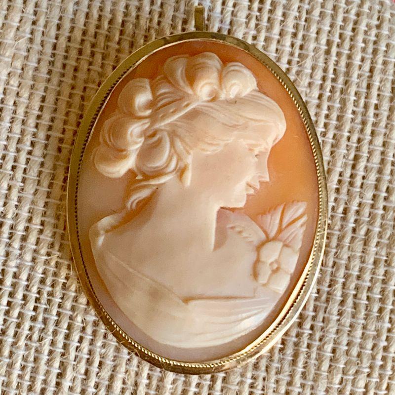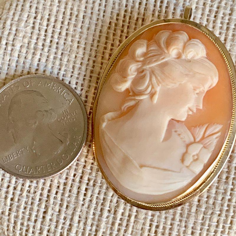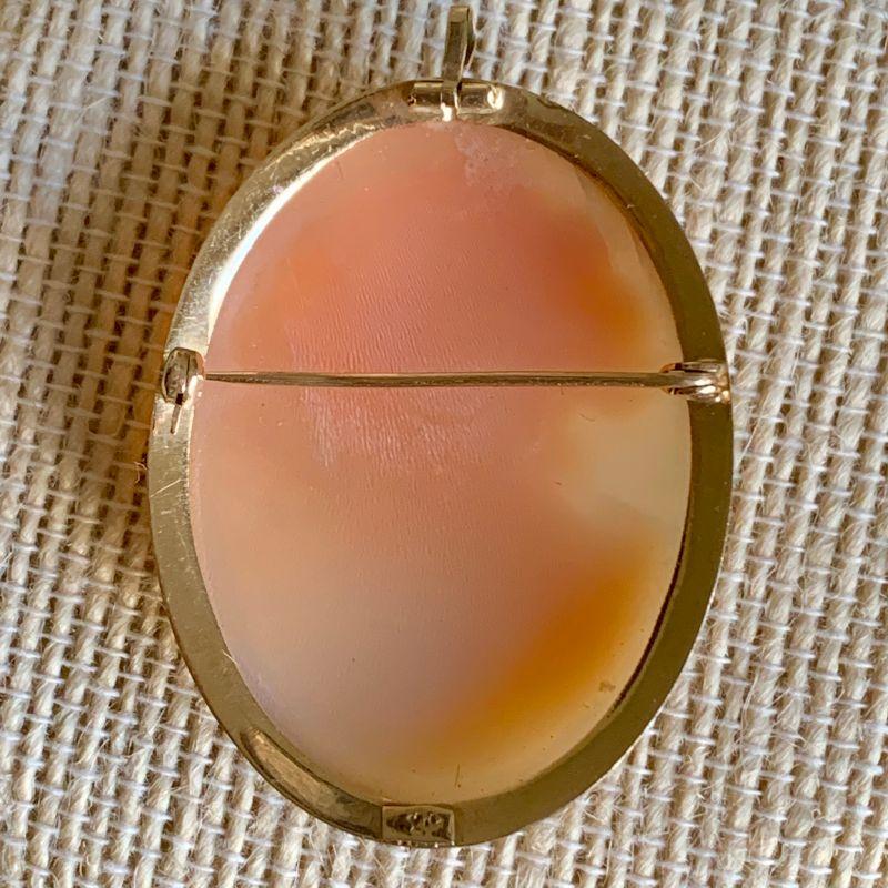 Well carved, shell cameo, right facing, neoclassical lady with an elaborate hair style. Set in a 14K bezel. Can be worn as a brooch or a pendant. 1 3/4" x 1 1/4" Foreign touch mark, tests 14K.