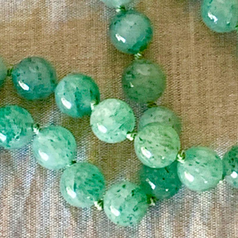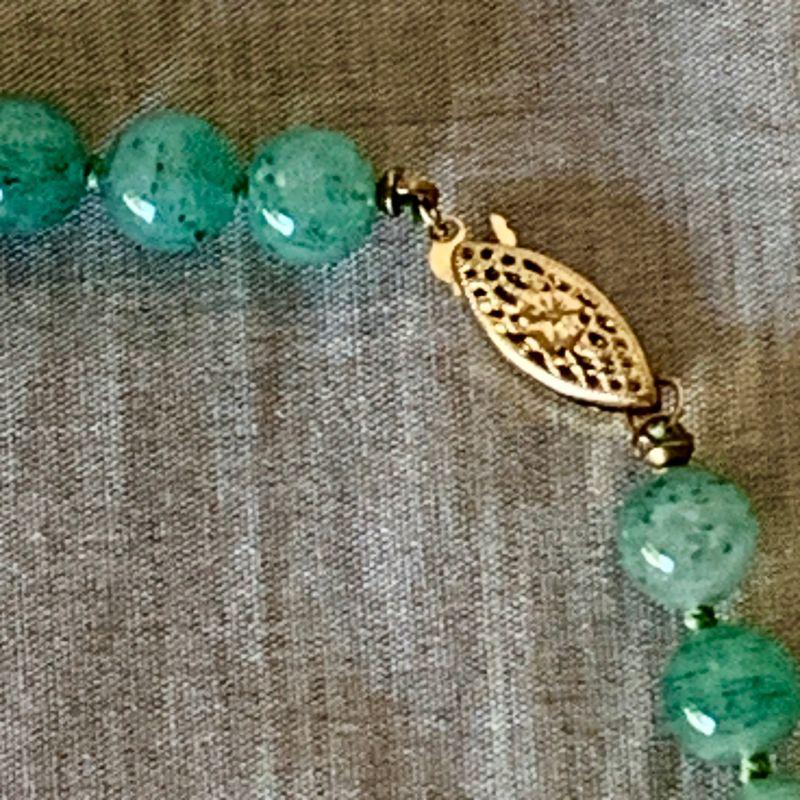 Strand of 24" hand knotted speckled jade green stone beads, 7.5 mm, with a 14K yellow gold clasp. Tests 14K