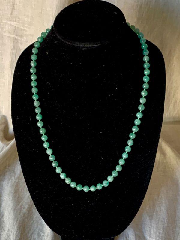IB 104 NECKLACE OF SPECKLED JADE GREEN BEADS 14K CLASP