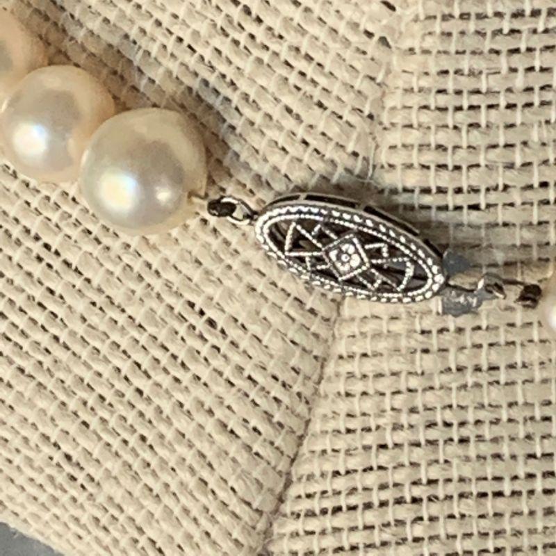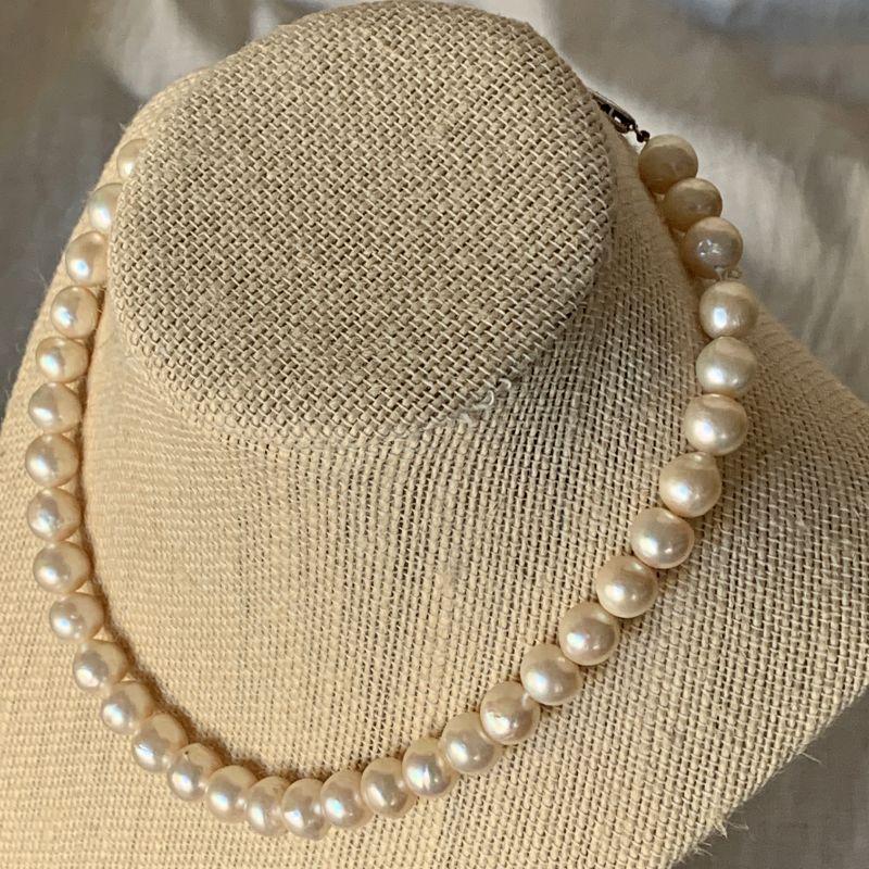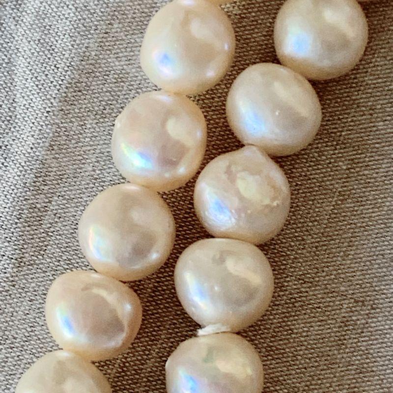 14" long necklace of poorly strung beautiful 9mm baroque pearls. 14K gold clasp.