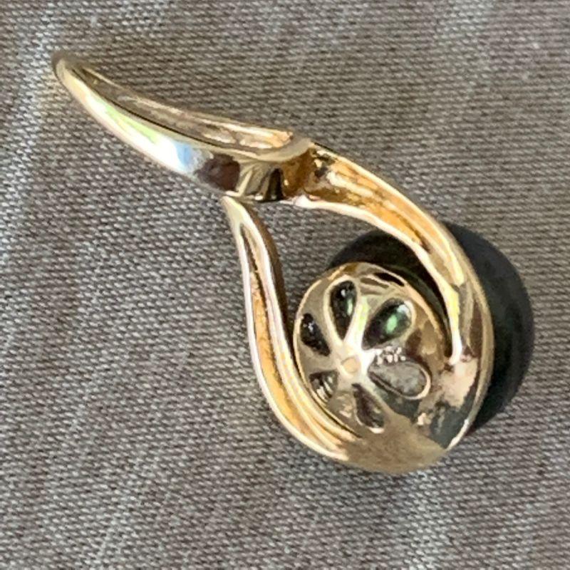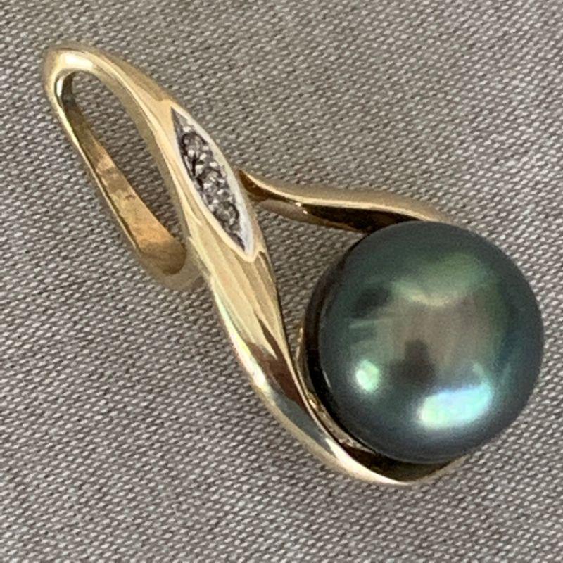A large South Seas Tahitian black pearl set in 14K pale yellow gold fish hook shape, accented by 3 tiny diamonds Large pearl is 12-13mm. Round shape, but with an imperfection, visible when viewed under magnification, there is a dimple towards the very bottom of the pearl. There is also a ripple just above the mounting. 1 1/8" x 3/8"