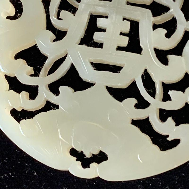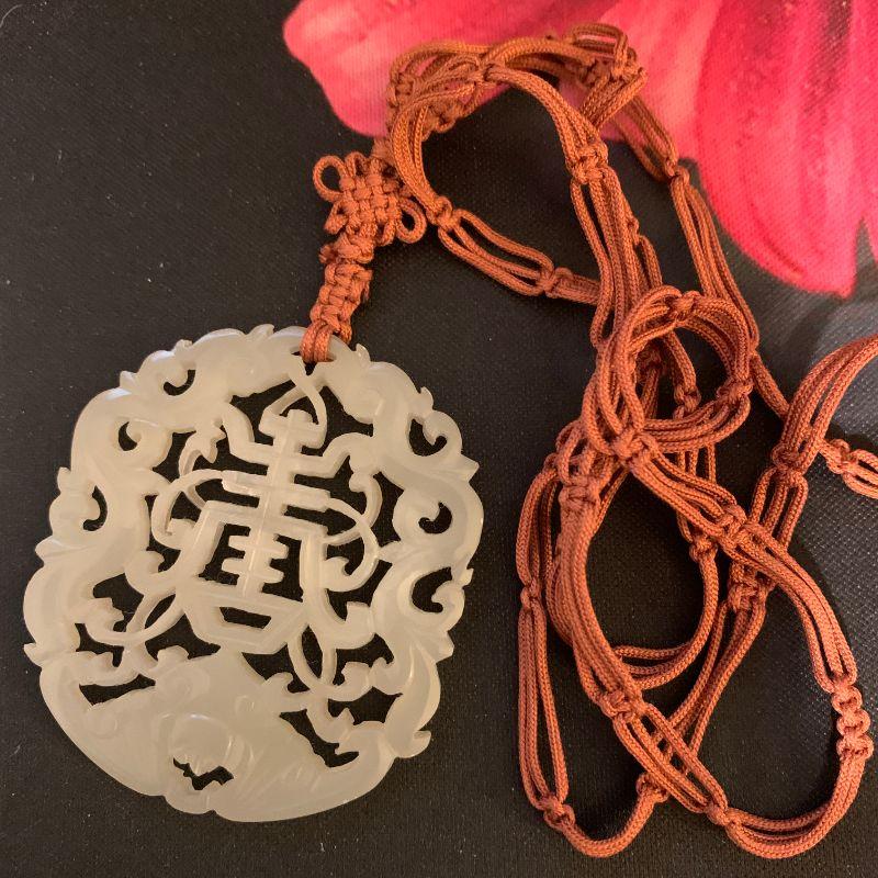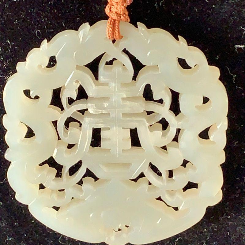Chinese export, carved white jade pendant, with bat image & good luck symbols. Commercially made for export. Hand knotted silk cord. Jade measures 2 1/4" x 2"