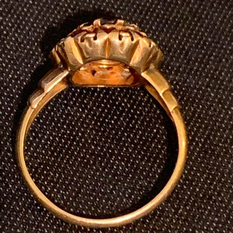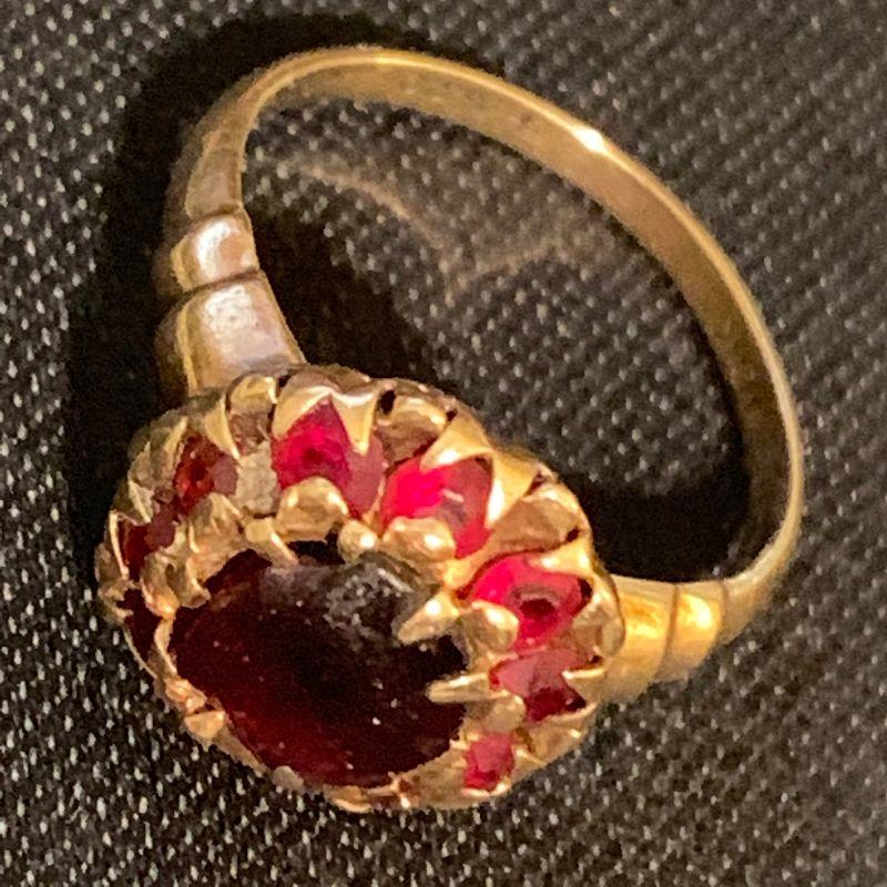 Very worn stone. Garnet surrounded by tiny red glass stones, set in 10K gold. Marked 10K and tests as marked. The garnet is worn down & chipped. The mounting does not show wear. Size 5