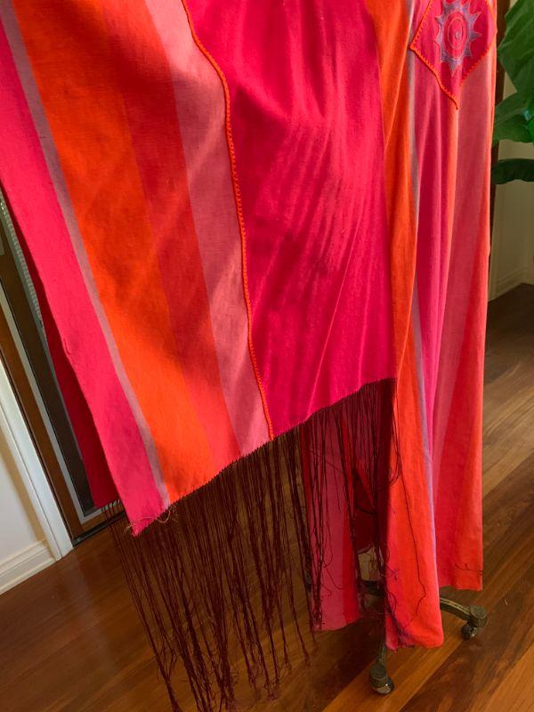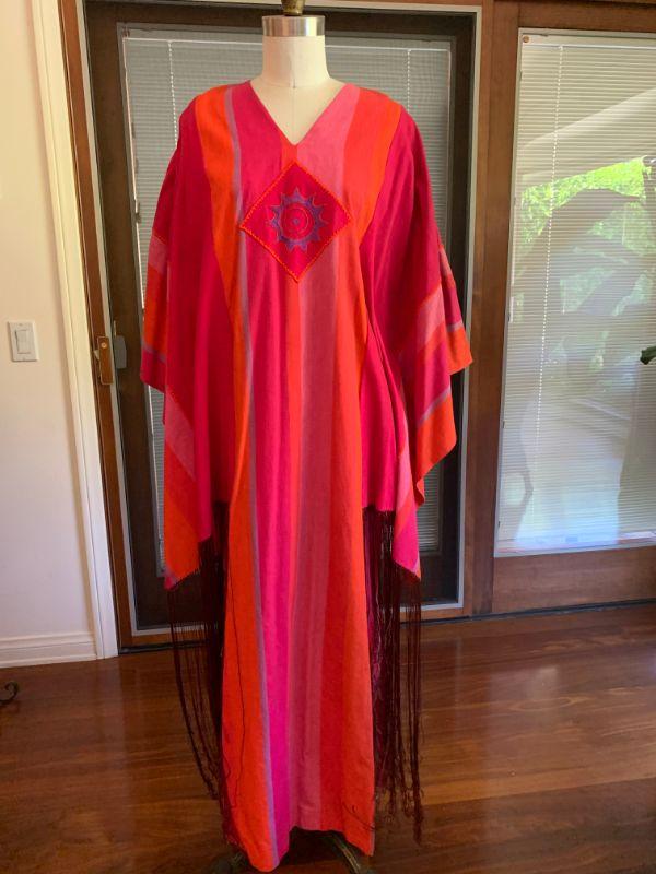 Vintage caftan. Made in Mexico by Josefa. Bright orange/purple and fushia, long kimono sleeve trimmed with long fringe! Appliqued embroidered square in the middle of the bodice. Straight skirt. Size S.