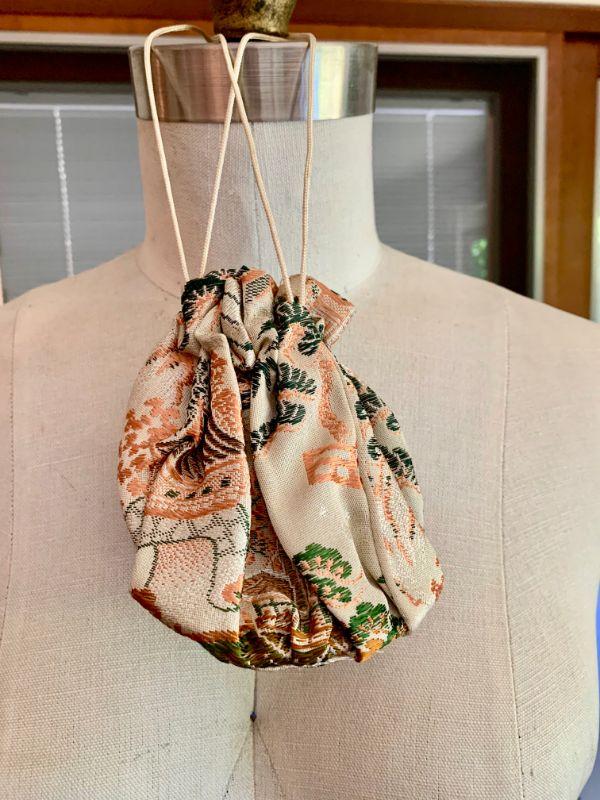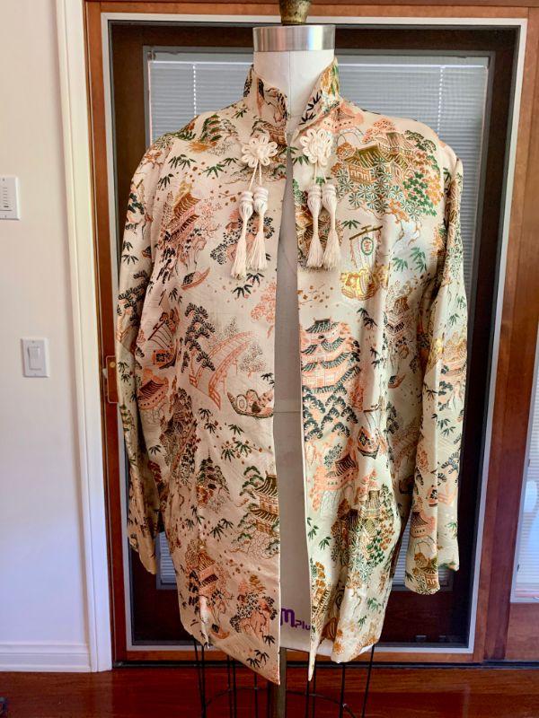 Vintage Asian jacket, traditional designs on a light beige background, Mandarin collar, frog closures. Comes with a matching small drawstring pouch. Size L. Good condition.