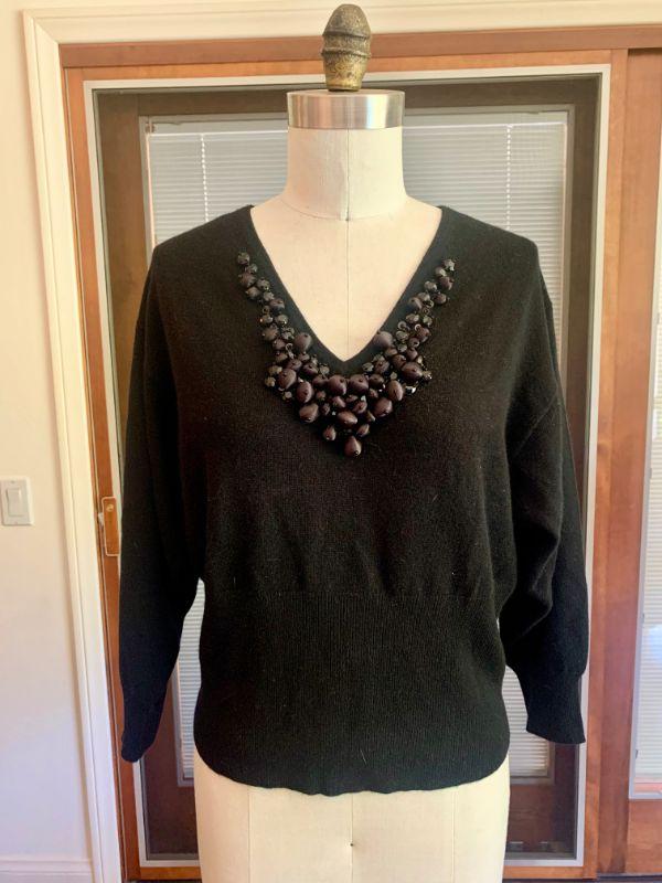 Saks Fifth Ave cashmere sweater. Long sleeve V neck. Satin & beaded dingle balls at the neckline. Size L No holes.