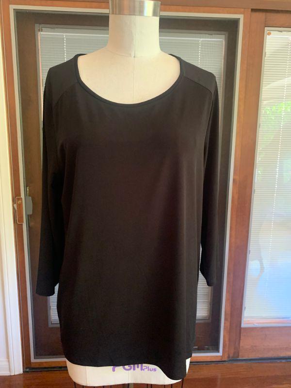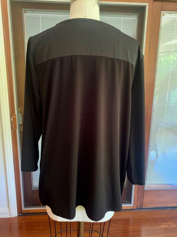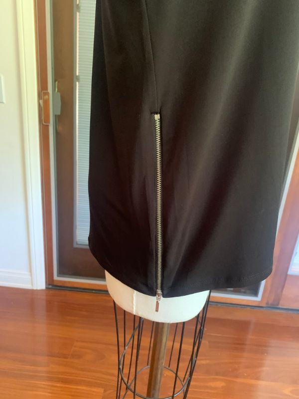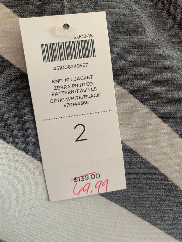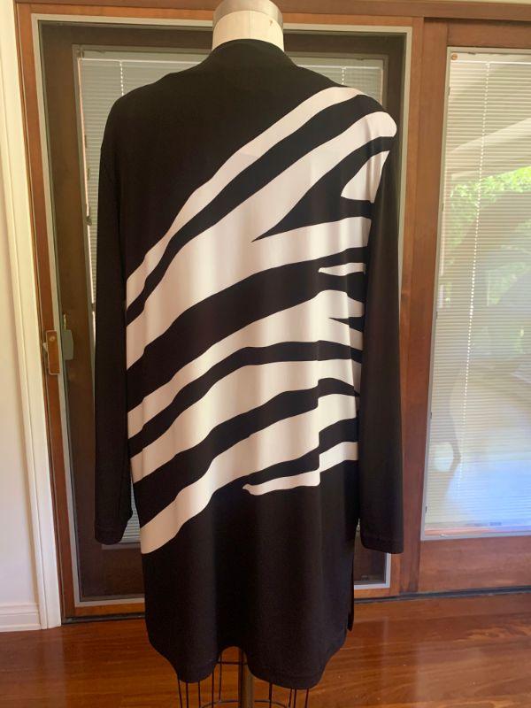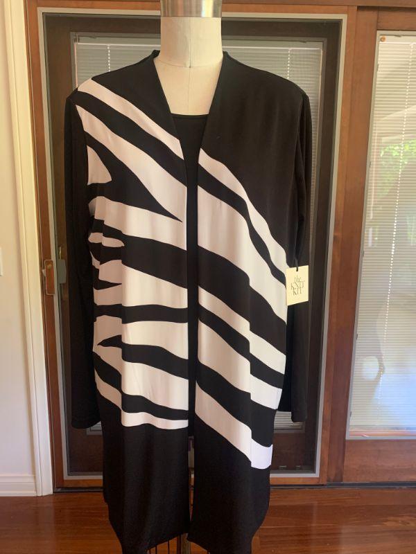 Bold zebra pattern on black long jacket with side zippers. Plain black top. Original tags. Size 2