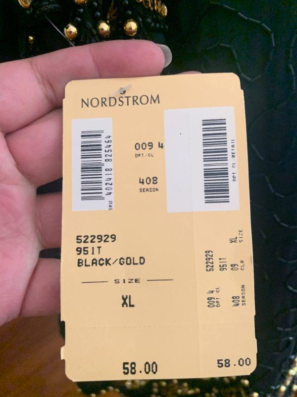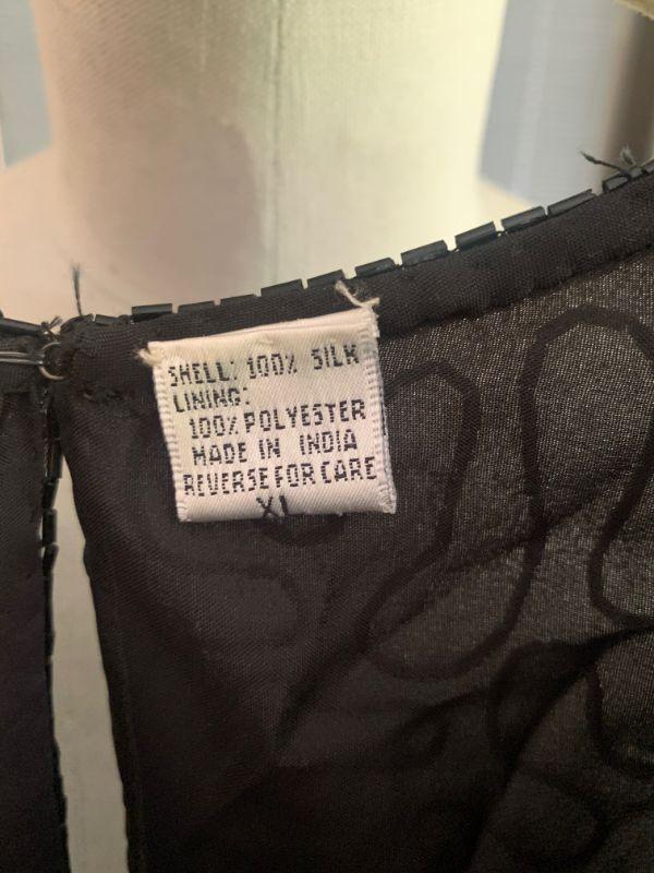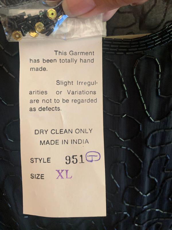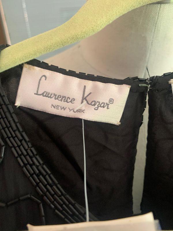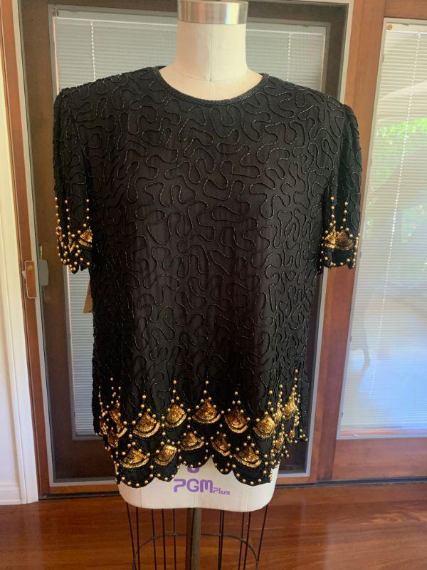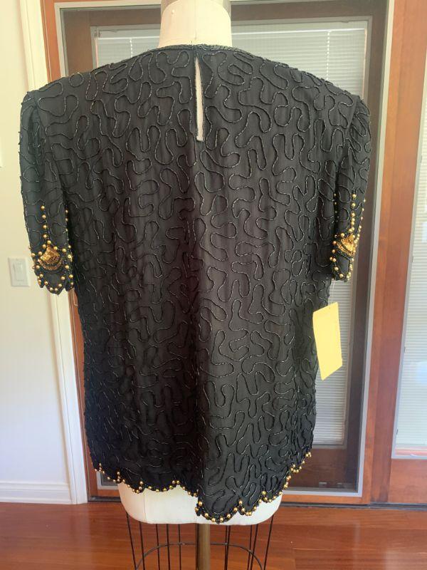 Norstrum's tag. Vintage evening top by Lawrence Kazar, New York Black top with black beads and gold sequin trim. Size XL